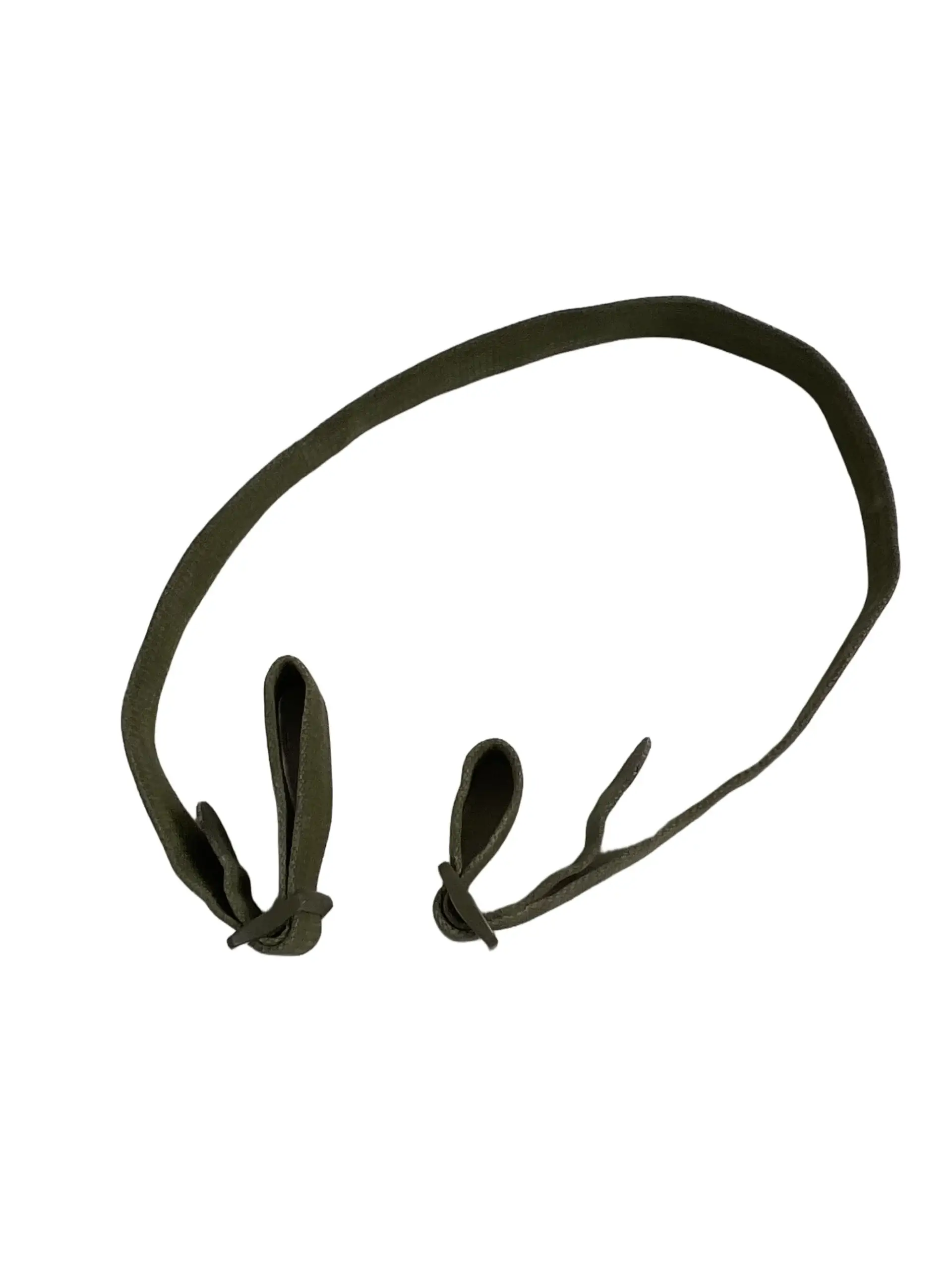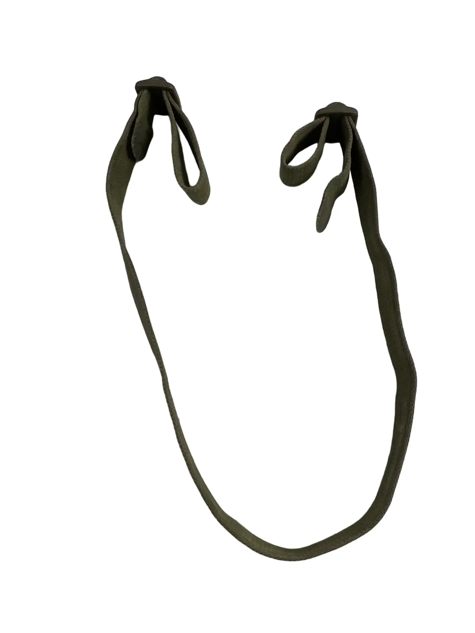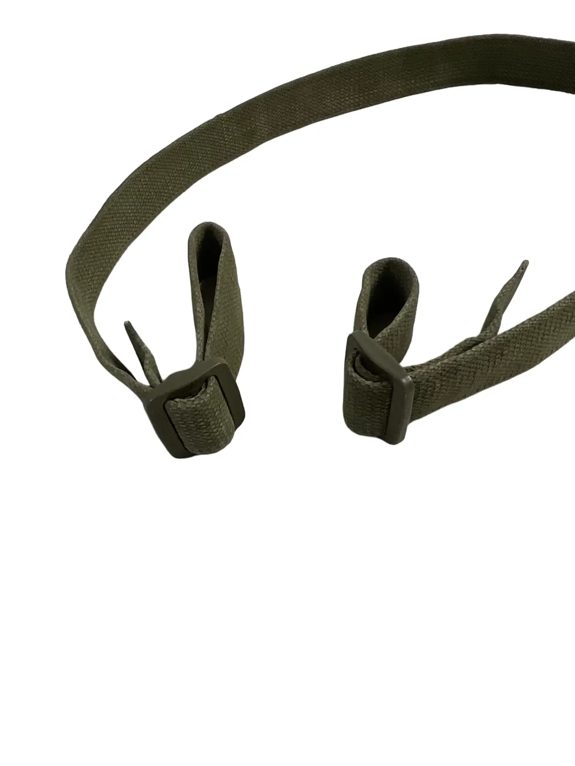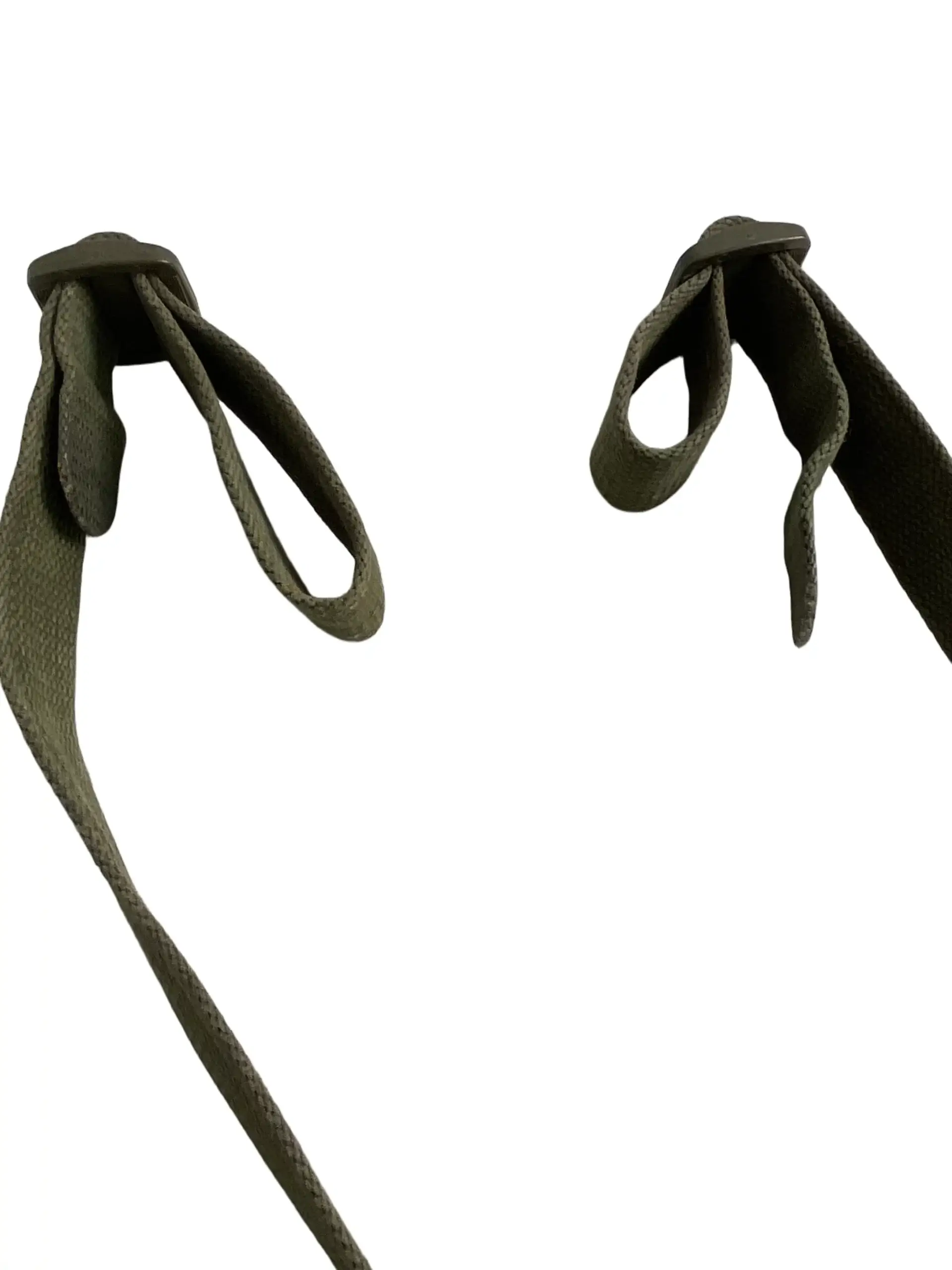 The Canadian Forces FN C1 OD Green Sling with Plastic Buckles is a standard-issue rifle sling used by members of the Canadian military. Designed specifically for the FN C1 service rifle, this sling is constructed from durable olive drab (OD) green webbing material, intended to withstand field use in various environments. The sling measures approximately 43 inches in length and 1.25 inches in width, providing stable support for carrying and stabilizing the rifle during transport and shooting. It features injection-molded plastic hardware, including the buckles and adjustment fittings, which offer a secure hold while reducing overall weight compared to metal counterparts. The sling can be easily attached to the rifle via its looped ends, suitable for the standard sling swivels found on the FN C1. This type of sling was widely issued to Canadian military personnel from the 1950s through the 1980s and remains a representative accessory of the era.