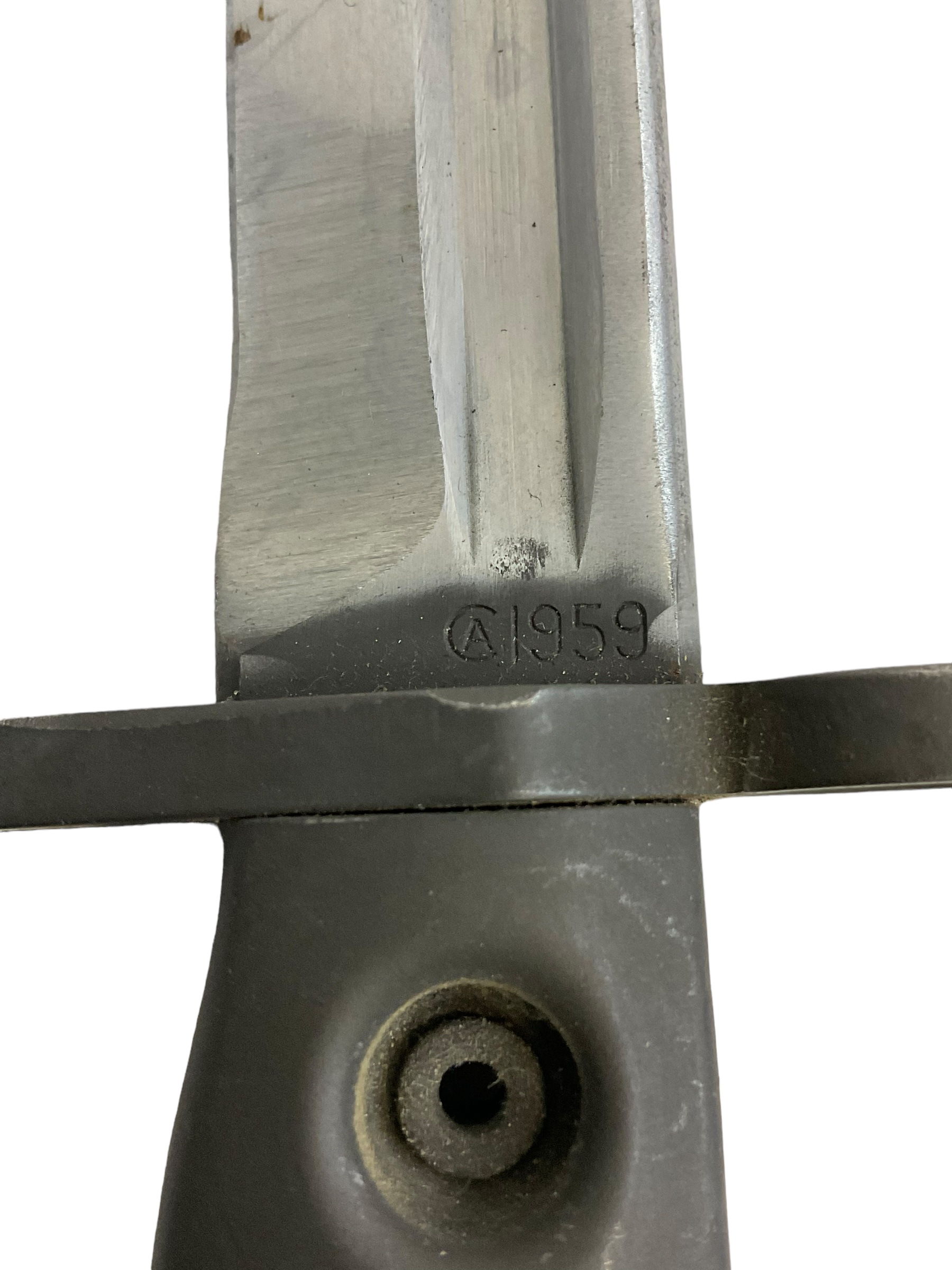 This vintage Canadian Forces FNC1 Bayonet, dated 1959, is a remarkable piece of military history. It has been meticulously preserved and comes complete with its original scabbard and frog. The FNC1 bayonet, recognized for its sturdy construction and reliable performance, was an essential tool for Canadian soldiers. The blade remains in good condition, bearing the marks of time but retaining its sharp edge. The scabbard is crafted from high-quality materials, offering durable protection for the blade. The accompanying frog, used to attach the scabbard to a utility belt, is likewise in excellent condition, showcasing the practical design used by military forces. This historical item not only serves as a testament to mid-20th century military craftsmanship but also as a collectible artifact for enthusiasts and historians alike. Owning this bayonet is like holding a piece of Canadian military heritage in your hands.