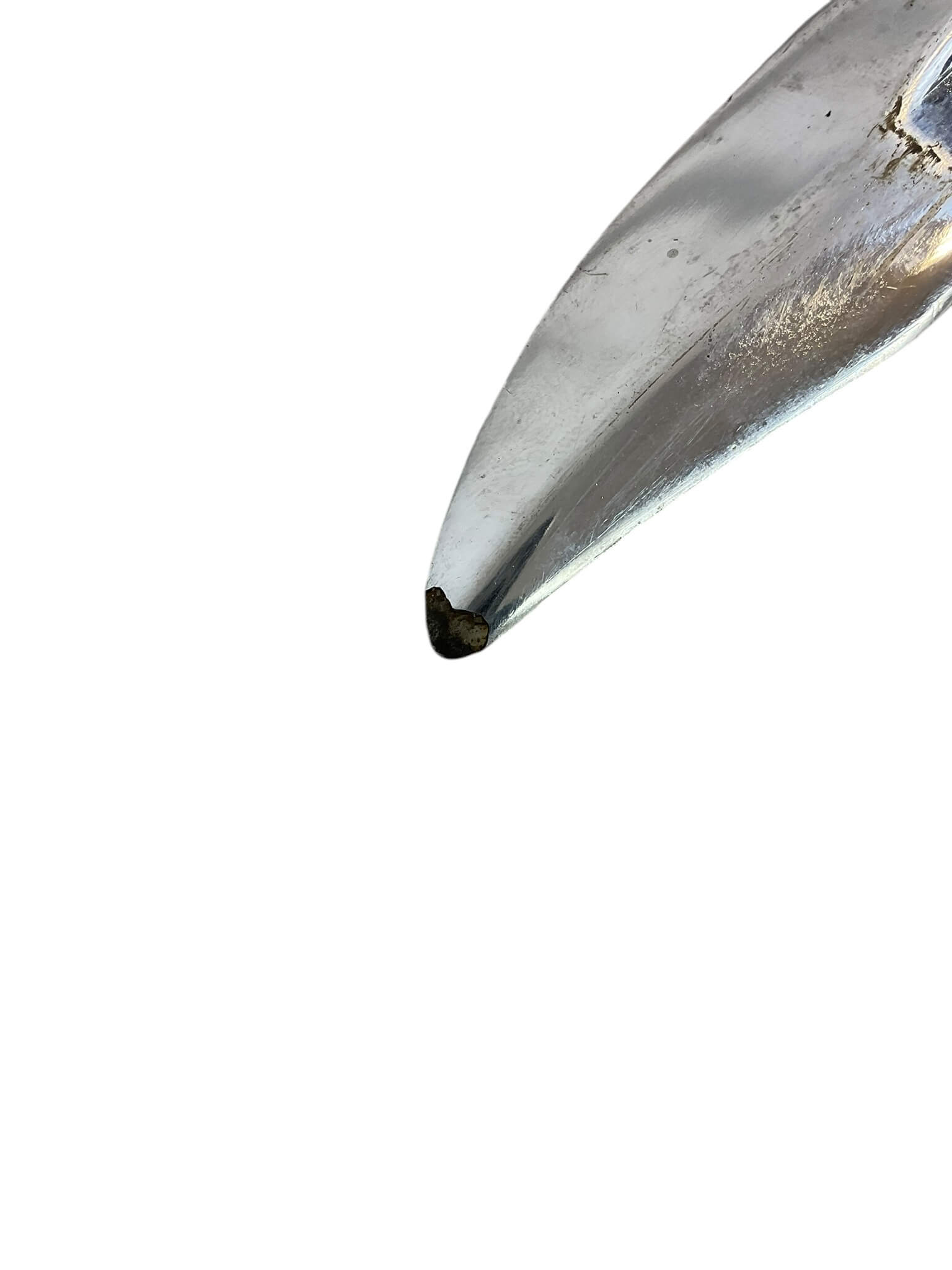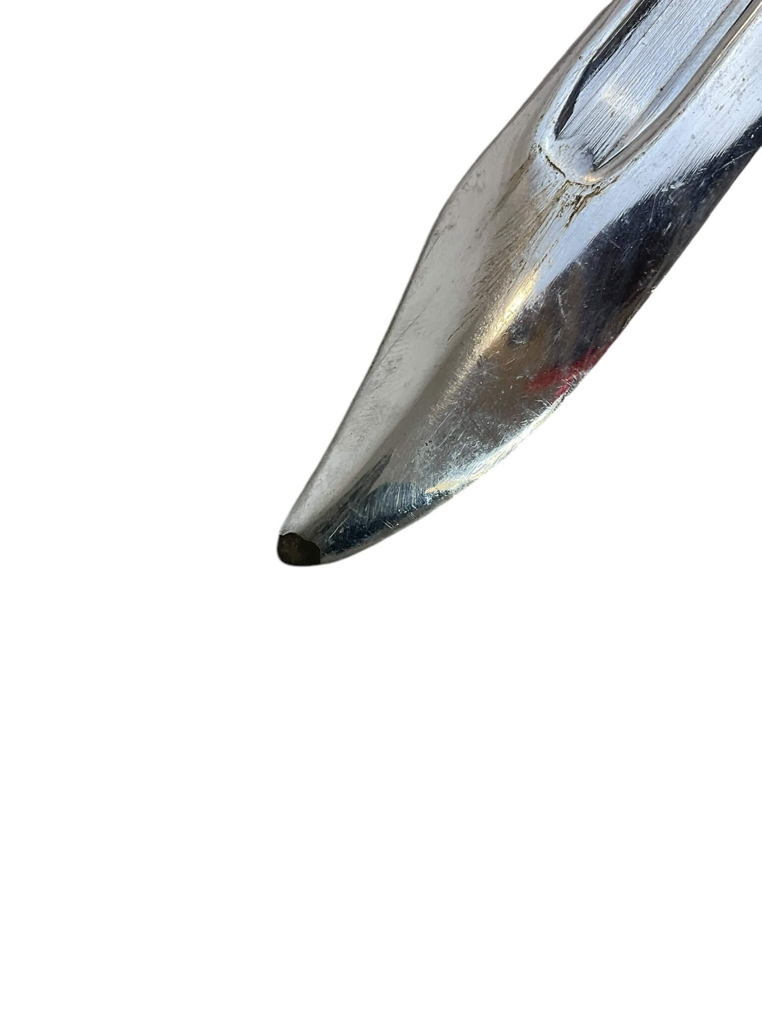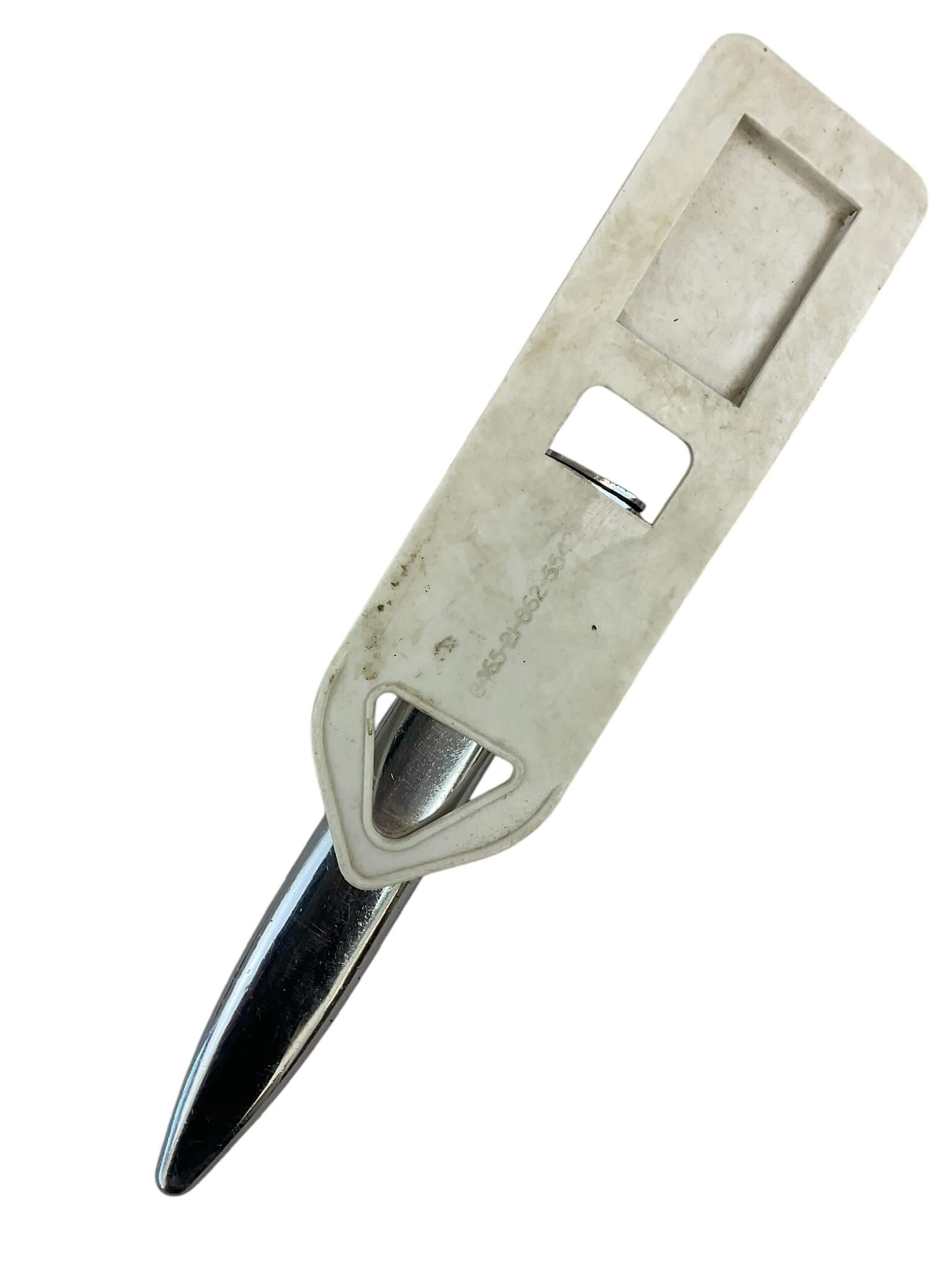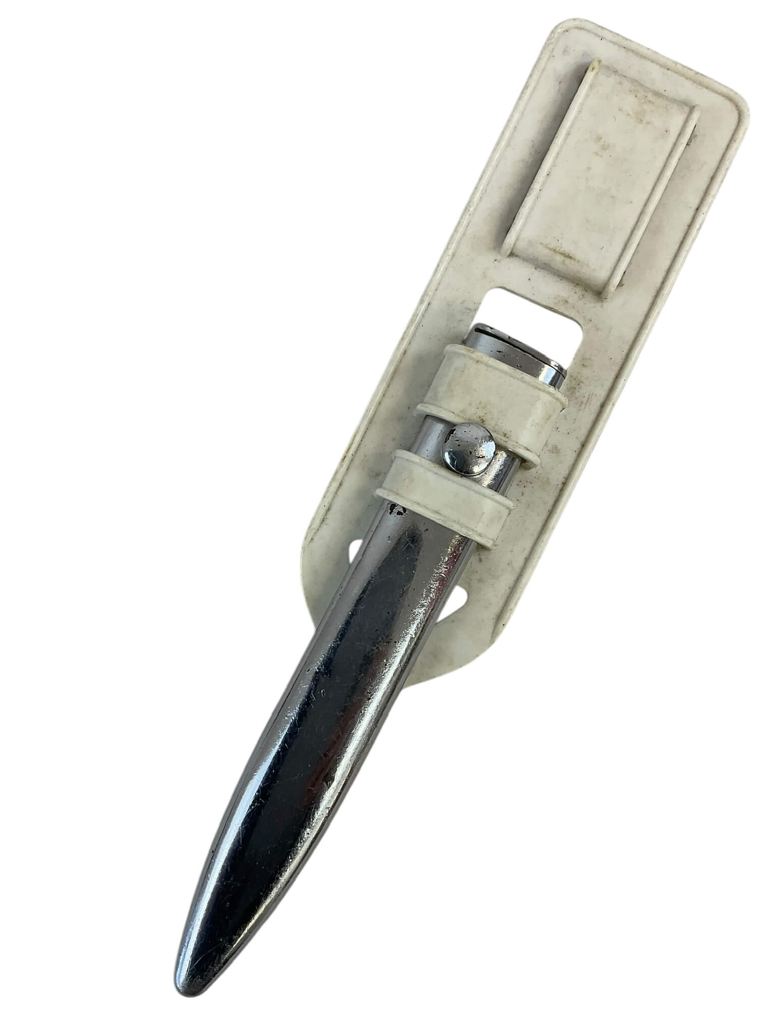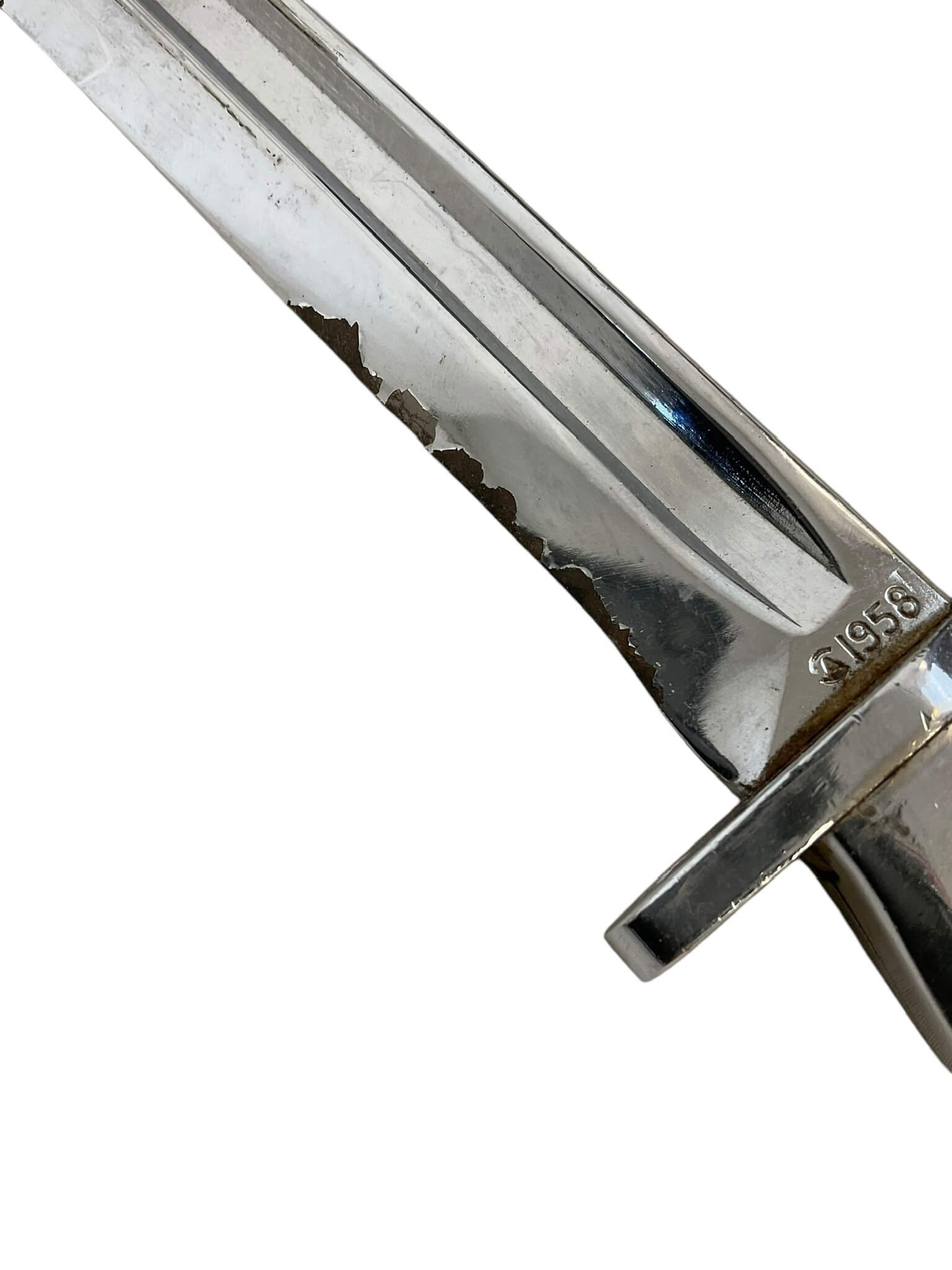 The ‘Canadian Forces FNC1 Bayonet with White Plastic Frog Plated’ is a unique piece of military history. This Canadian Army standard-issue bayonet is designed to fit the FN C1 rifle, widely used by the Canadian military during the 20th century. The bayonet features a sturdy, sharp-edged blade, made for both combat and utility purposes. Its distinctive characteristic is the white plastic ‘frog’ – the part that attaches the sheath to a belt – giving it a striking appearance. The frog is plated for added durability and longevity, ensuring it can withstand the rigors of use. The bayonet is a testament to Canadian military heritage, making it a sought-after item for collectors, military enthusiasts or history buffs.