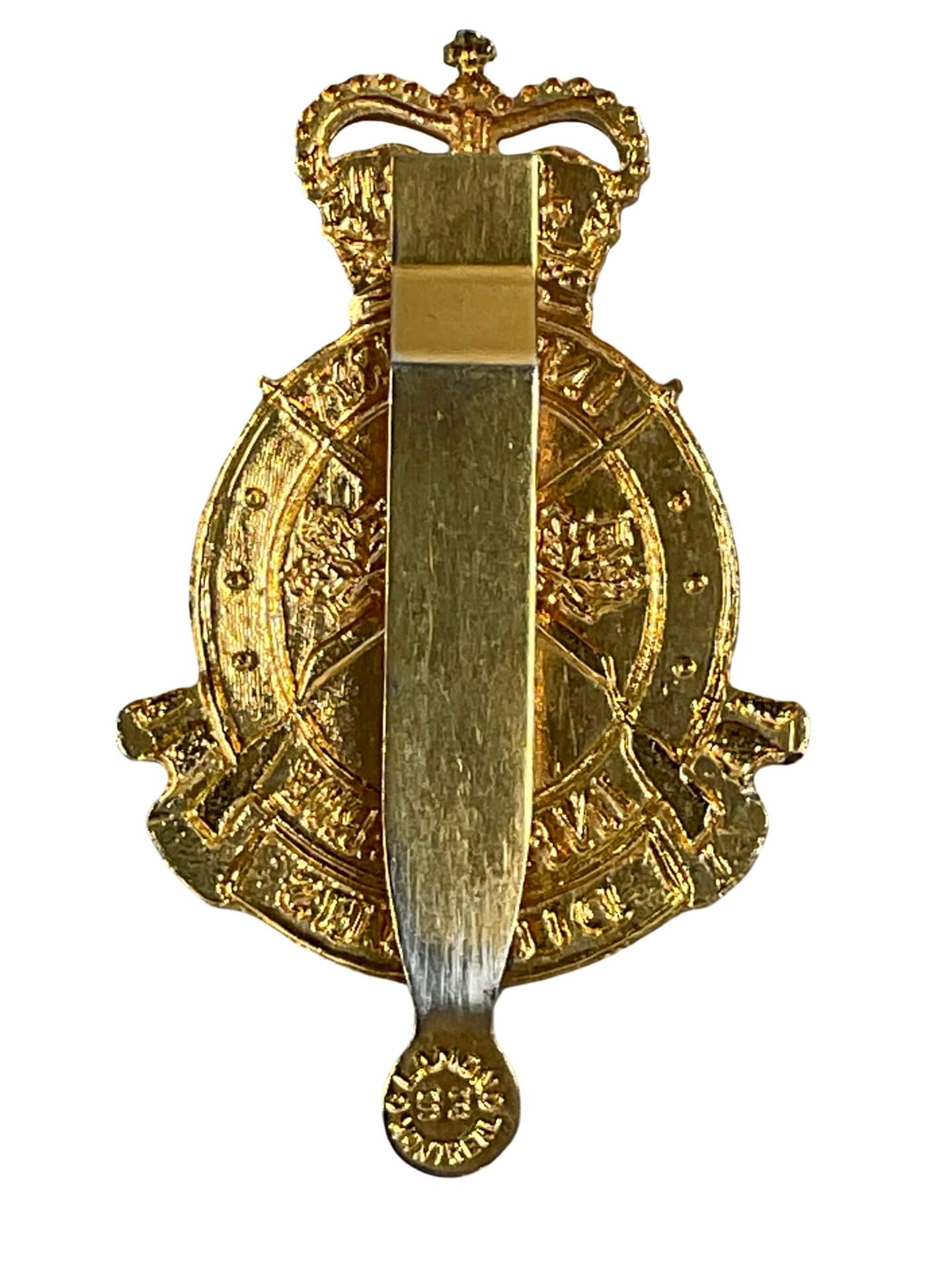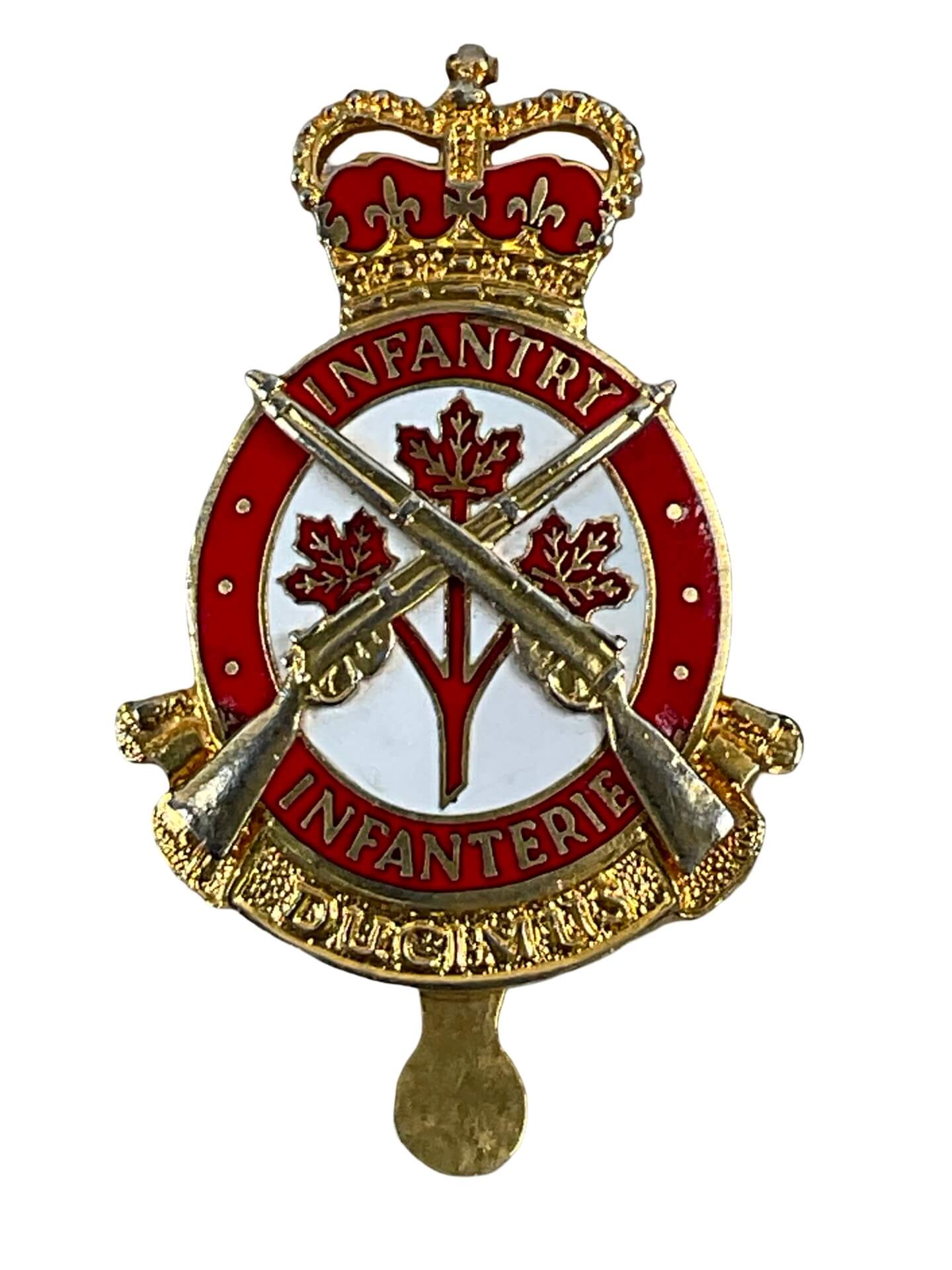 The Canadian Forces Infantry Corps Cap Badge is a distinctive insignia worn by members of the Canadian Infantry Corps. This badge typically features a gilded metal maple leaf surmounted by the St. Edward’s Crown, symbolizing service to Canada and allegiance to the monarchy. At the center, crossed rifles denote the infantry branch, with a banner inscribed “INFANTRY” positioned below. First authorized in 1947, the badge reflects the unification of Canadian infantry units under a single corps during the post-war era. It is commonly affixed to service dress headdress, such as berets or wedge caps. The design and materials have remained consistent, emphasizing durability and clarity of identification. This badge serves both as a mark of corps affiliation and as a part of Canadian military tradition. Its use remains regulated by uniform standards in the Canadian Armed Forces, and it is recognized as a symbol of infantry heritage and service.