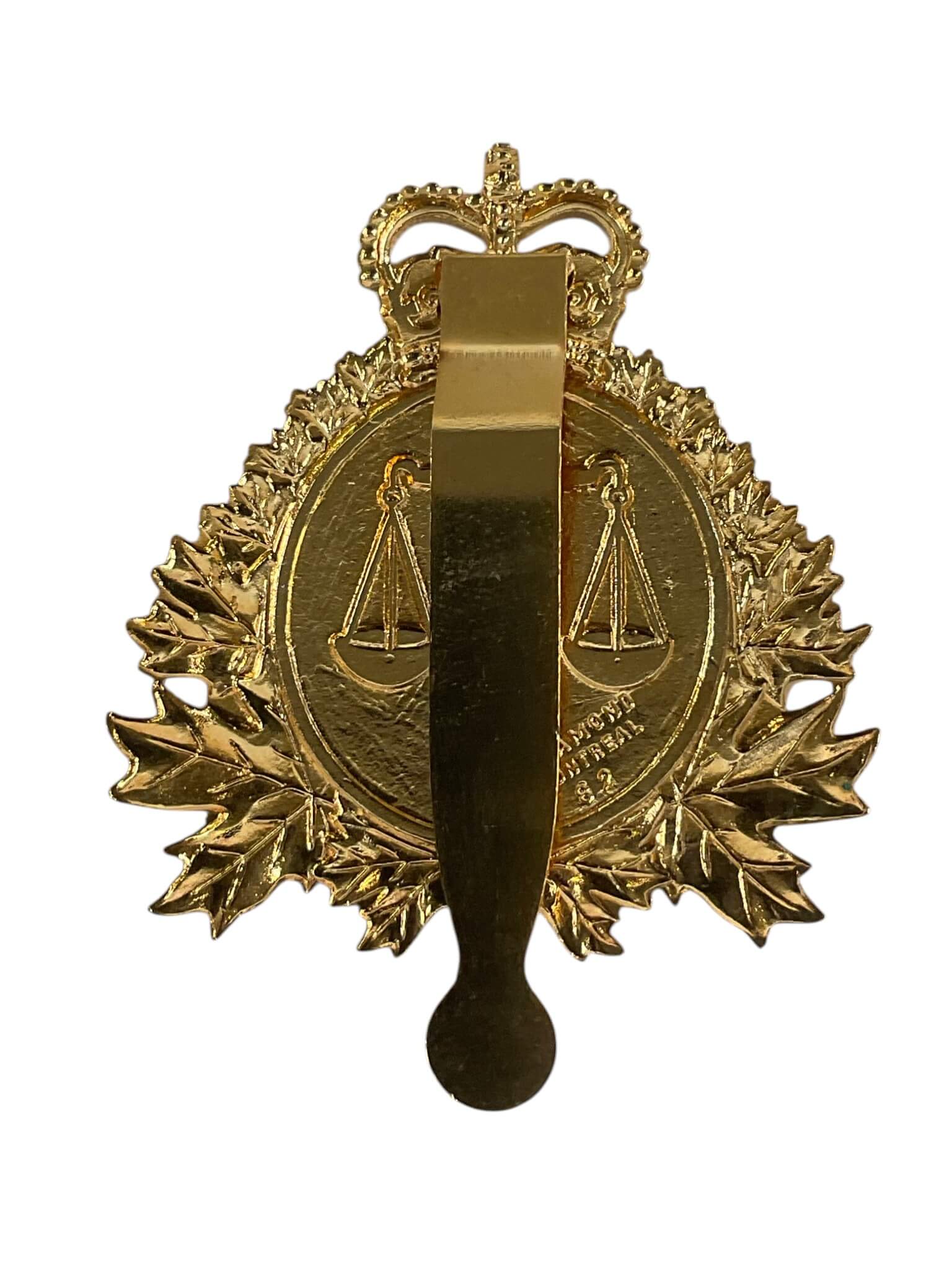 The Canadian Forces Legal Branch Cap Badge is an emblem worn by members of the Legal Branch within the Canadian Armed Forces. This badge typically features a wreath of maple leaves encircling the scales of justice, surmounted by the St. Edward’s Crown, symbolizing both the authority of the Canadian monarchy and the branch’s responsibility for upholding military law. The design reflects the Legal Branch’s commitment to justice and its integral role in providing legal advice and services across all military operations. Constructed from metal, the badge is designed for attachment to the authorized cap or beret. The Legal Branch, established as an integral component of the Canadian Forces, supports military personnel through legal counsel, operational law, and administration of military justice. This cap badge is a representative piece of Canadian military insignia from the late twentieth century onward, illustrating both the heritage and the continuing service of the Legal Branch within the Canadian Armed Forces.