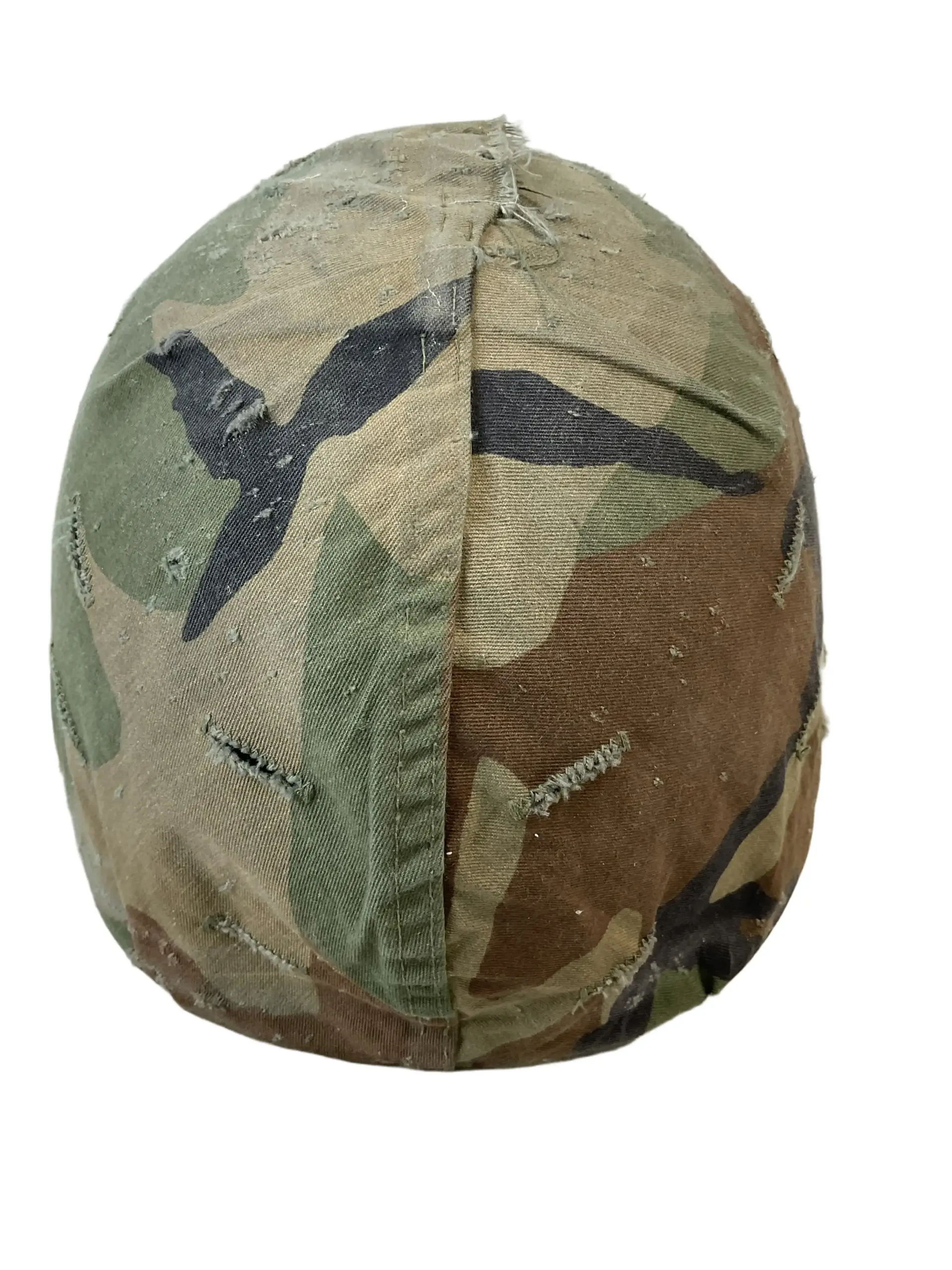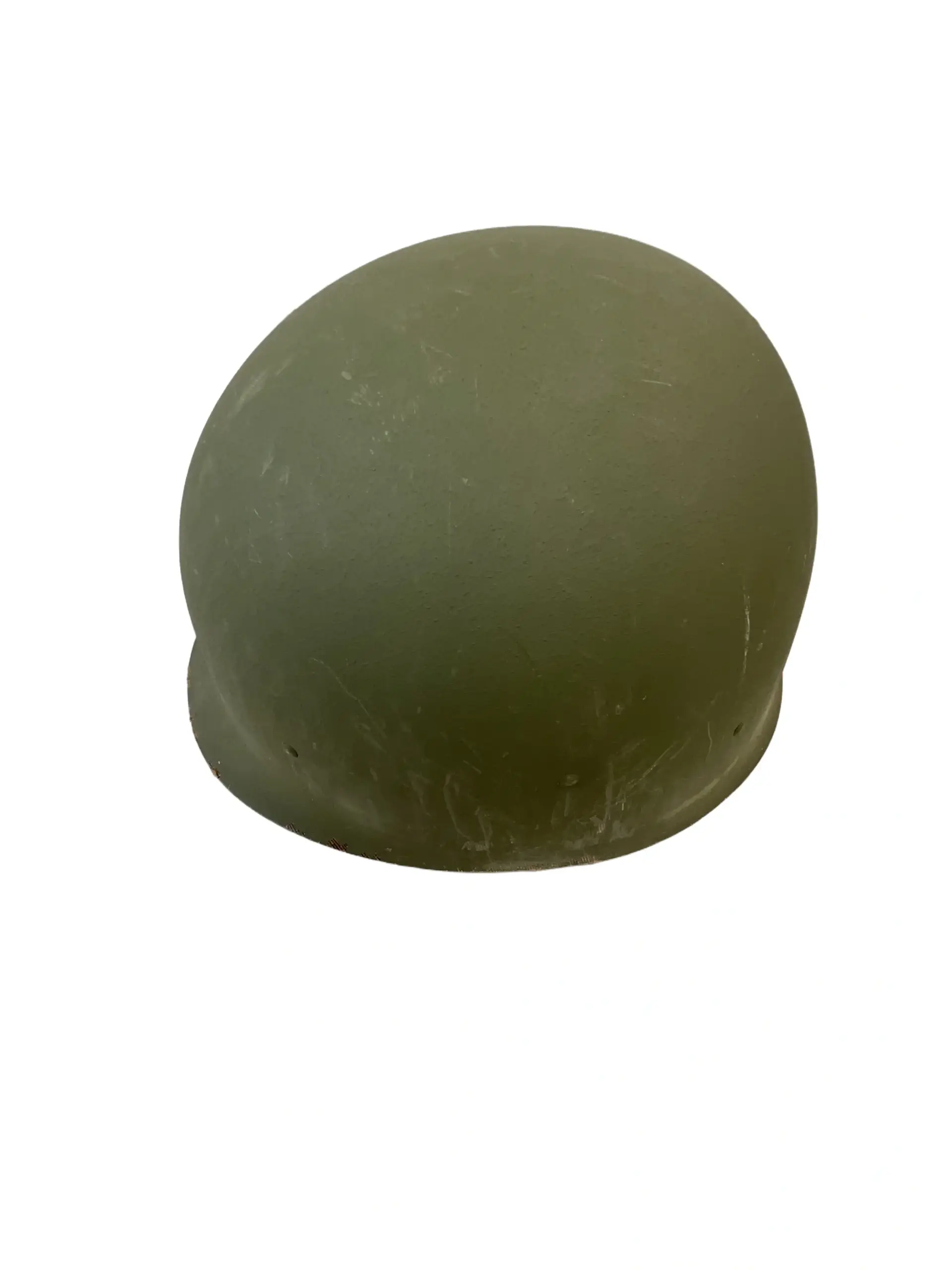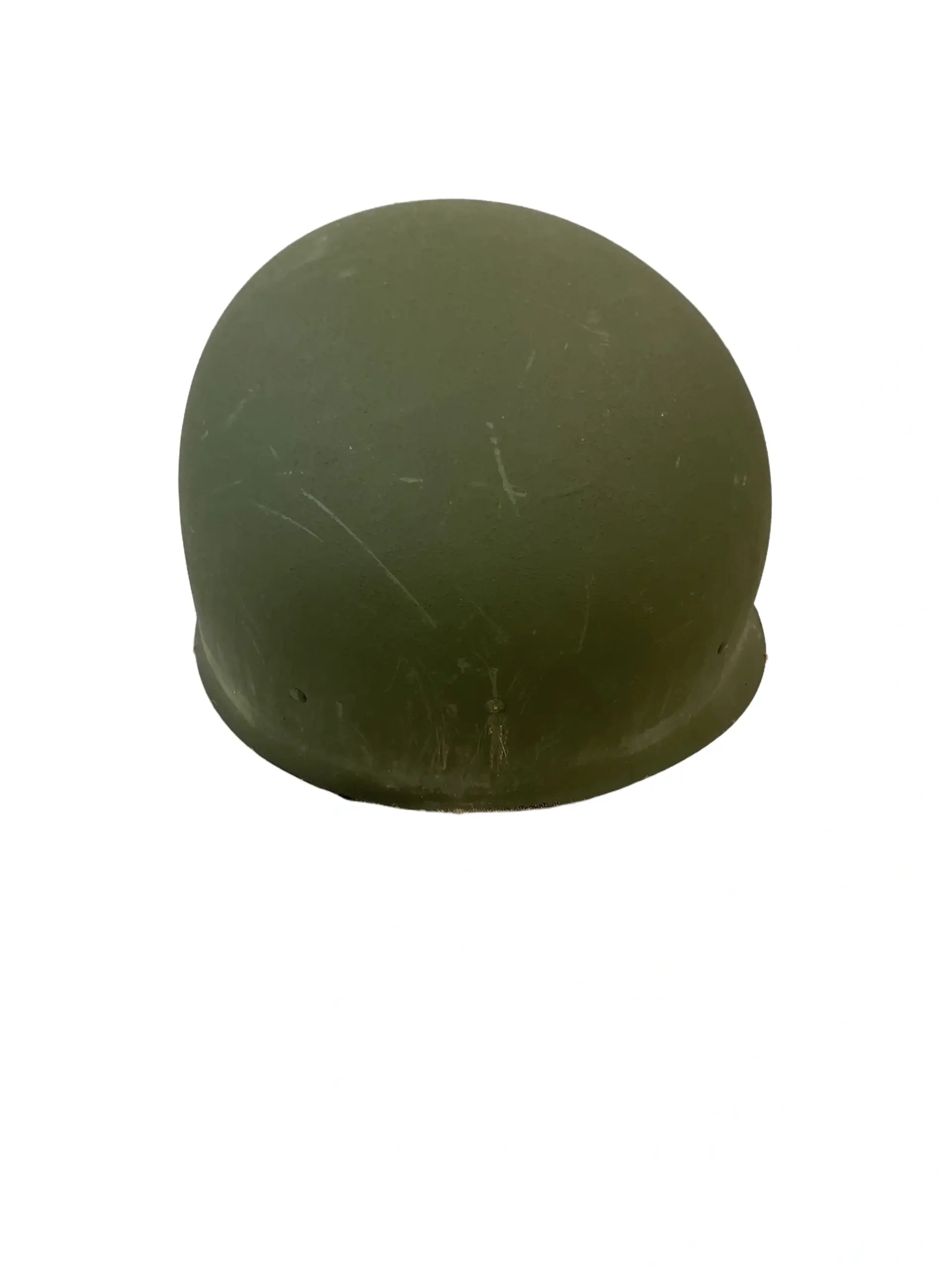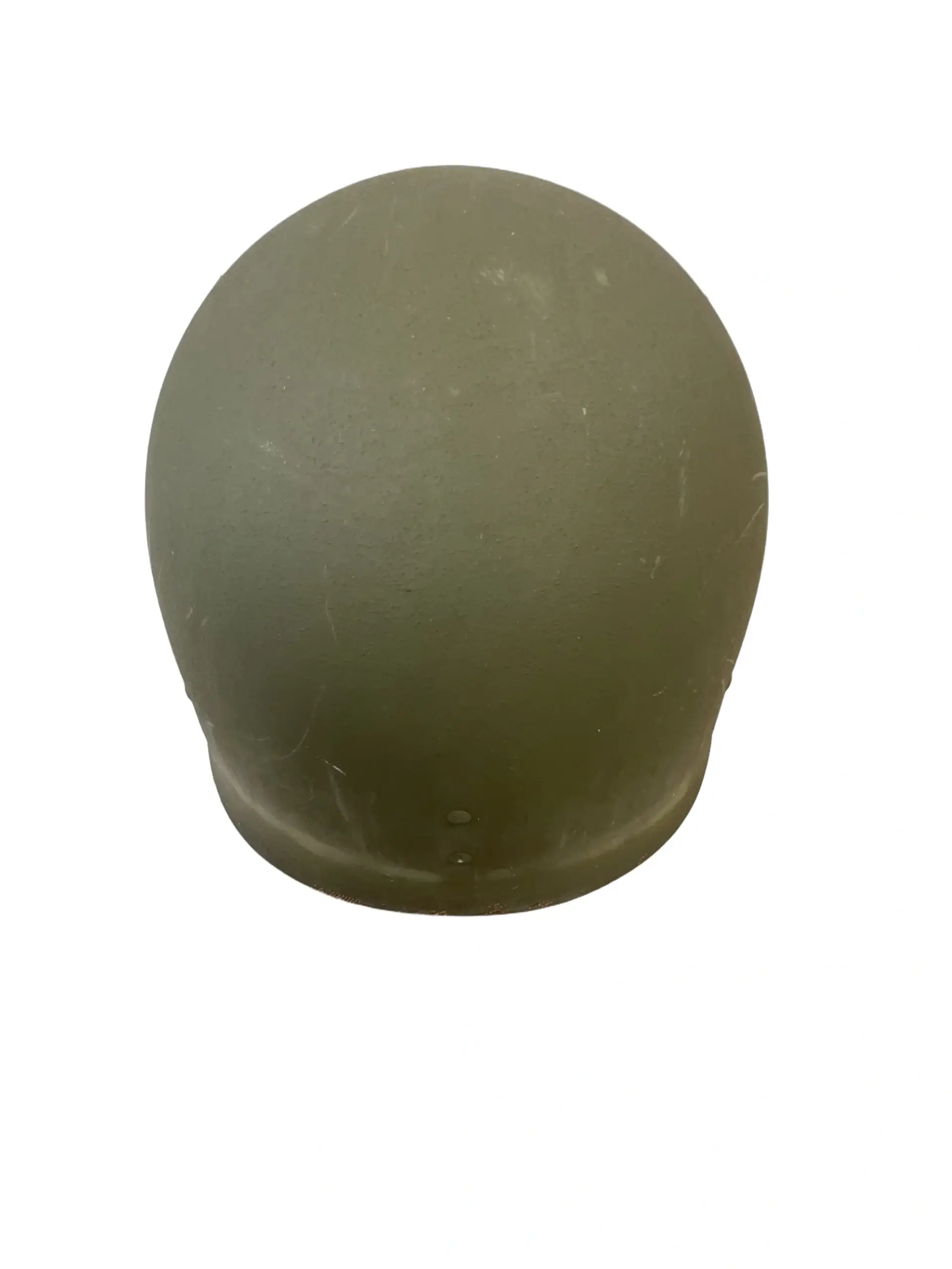 The Canadian Forces M1 Steel Helmet with Woodland Cover is a military-issue protective helmet used by Canadian armed forces during the late 20th century. Modeled after the American M1 design, this helmet consists of a steel shell and a separate liner, providing both ballistic protection and improved comfort for the wearer. The attached woodland camouflage cover is constructed from durable fabric and features a universal pattern used to enhance soldier concealment in forested environments. The helmet is equipped with adjustable webbing and a chin strap system to ensure a secure and comfortable fit. This model saw service with Canadian troops from the post–Second World War period through to the adoption of composite helmet designs in the 1990s. The Canadian Forces M1 Steel Helmet with Woodland Cover is representative of Cold War–era headgear and remains of interest to collectors of 20th-century Canadian military equipment and uniforms.