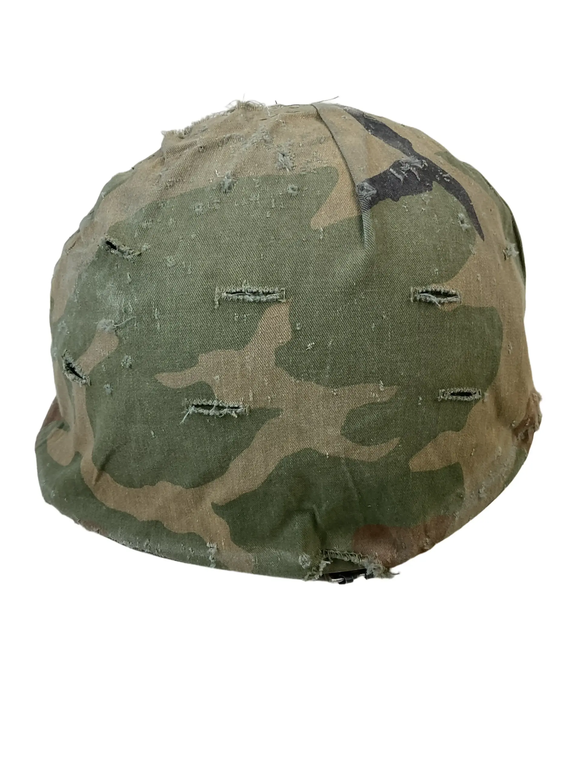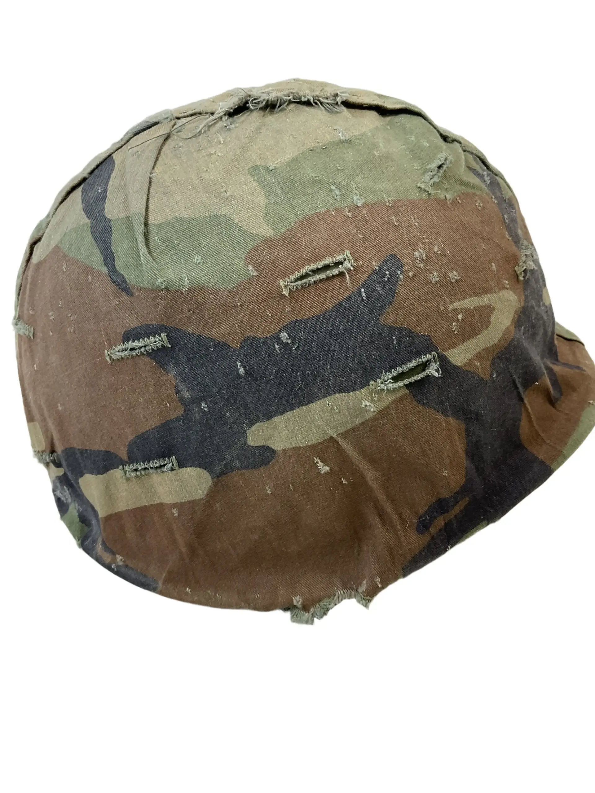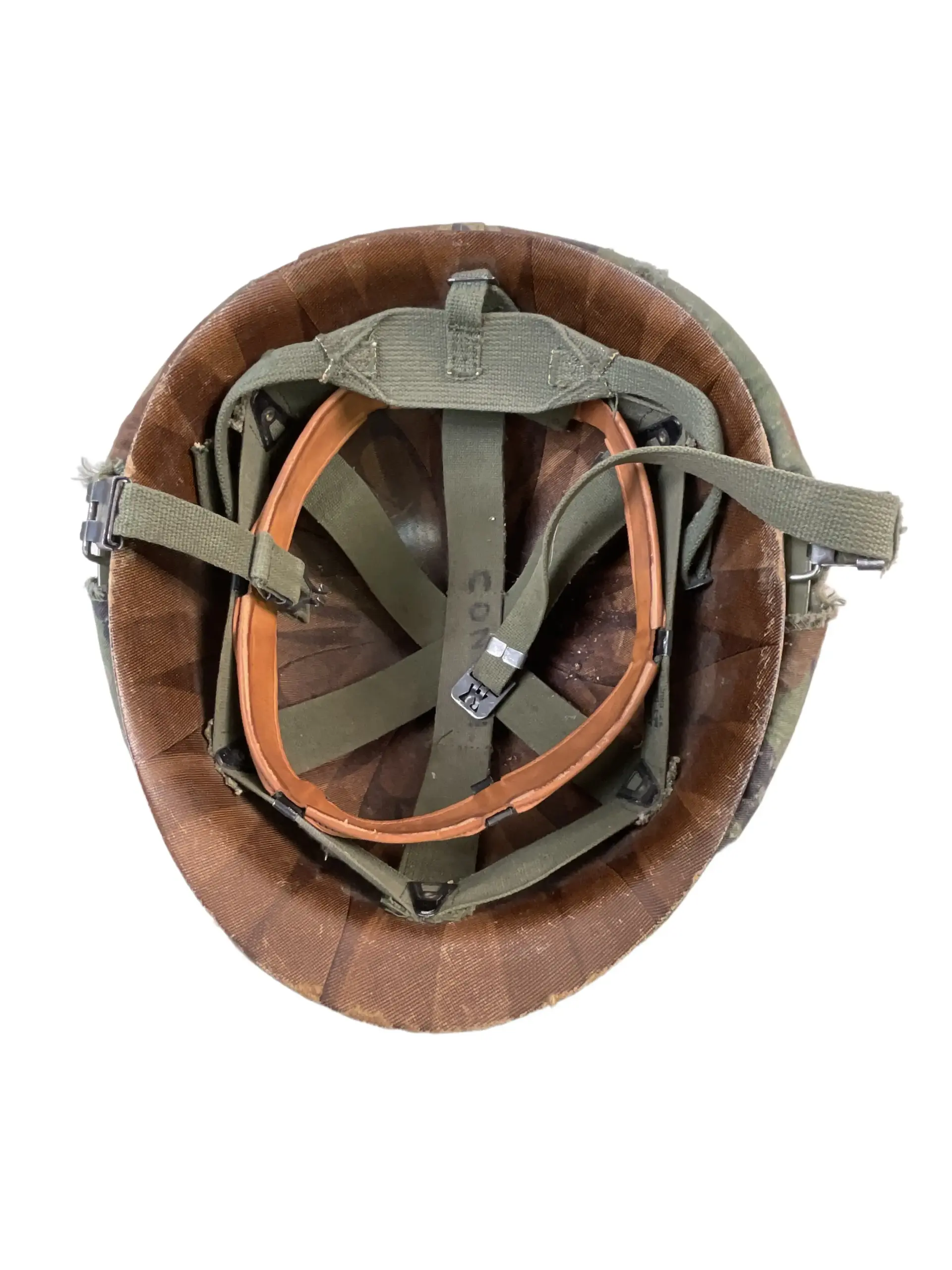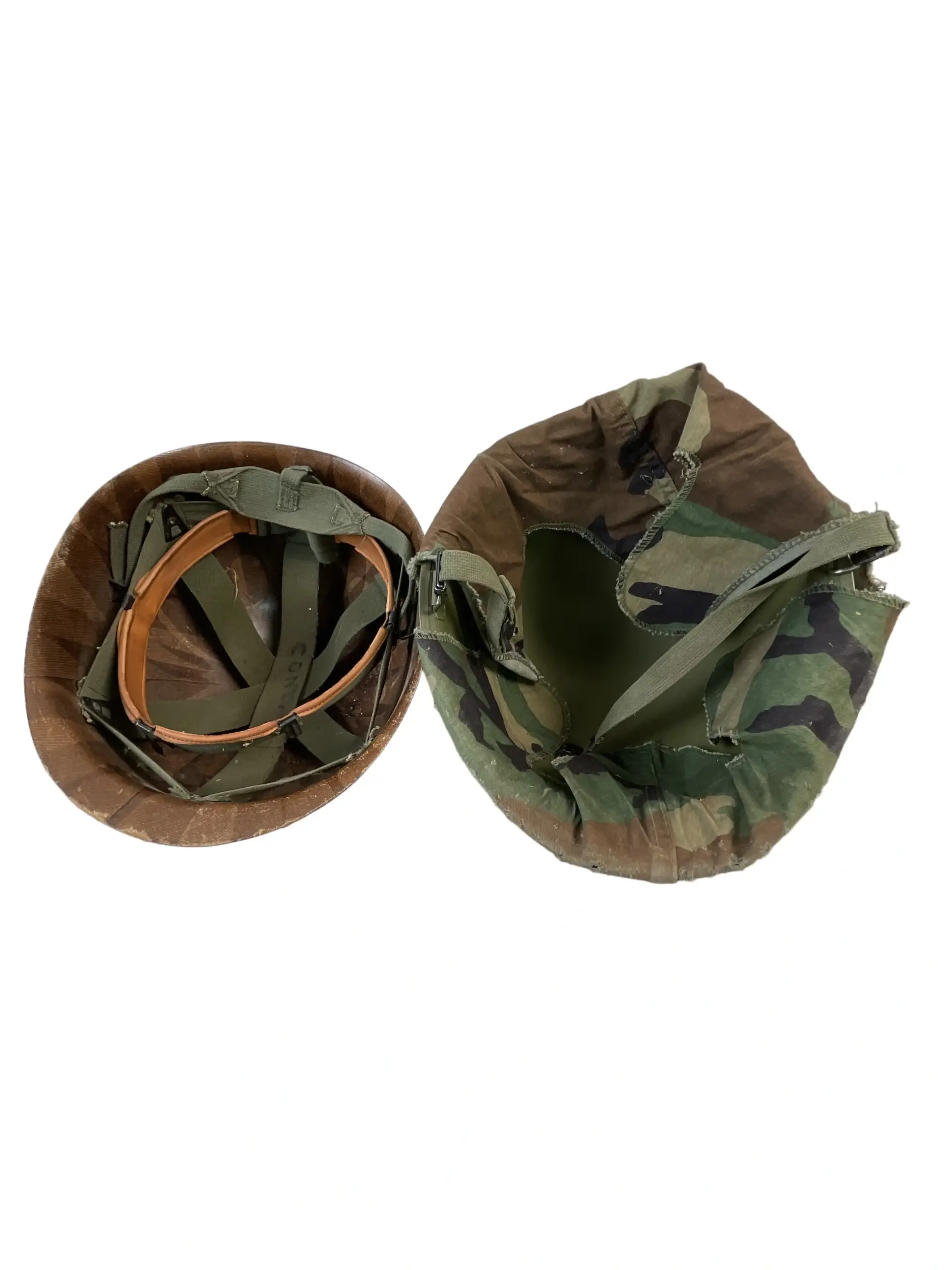 The Canadian Forces M1 Steel Helmet with Woodland Cover is a military-issue protective helmet used by Canadian armed forces during the late 20th century. Modeled after the American M1 design, this helmet consists of a steel shell and a separate liner, providing both ballistic protection and improved comfort for the wearer. The attached woodland camouflage cover is constructed from durable fabric and features a universal pattern used to enhance soldier concealment in forested environments. The helmet is equipped with adjustable webbing and a chin strap system to ensure a secure and comfortable fit. This model saw service with Canadian troops from the post–Second World War period through to the adoption of composite helmet designs in the 1990s. The Canadian Forces M1 Steel Helmet with Woodland Cover is representative of Cold War–era headgear and remains of interest to collectors of 20th-century Canadian military equipment and uniforms.