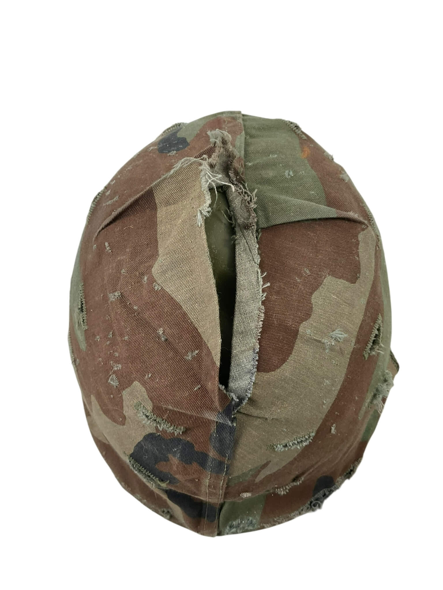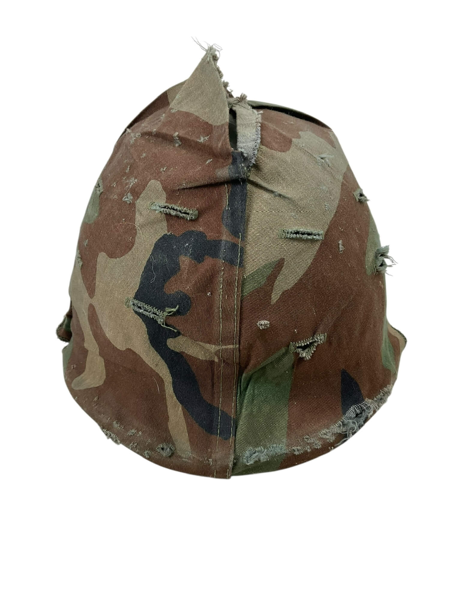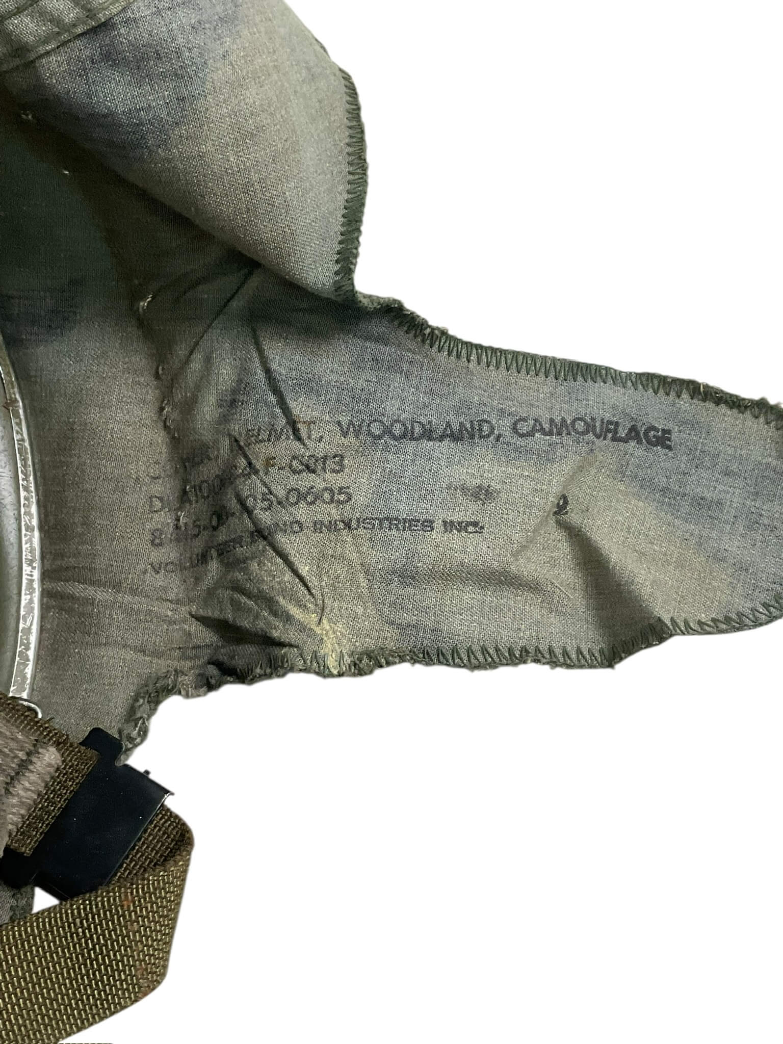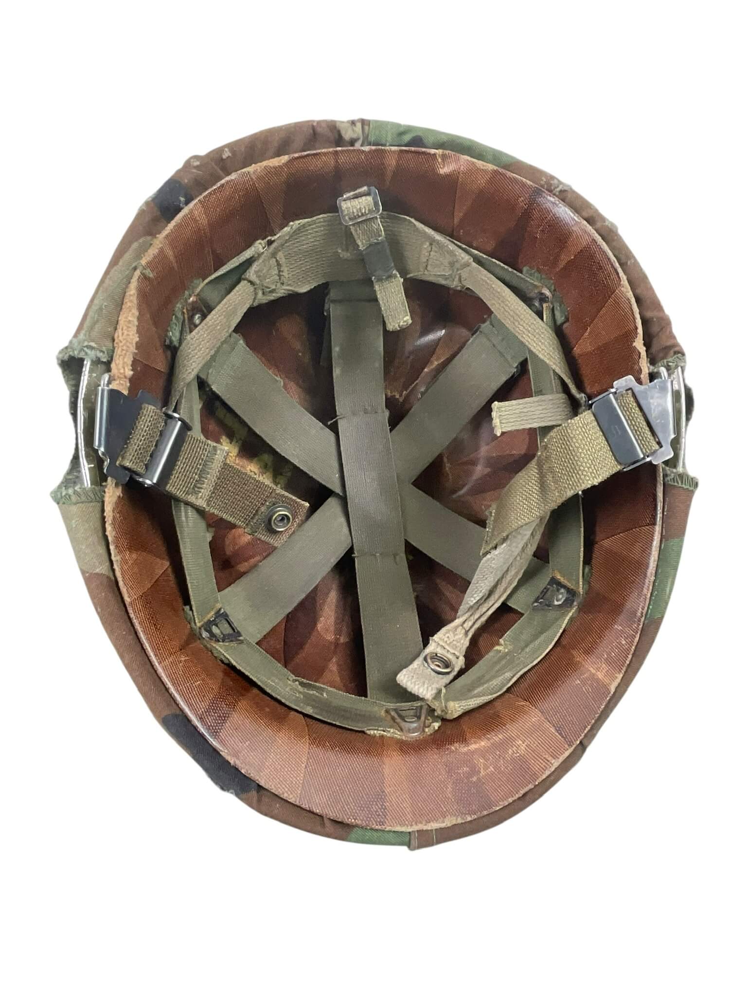 The Canadian Forces M1 Steel Helmet with Woodland Cover is a standard-issue protective helmet used by Canadian military personnel during the late 20th century. Modeled after the American M1 design, this helmet features a sturdy steel shell and an adjustable liner system, providing effective ballistic and impact protection. The woodland camouflage cover is crafted from durable fabric and is designed to reduce visibility in temperate forest environments, aligning with NATO camouflage standards of the era. This helmet configuration was commonly issued from the 1960s into the late 1980s, serving in various training and operational contexts both domestically and overseas. The item typically includes the steel shell, plastic/fiberglass liner, web suspension, and a snap chinstrap for secure fit, along with a removable cloth cover. It reflects the transitional period in Canadian military headgear prior to the adoption of composite helmets in the 1990s. This helmet is a representative example of Cold War-era Canadian combat equipment.