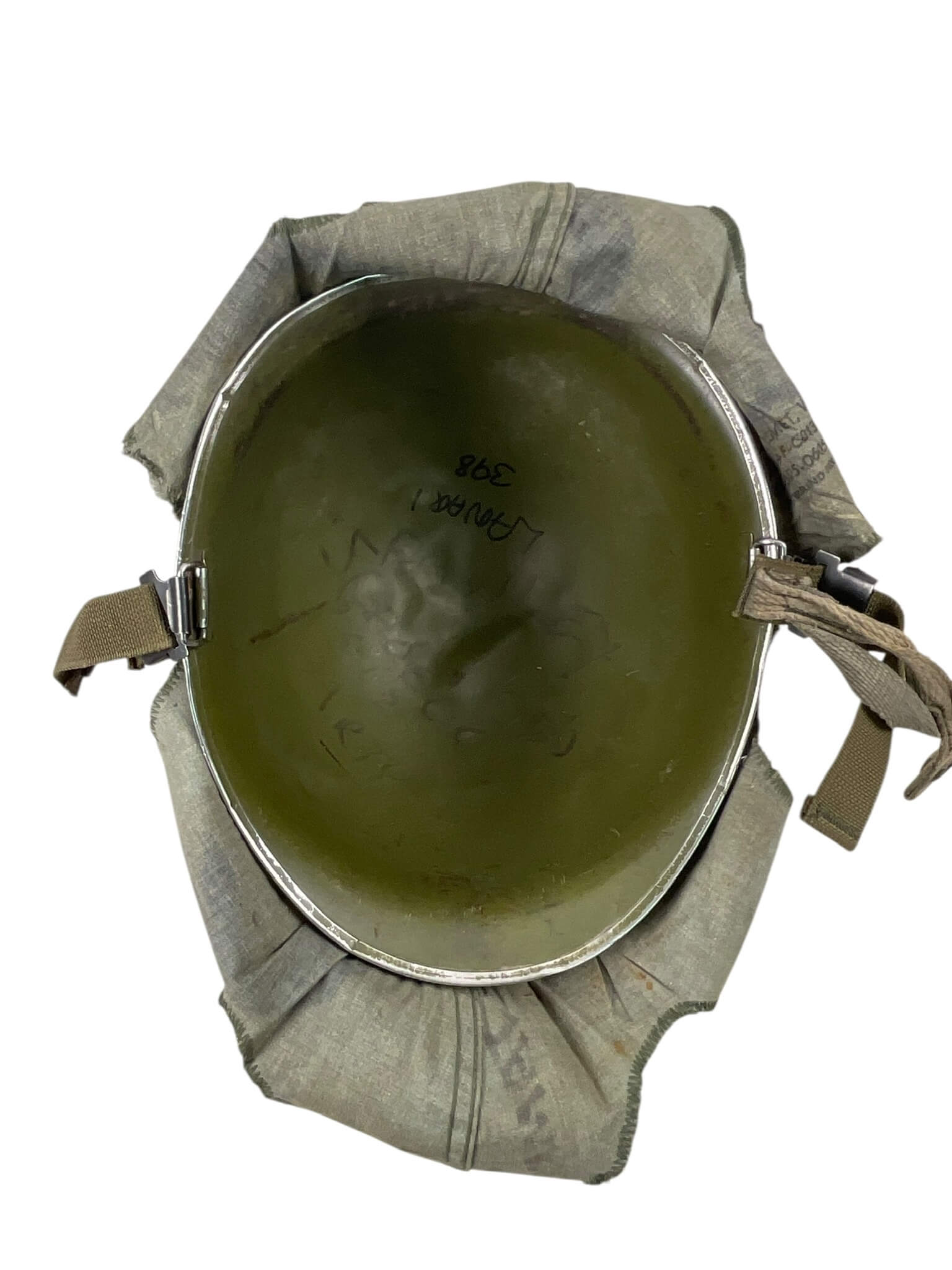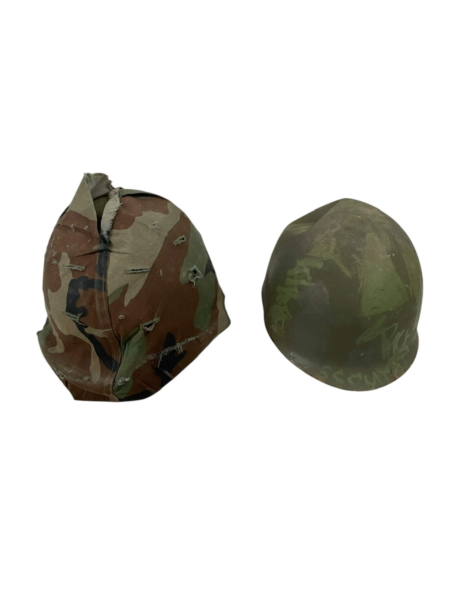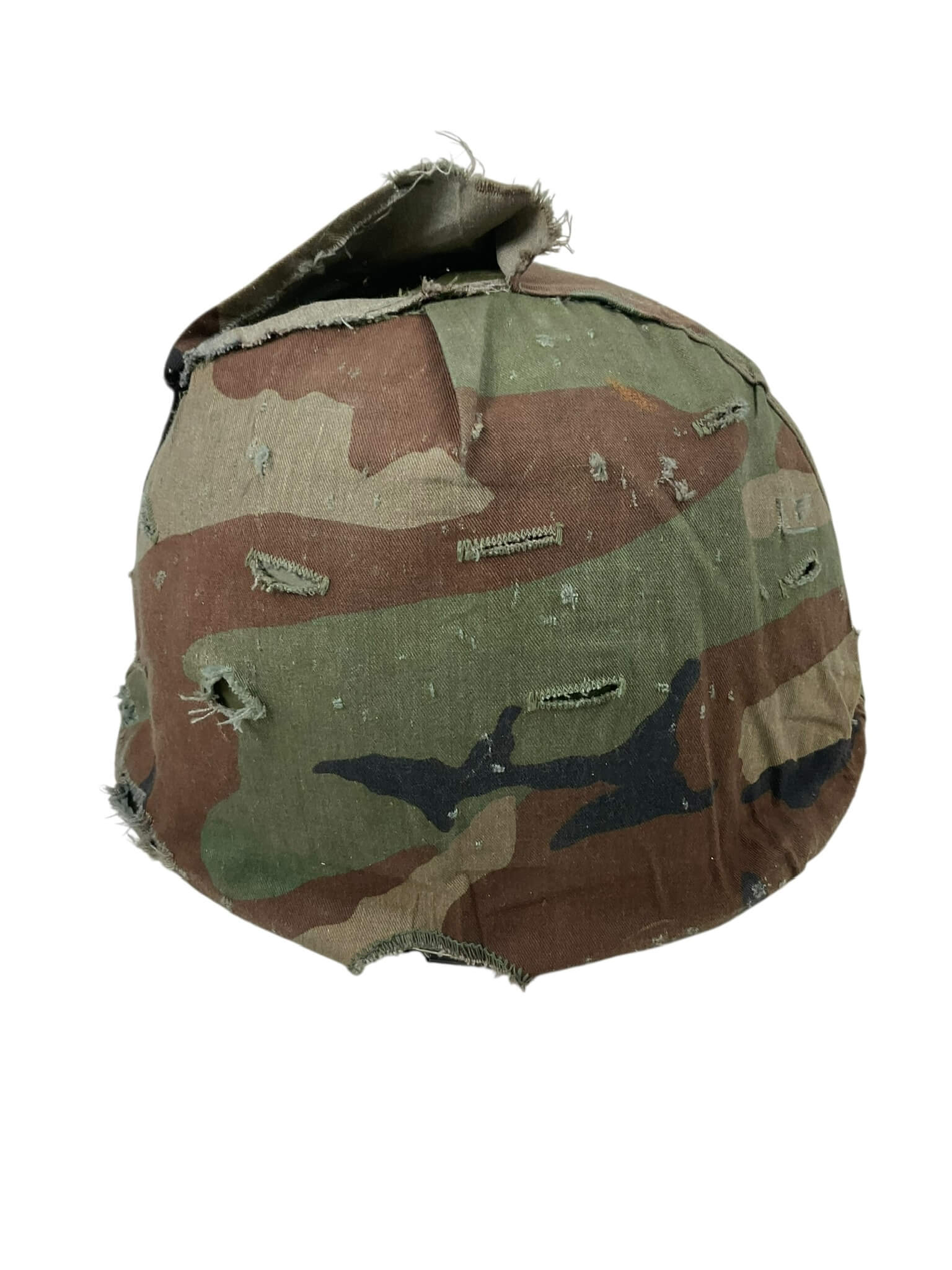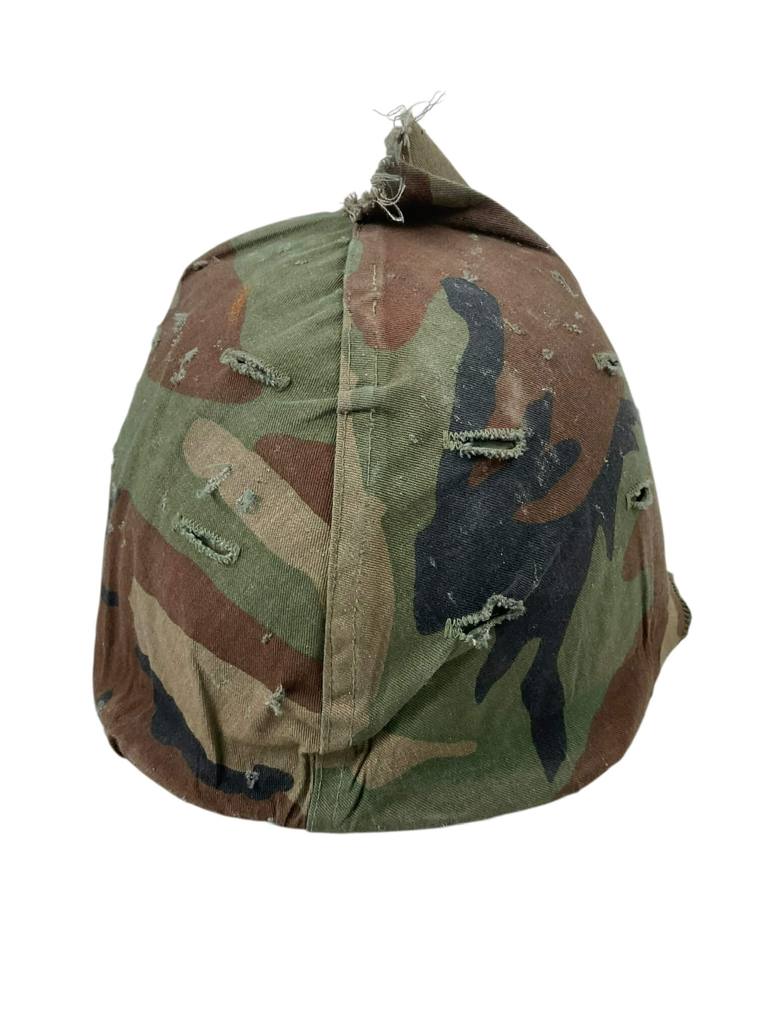 The Canadian Forces M1 Steel Helmet with Woodland Cover is a standard-issue protective helmet used by Canadian military personnel during the late 20th century. Modeled after the American M1 design, this helmet features a sturdy steel shell and an adjustable liner system, providing effective ballistic and impact protection. The woodland camouflage cover is crafted from durable fabric and is designed to reduce visibility in temperate forest environments, aligning with NATO camouflage standards of the era. This helmet configuration was commonly issued from the 1960s into the late 1980s, serving in various training and operational contexts both domestically and overseas. The item typically includes the steel shell, plastic/fiberglass liner, web suspension, and a snap chinstrap for secure fit, along with a removable cloth cover. It reflects the transitional period in Canadian military headgear prior to the adoption of composite helmets in the 1990s. This helmet is a representative example of Cold War-era Canadian combat equipment.
