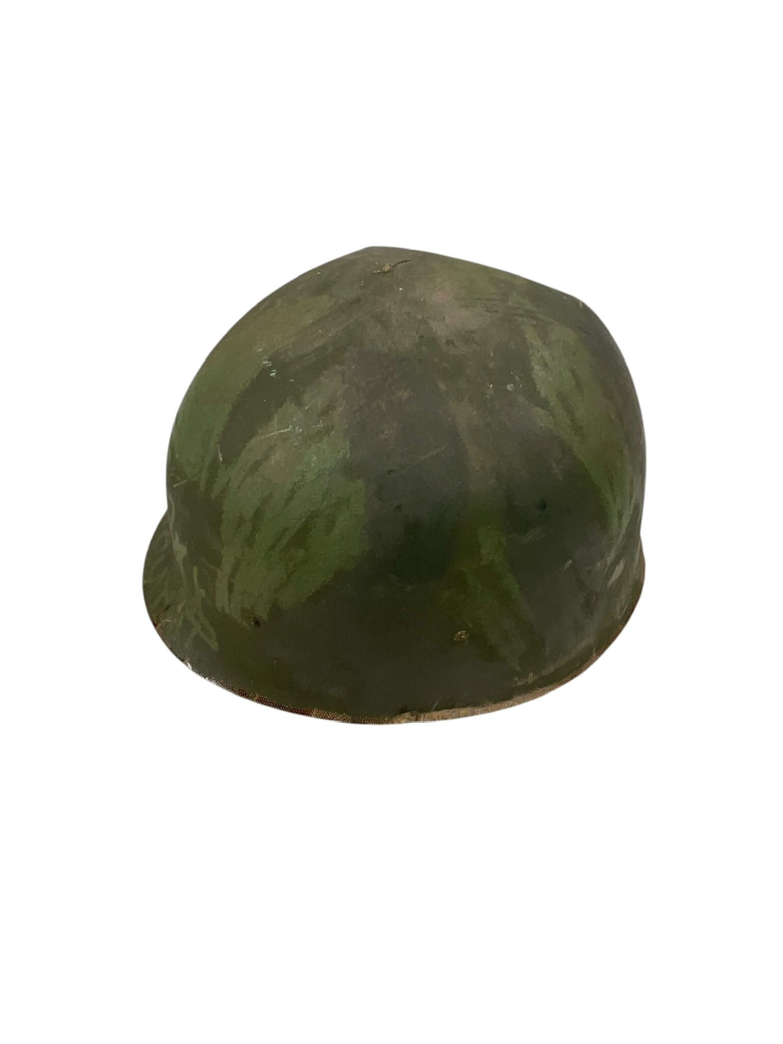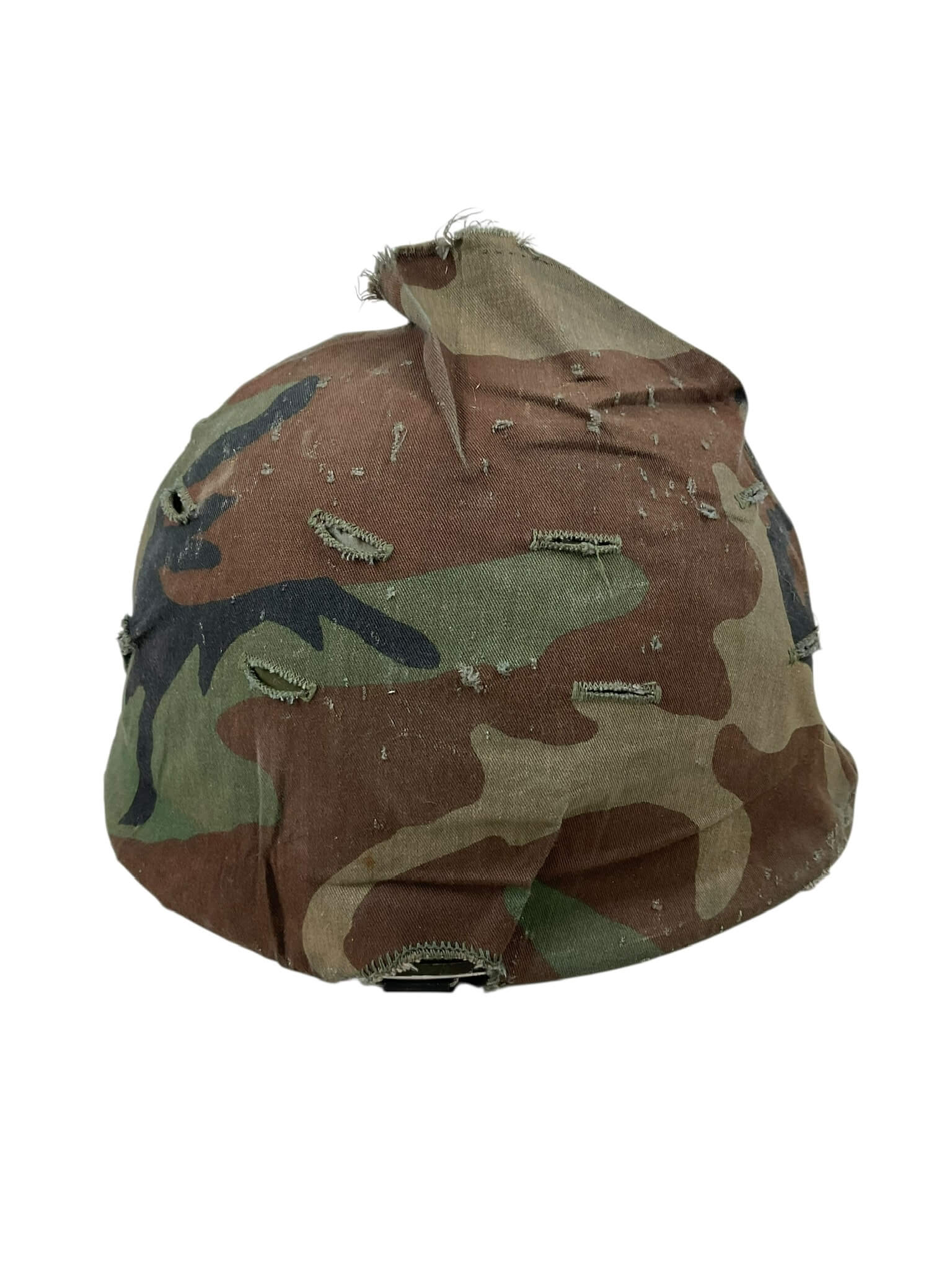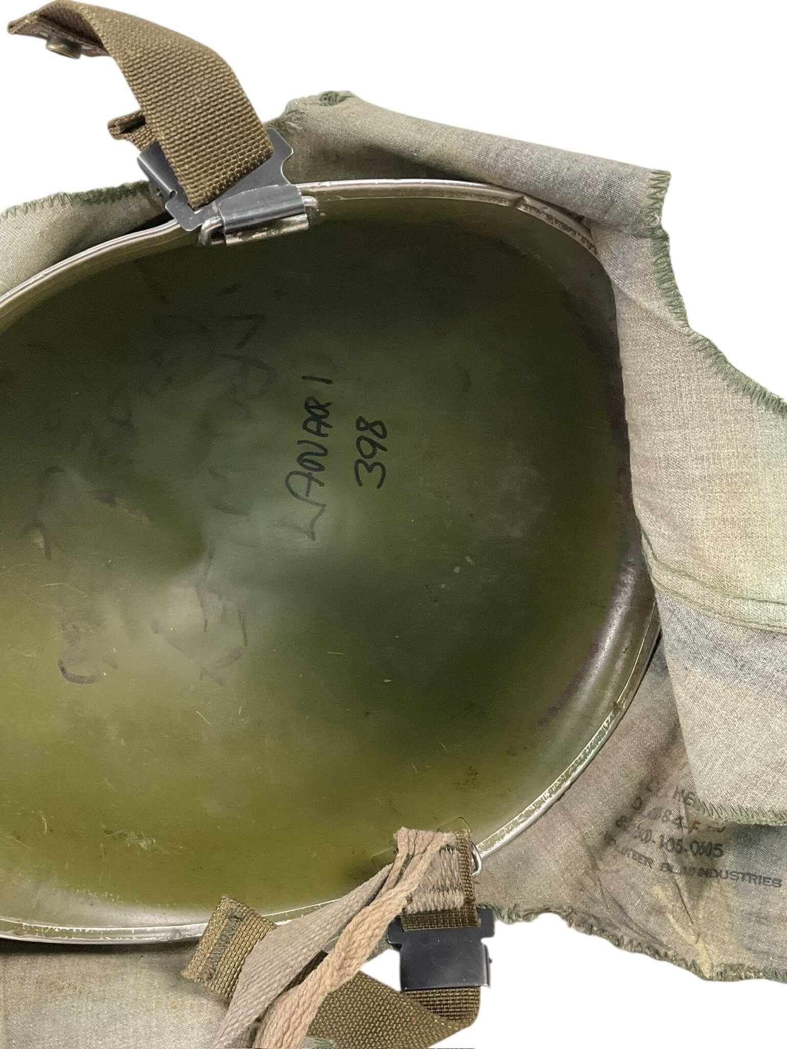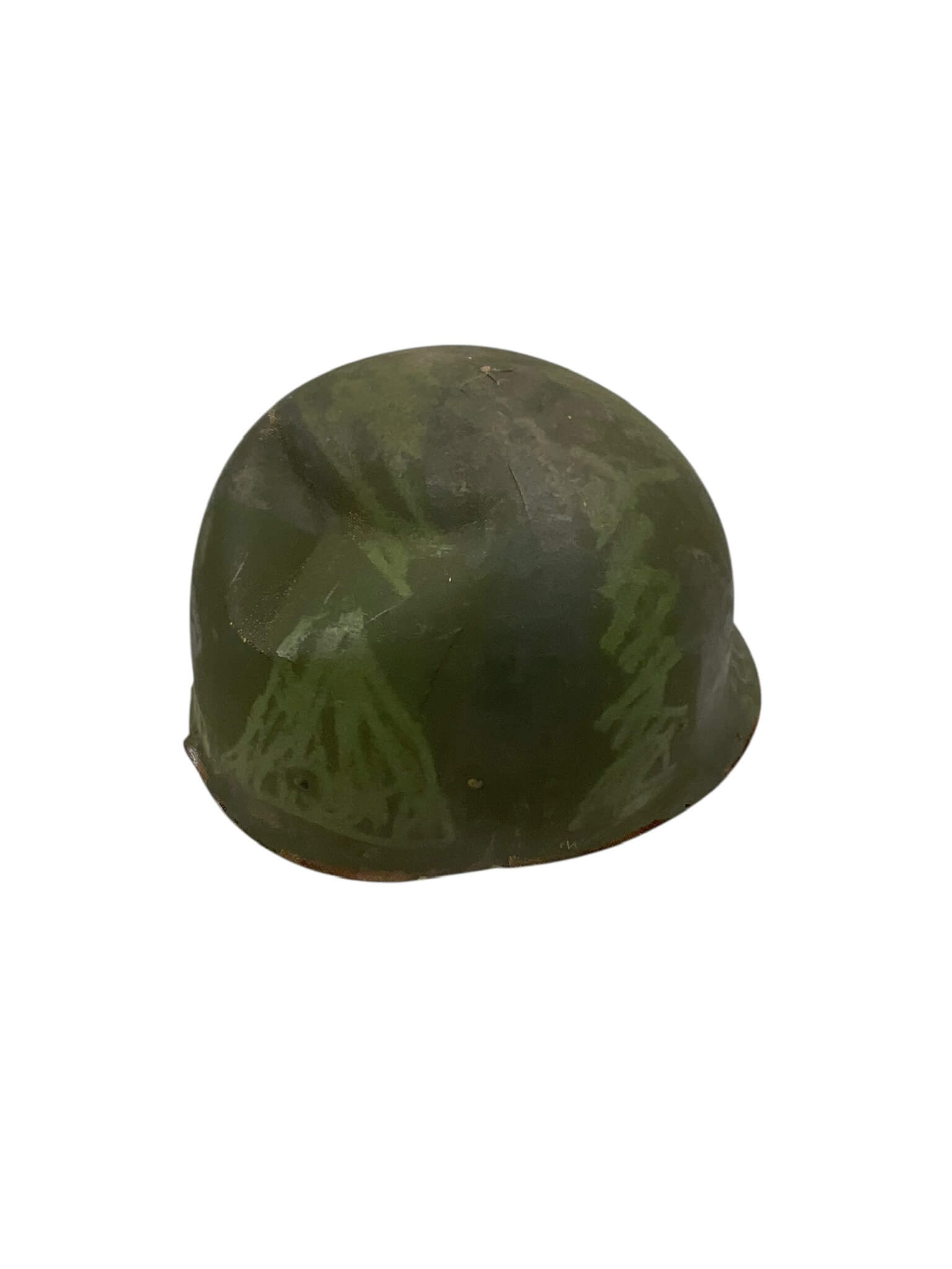 The Canadian Forces M1 Steel Helmet with Woodland Cover is a standard-issue protective helmet used by Canadian military personnel during the late 20th century. Modeled after the American M1 design, this helmet features a sturdy steel shell and an adjustable liner system, providing effective ballistic and impact protection. The woodland camouflage cover is crafted from durable fabric and is designed to reduce visibility in temperate forest environments, aligning with NATO camouflage standards of the era. This helmet configuration was commonly issued from the 1960s into the late 1980s, serving in various training and operational contexts both domestically and overseas. The item typically includes the steel shell, plastic/fiberglass liner, web suspension, and a snap chinstrap for secure fit, along with a removable cloth cover. It reflects the transitional period in Canadian military headgear prior to the adoption of composite helmets in the 1990s. This helmet is a representative example of Cold War-era Canadian combat equipment.