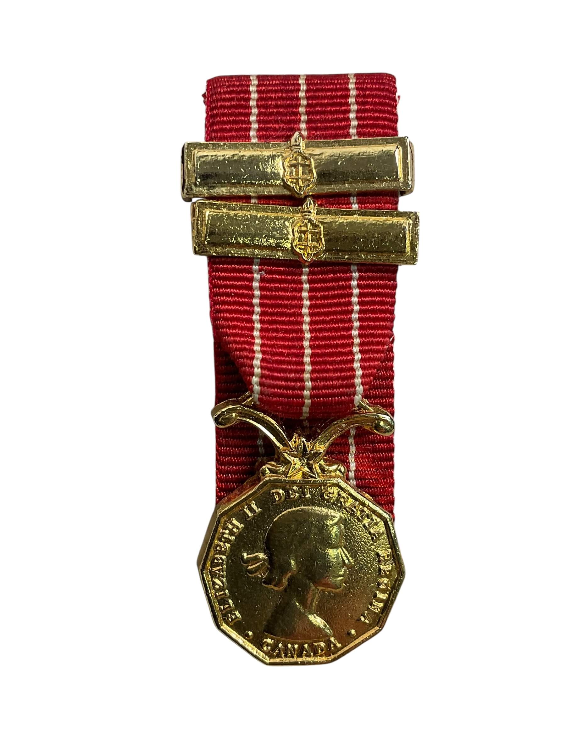 The Canadian Forces Miniature CD Medal with 2 Bars is a compact, scaled-down version of the full-sized decoration. A commemorative token representing exemplary military service in Canada, this small medal displays two bars, signifying multiple recognitions. Crafted with attention to detail, it is a noteworthy piece for collectors of military memorabilia.