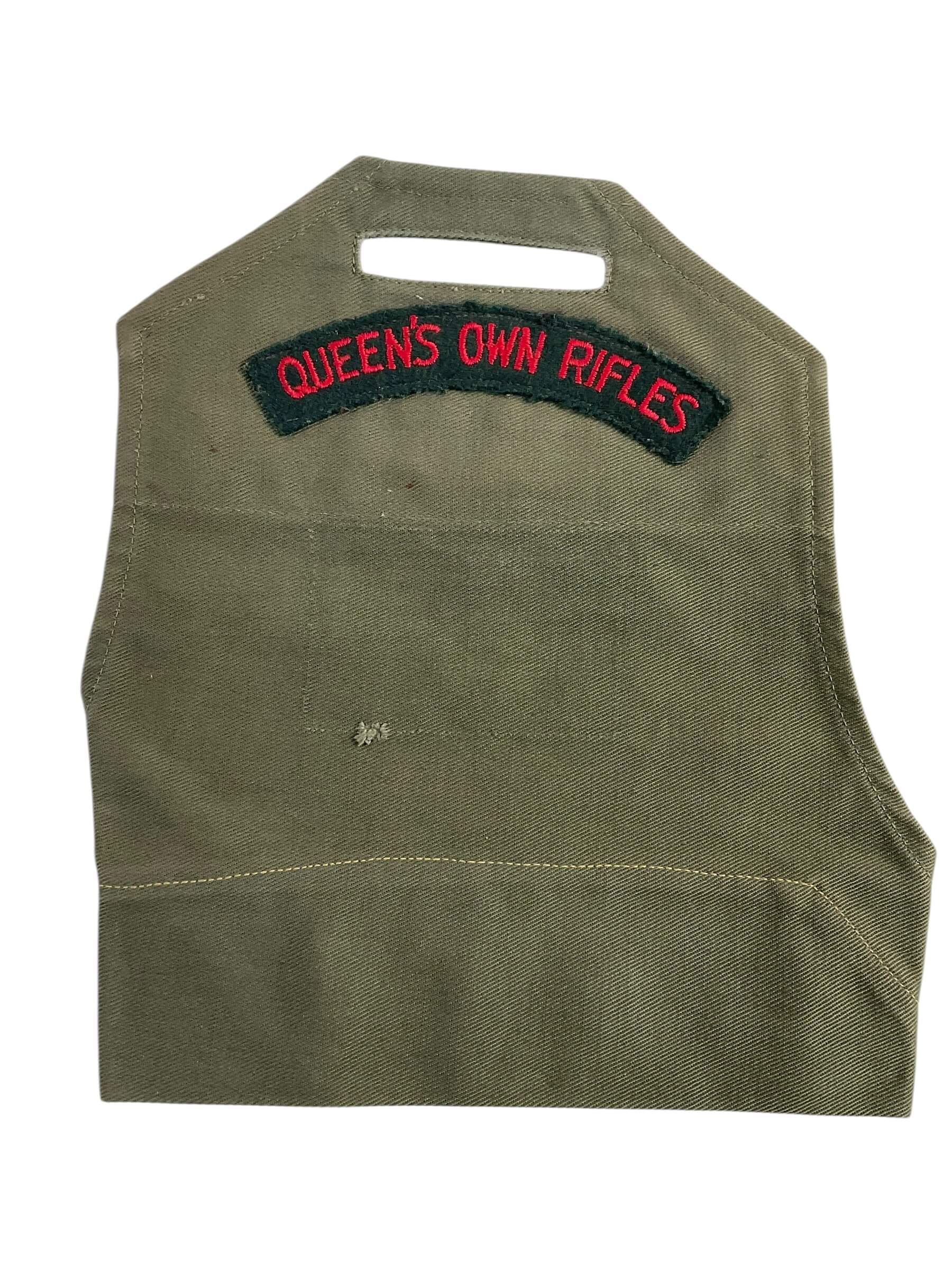 The Canadian Forces Queen’s Own Rifles Blank Armband Brassard is a military accessory associated with the Queen’s Own Rifles of Canada, a regiment established in 1860 and notable for its service in various conflicts. This item consists of a plain, unmarked fabric armband designed to be worn over a uniform sleeve. Such brassards were typically used to signify temporary assignments, duties, or specific roles, often allowing for quick identification of personnel without permanent insignia. The blank nature of this brassard indicates that it was not assigned to a particular rank or role, providing versatility in its military application. Constructed from sturdy material suitable for field conditions, this armband reflects standard military design practices of the period. It is relevant for collectors and historians interested in Canadian military history, specifically those focusing on regimental equipment and uniform components from the postwar era or later Canadian Forces developments.