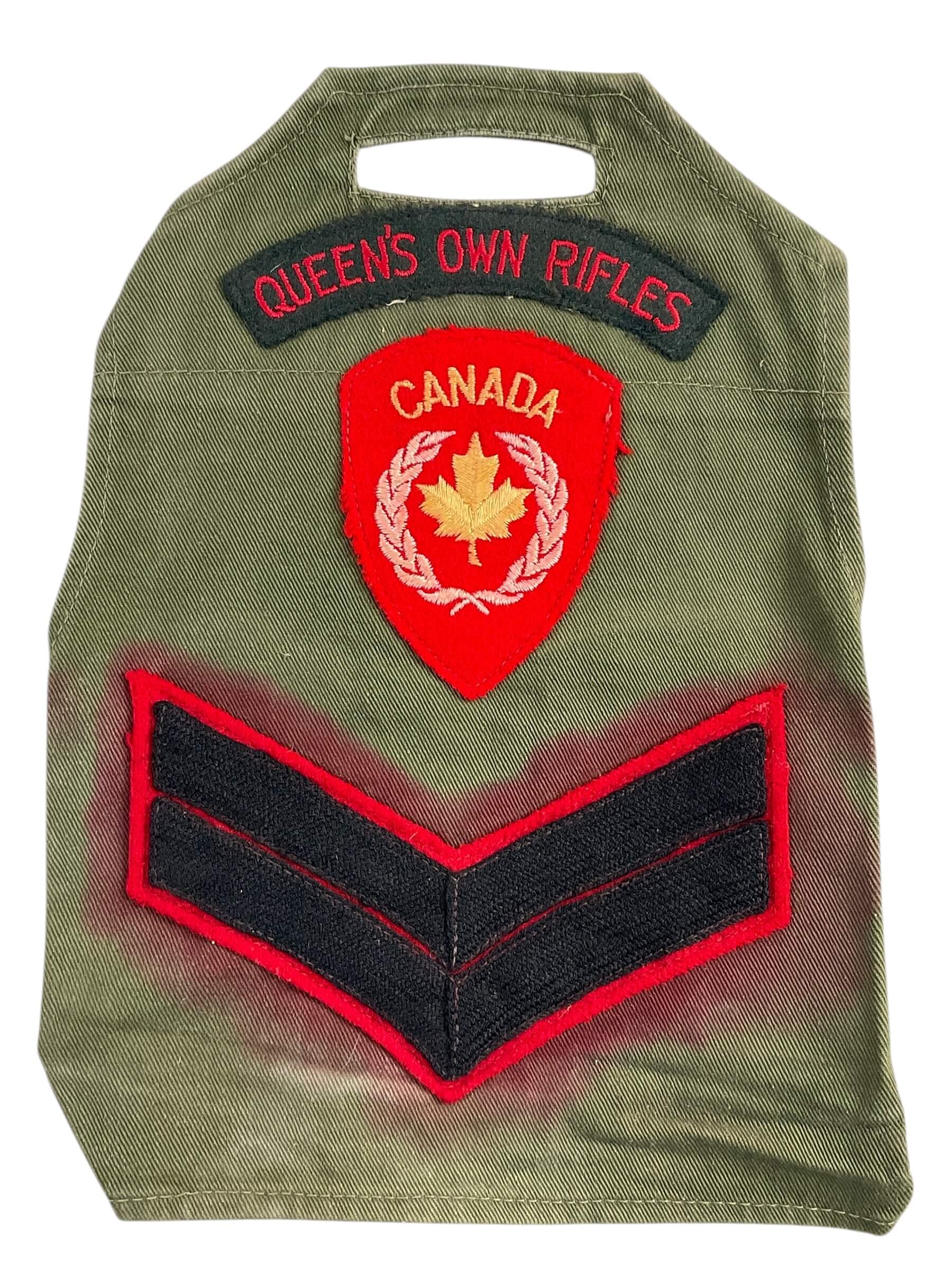 The Canadian Forces Queen’s Own Rifles Corporal Armband Brassard is a designation item used to indicate the rank of Corporal within the Queen’s Own Rifles regiment of Canada. This brassard typically features a durable construction, designed to be worn on the upper arm over the uniform. The armband displays the appropriate insignia associated with the rank of Corporal, usually consisting of chevrons, and may incorporate regimental identifiers specific to the Queen’s Own Rifles. Brassards were employed to provide clear rank identification without the need for uniform modification and could be used during training exercises, ceremonial events, or periods of temporary assignment. Items such as this are reflective of mid-to-late twentieth-century Canadian military practice, where armbands and brassards fulfilled a practical role in field and garrison settings. This piece serves as an example of Canadian military uniform accoutrements and is relevant to collectors and researchers interested in regimental insignia and rank identification methods.