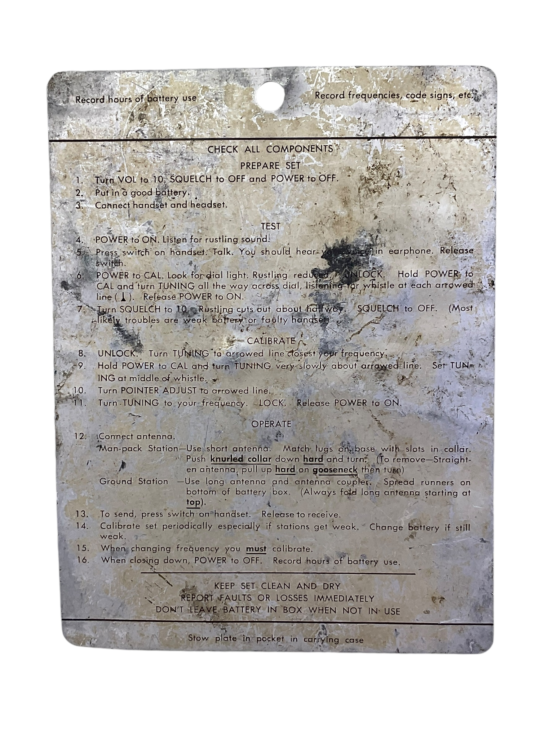 The Canadian Forces Radio Set AN/PRC-509 Aluminum Description Plate is a crucial piece of military memorabilia. This plate, crafted from sturdy aluminum, is attached to the AN/PRC-509 radio set – a portable, high-frequency, low-power transceiver extensively used by the Canadian Forces. The description plate provides vital information including model number, manufacturing details, and operational instructions. It is designed to withstand severe weather conditions, reflecting the robustness required in military equipment. Its compact size ensures it doesn’t add unnecessary weight to the radio set. This item not only serves a practical purpose, but also holds significant historical value, symbolizing the technological advancements in military communication over the years. Collectors and military enthusiasts alike would find this piece a valuable addition to their collection.