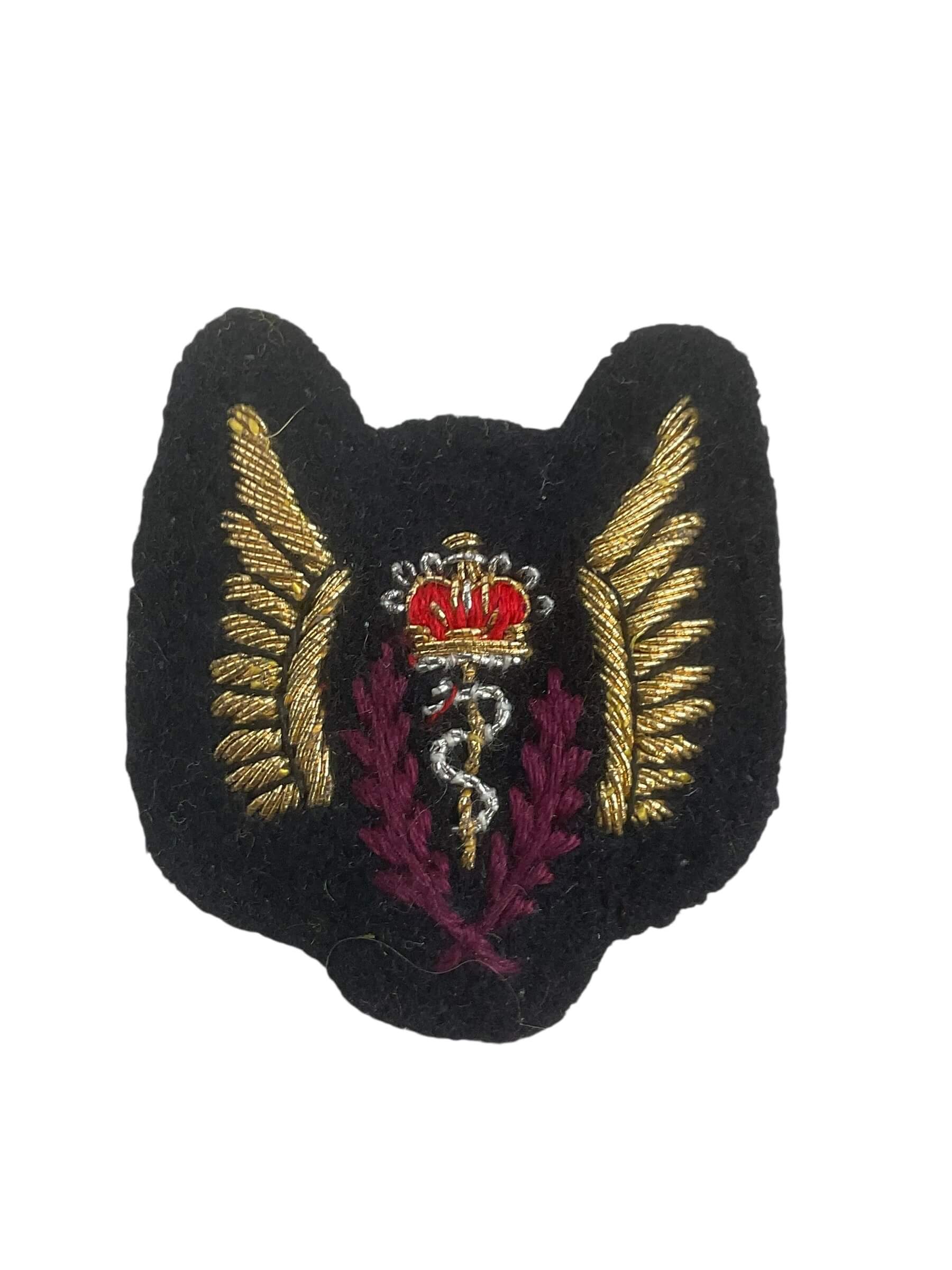 The Canadian Forces RCAF Flight Surgeon Mess Dress Wing Mylar is an insignia awarded to qualified flight surgeons serving with the Royal Canadian Air Force. This example features a detailed wing and caduceus design, rendered in mylar thread, specifically intended for use on mess dress uniforms. The mylar construction gives the insignia a distinct metallic appearance, distinguishing it from cloth or bullion variants. This type of wing identifies the wearer as a certified flight medical officer with specialized training in aviation medicine. Items such as this play a significant role in military dress traditions, denoting both rank and specialized qualifications. The RCAF Flight Surgeon Mess Dress Wing Mylar reflects official issue standards in terms of size, design, and materials, and it typifies insignia used in the late 20th and early 21st centuries. This insignia is of interest to collectors of Canadian military artifacts, particularly those focused on air force history and medical service distinctions.