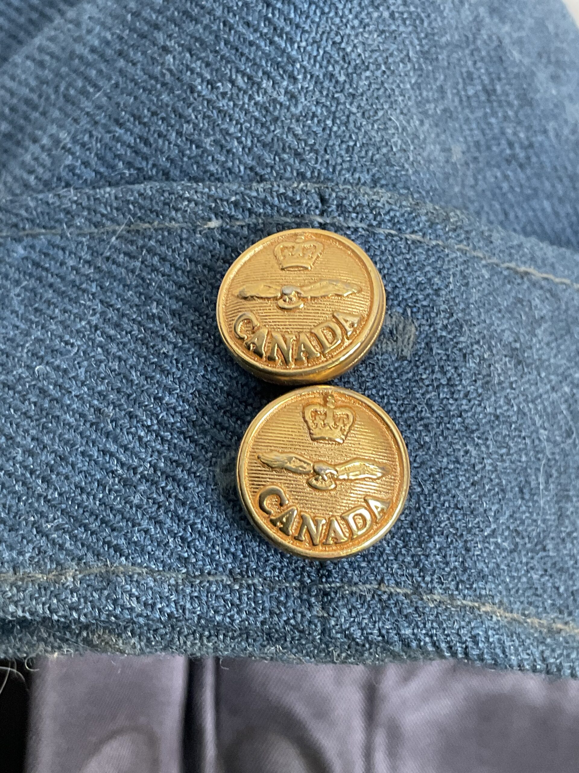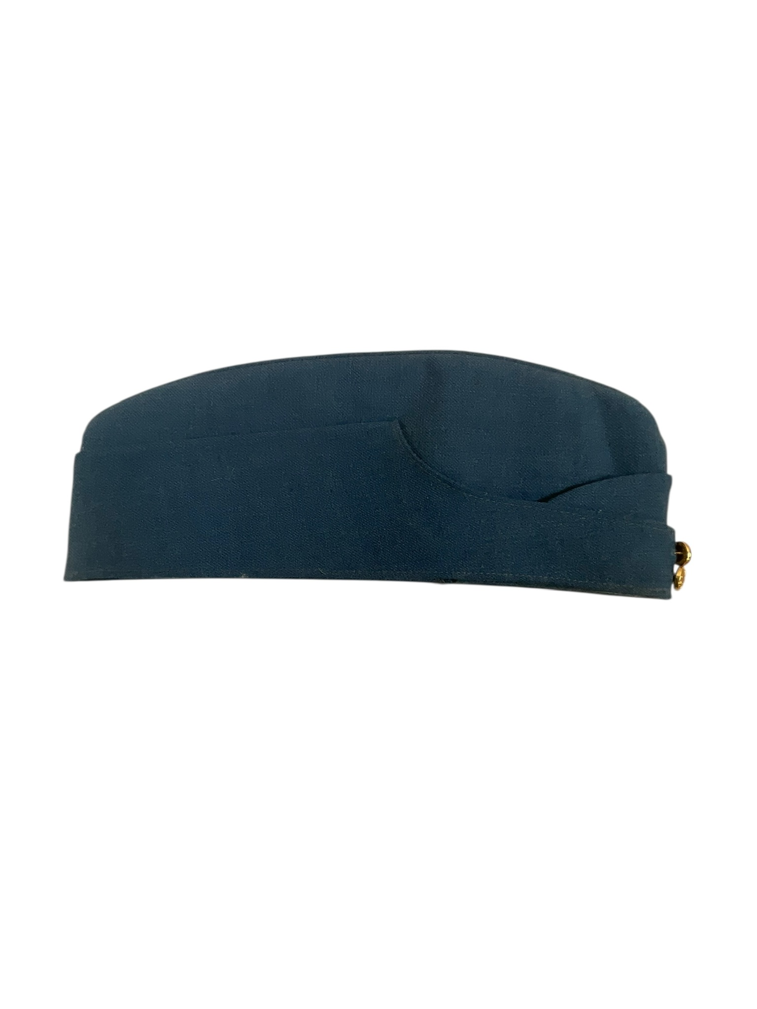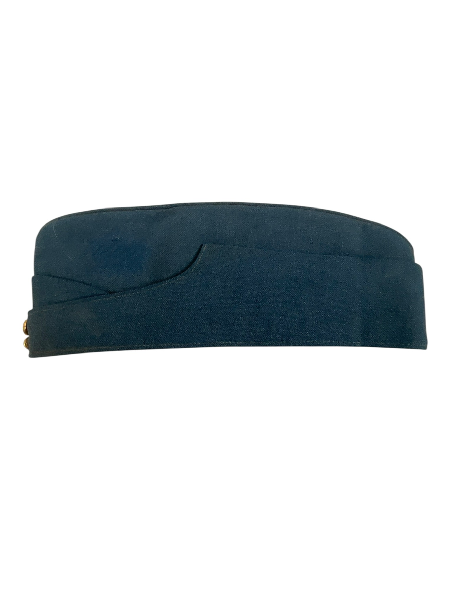 The Canadian Forces RCAF Wedge Cap, Size 7 1/2, is a standard-issue headgear used by members of the Royal Canadian Air Force. Designed in a traditional wedge style, this cap is constructed from blue-grey wool fabric and features tailored seams for a structured fit. The cap is equipped with black plastic or metal RCAF buttons and typically displays the official RCAF cap badge, though badge presence may vary depending on issued period or individual configuration. The interior is lined for comfort and includes clear size markings. Wedge caps have been part of Canadian military uniforms since World War II, reflecting both functional needs and service tradition. They are worn as part of the dress uniform and are recognized for their distinctive profile and historical association with the RCAF. This specific example is in size 7 1/2, suitable for collectors of military headgear and individuals seeking authentic elements of Canadian military attire.