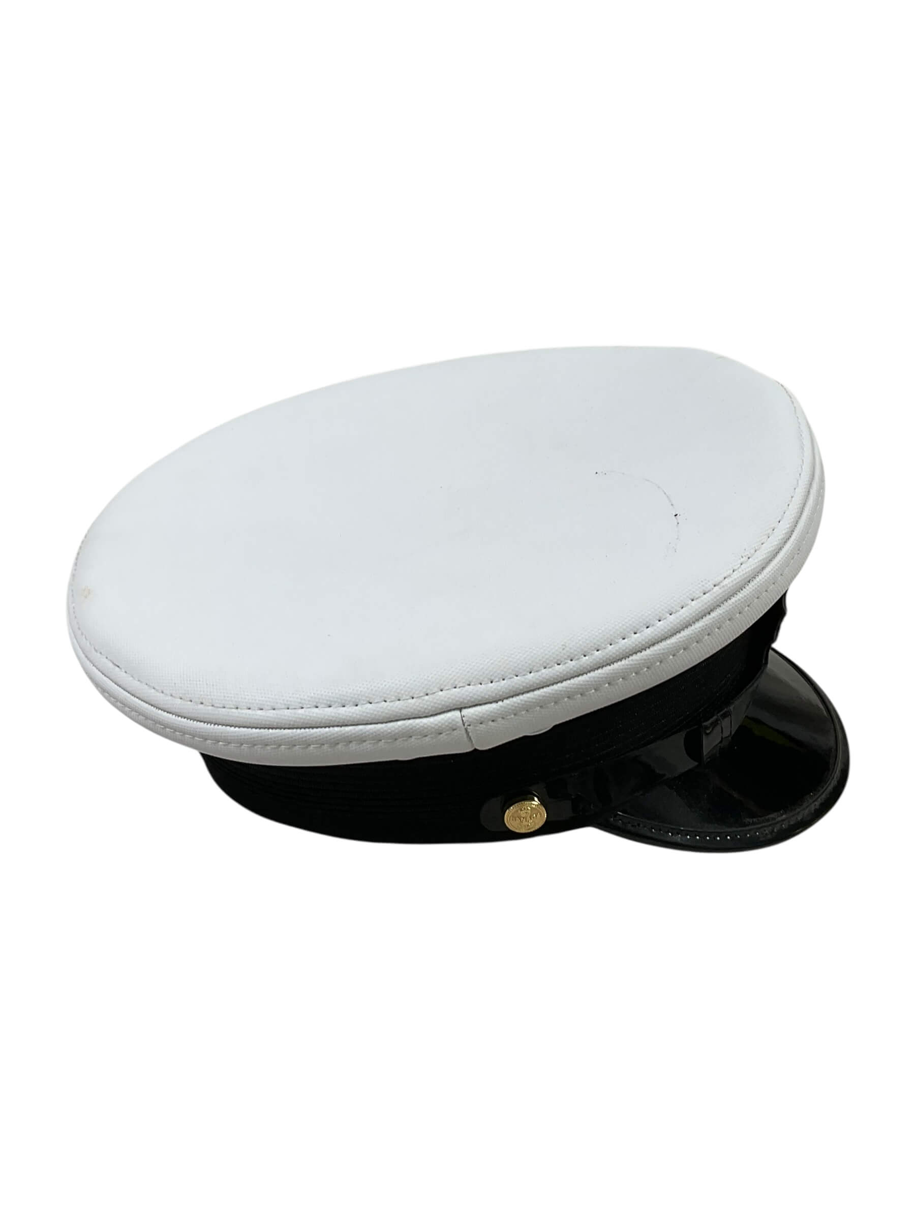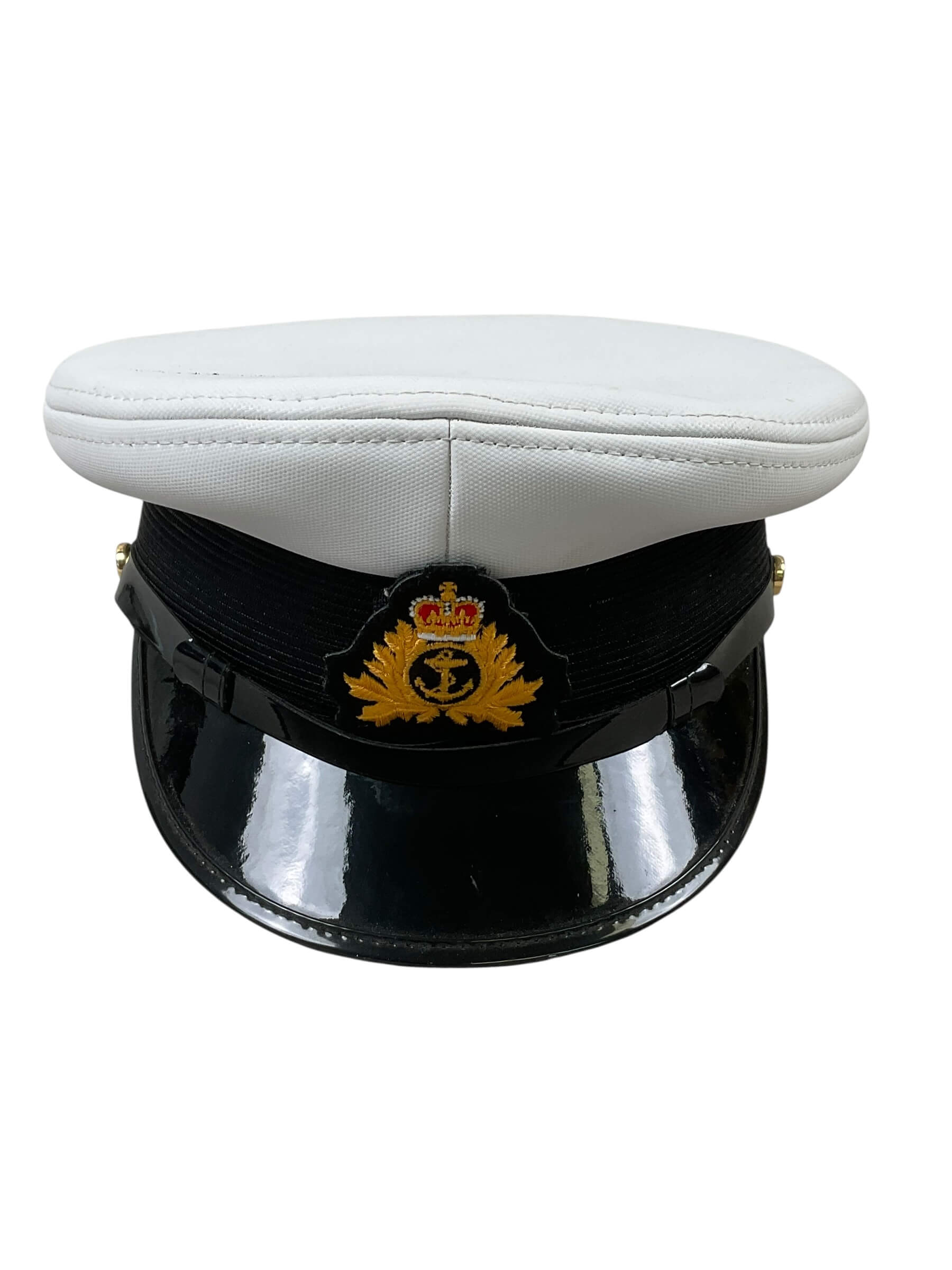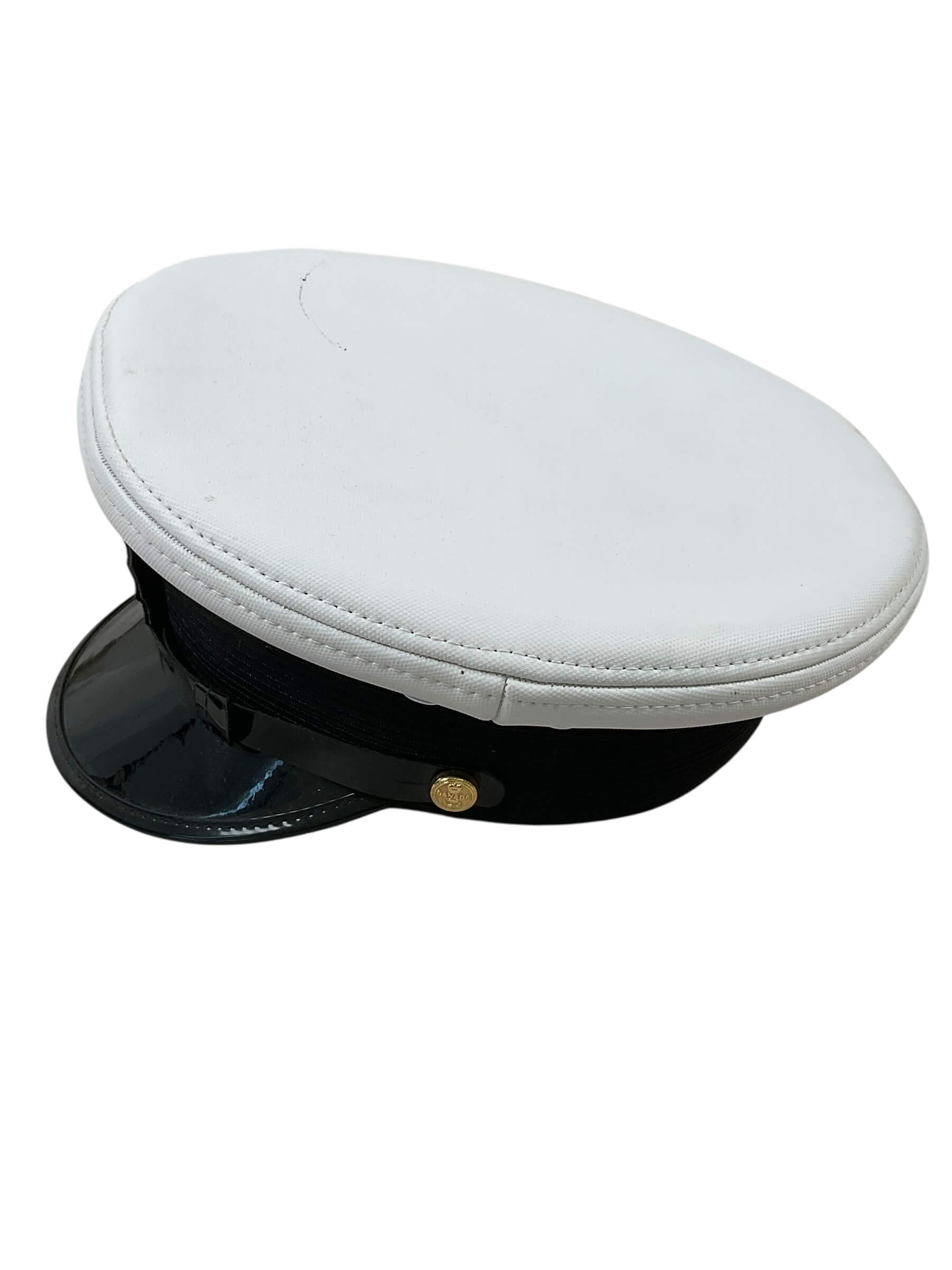 The Canadian Forces RCN Navy Peak Cap Hat Size 7 is a standard-issue element of the Royal Canadian Navy uniform. This cap is designed with a structured, rounded crown and a stiffened black peak, commonly known as a visor, providing shade and a formal appearance. The body of the hat is composed of navy blue fabric with a white top, signifying its association with naval personnel. The cap features a black chin strap secured by two side buttons and is typically adorned with a metal or embroidered cap badge representing the Royal Canadian Navy insignia. This particular cap is sized at 7 (56 cm), reflecting standard military sizing guidelines. Such caps have been in use throughout various periods of the Canadian Navy’s history and are an identifiable part of formal parade and dress uniforms. The hat exemplifies the distinctive standards of Canadian military headgear and holds relevance for historical and uniform collectors.