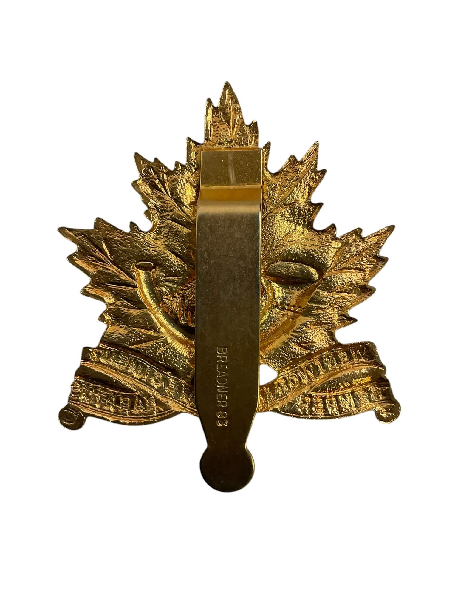 The ‘Canadian Forces Royal Hamilton Light Infantry Cap Badge’ is a meticulously crafted insignia, reflecting the rich heritage and honor of the Canadian military. It is predominantly associated with the Royal Hamilton Light Infantry, a unit of the Canadian Forces that has served with distinction in several military operations. The badge is typically made from metal and features the symbolic elements of the infantry, including the royal crown, a bugle, and a maple leaf, representing loyalty, communication, and Canadian identity respectively. It’s designed to be attached to the military cap, serving as an emblem of pride and commitment. This cap badge not only symbolizes the valor of the Canadian Forces but also serves as a tangible link to their storied past. For collectors, veterans, or active service members, it is a noteworthy item of military memorabilia.