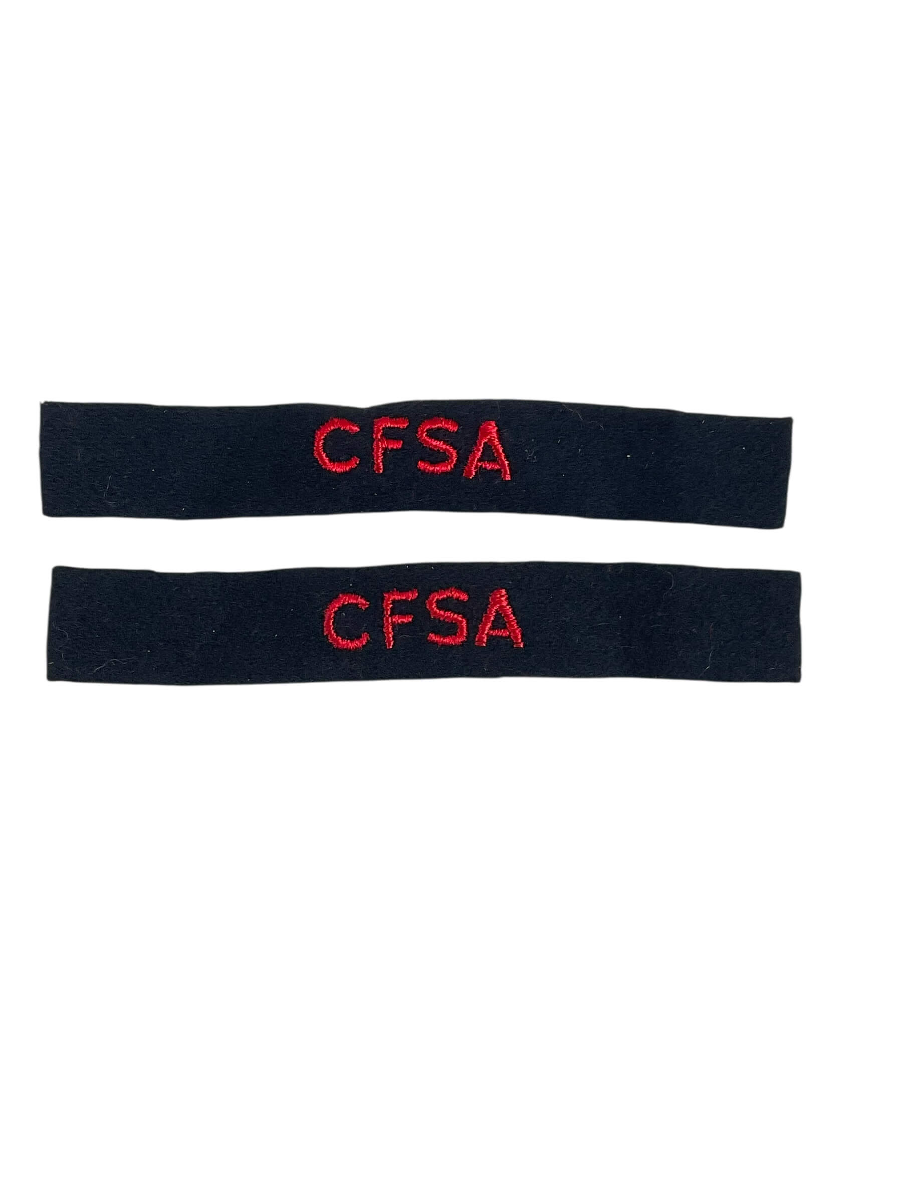 The Canadian Forces School of Artillery RCA CFSA Shoulder Titles Insignia Pair consists of two matching cloth insignia representing the Royal Canadian Artillery’s training establishment. Each shoulder title displays the abbreviation “CFSA” for the Canadian Forces School of Artillery, alongside “RCA” denoting Royal Canadian Artillery. The insignia were worn on the upper uniform sleeve to identify personnel serving with or