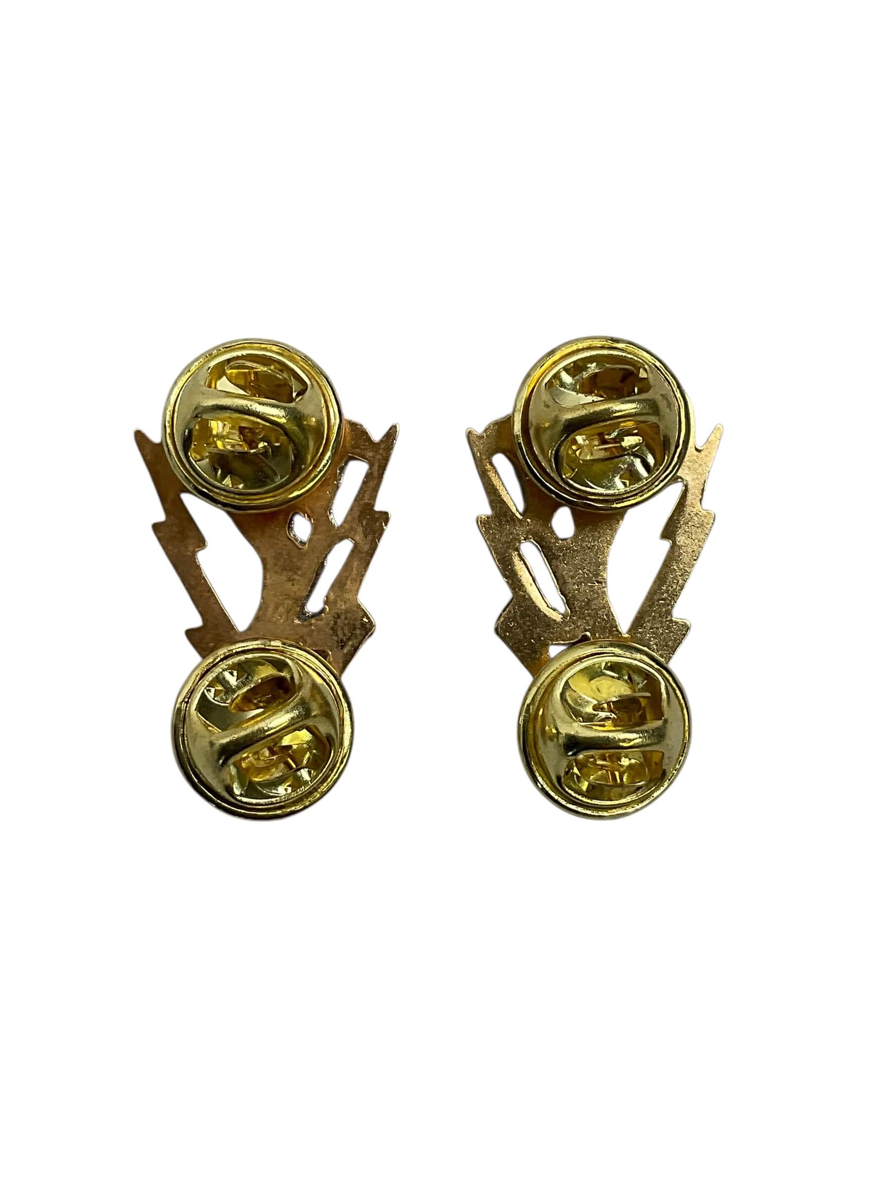 The ‘Canadian Forces Signals Collars Insignia Pair’ is a set of two military collar badges, signifying the prestigious Communications and Electronics Branch of the Canadian Forces. Each piece in this pair is meticulously crafted, depicting the traditional symbols of Mercury, the god of messages and communication, and crossed signal flags, standing for the unit’s role in signal intelligence and communication systems. Made typically from quality metal, these insignia exhibit detailed craftsmanship, usually in gold or silver tones, reflecting the honor and prestige of the Signals Branch. This pair of collar badges is not only a piece of Canadian military history but also a symbol of dedication and service to the nation. They are usually worn on the collars of military uniforms and are highly sought after by military enthusiasts, collectors of military memorabilia, and veterans.d