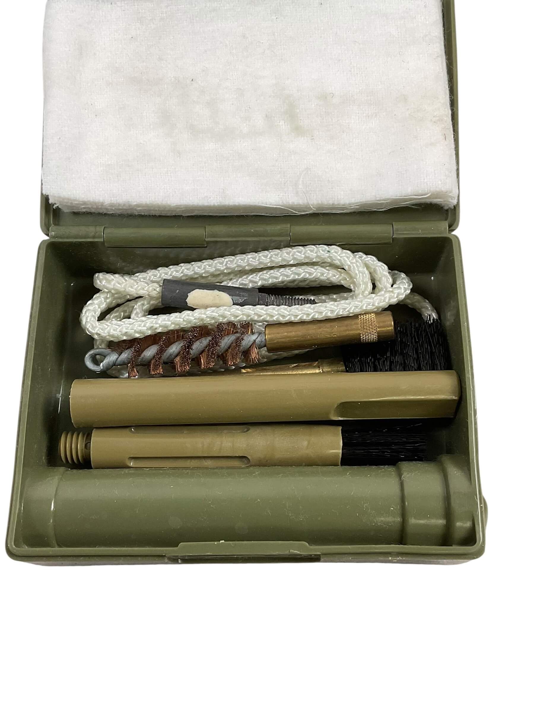 The Canadian Forces Sterling SMG Cleaning Kit with Contents is an original military-issued accessory designed for use with the Sterling submachine gun. This kit was standard issue to Canadian military personnel equipped with the Sterling SMG during its service period. The set typically includes a pull-through cleaning chain, wire brush, oil bottle, and other essential maintenance tools, all contained within a compact, durable case for easy transport and organization. Each tool is tailored for the cleaning and upkeep of the Sterling SMG, ensuring reliable function and longevity of the firearm. The kit reflects Canadian Forces specifications and standards for field maintenance equipment during the Cold War and later decades. These cleaning kits are valued by collectors and military enthusiasts for their historical connection and practical design, representing a key component of the support gear issued to Canadian service members who used the Sterling submachine gun.