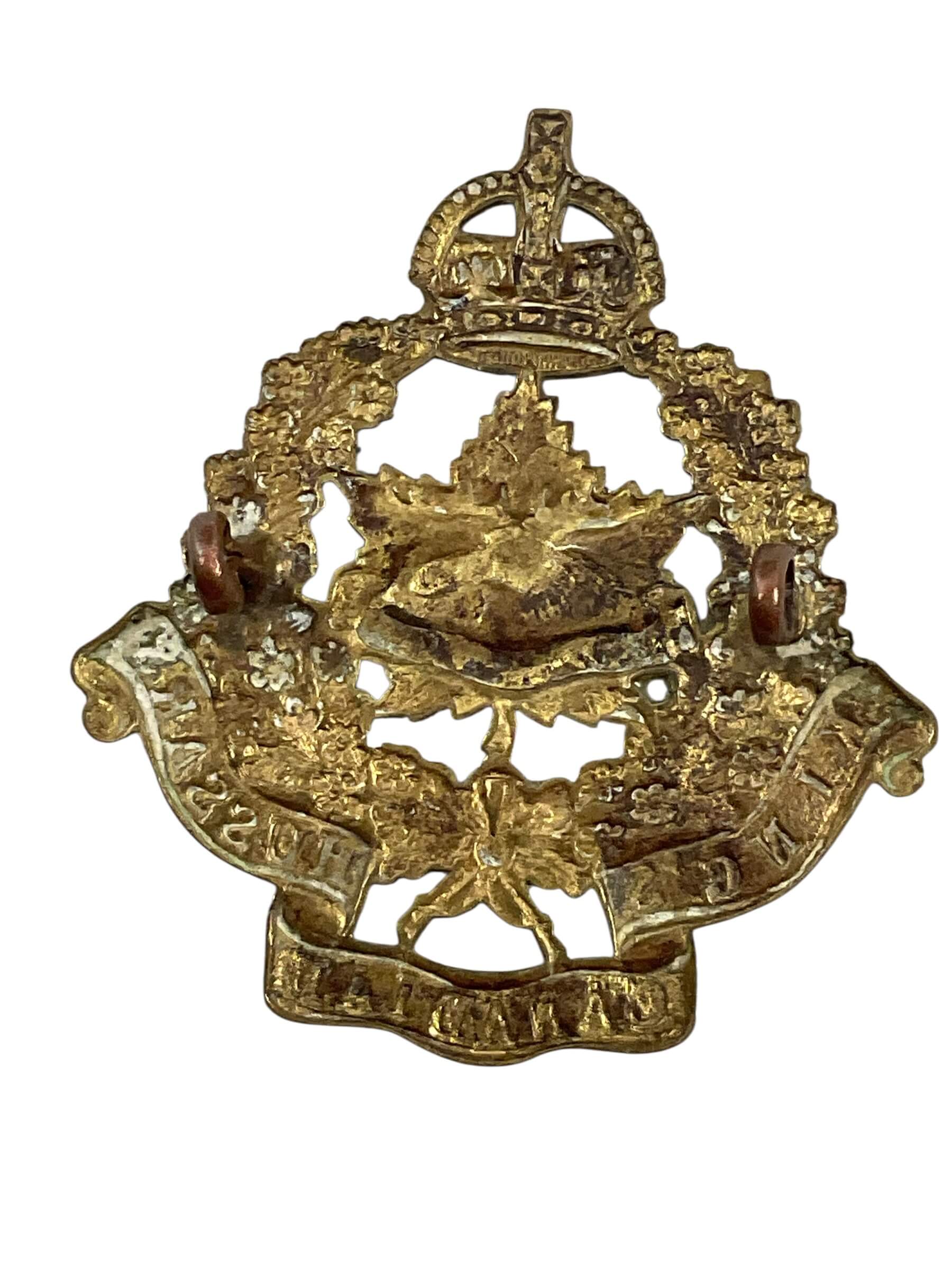 The Canadian King’s Regiment Cap Badge is a military insignia historically associated with the Canadian King’s Regiment. Typically manufactured from brass or white metal, the badge features a central motif representative of the regiment, often incorporating national or regimental symbols such as a crown or maple leaf. The design reflects the regiment’s affiliation and era of service, with details including specific emblems, mottoes, and scrollwork unique to the unit’s identity. Cap badges like this served as an essential part of the regimental headdress, denoting the wearer’s unit and rank within the Canadian military structure. Such badges were used throughout periods of active service and ceremonial duties, providing a visible sign of allegiance and pride. The construction and design details help to identify the regiment and period, making it a notable example for collectors and historians interested in Canadian military heritage. Dimensions and securing mechanisms may vary depending on the production period and specific issuing regulations.