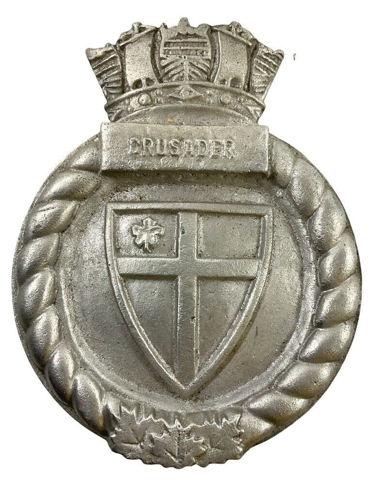 This unique artifact is a distinguished aluminum ship’s crest from the HMCS Crusader, honoring its service during the Korean War. Measuring 6 1/2 inches by 5 1/4 inches, this crest represents a piece of Canadian naval history, capturing the bravery and dedication of the crew who served on the HMCS Crusader. The detailed craftsmanship of the aluminum highlights its historical significance and durability, making it an exceptional collectible for history enthusiasts and naval memorabilia collectors alike. This crest stands as a tribute to the valor and commitment of the Royal Canadian Navy during a crucial period, offering an authentic connection to Canada’s military past. It’s an ideal addition for those looking to preserve and honor the legacy of the Korean War and the gallant vessel that played a pivotal role in it.