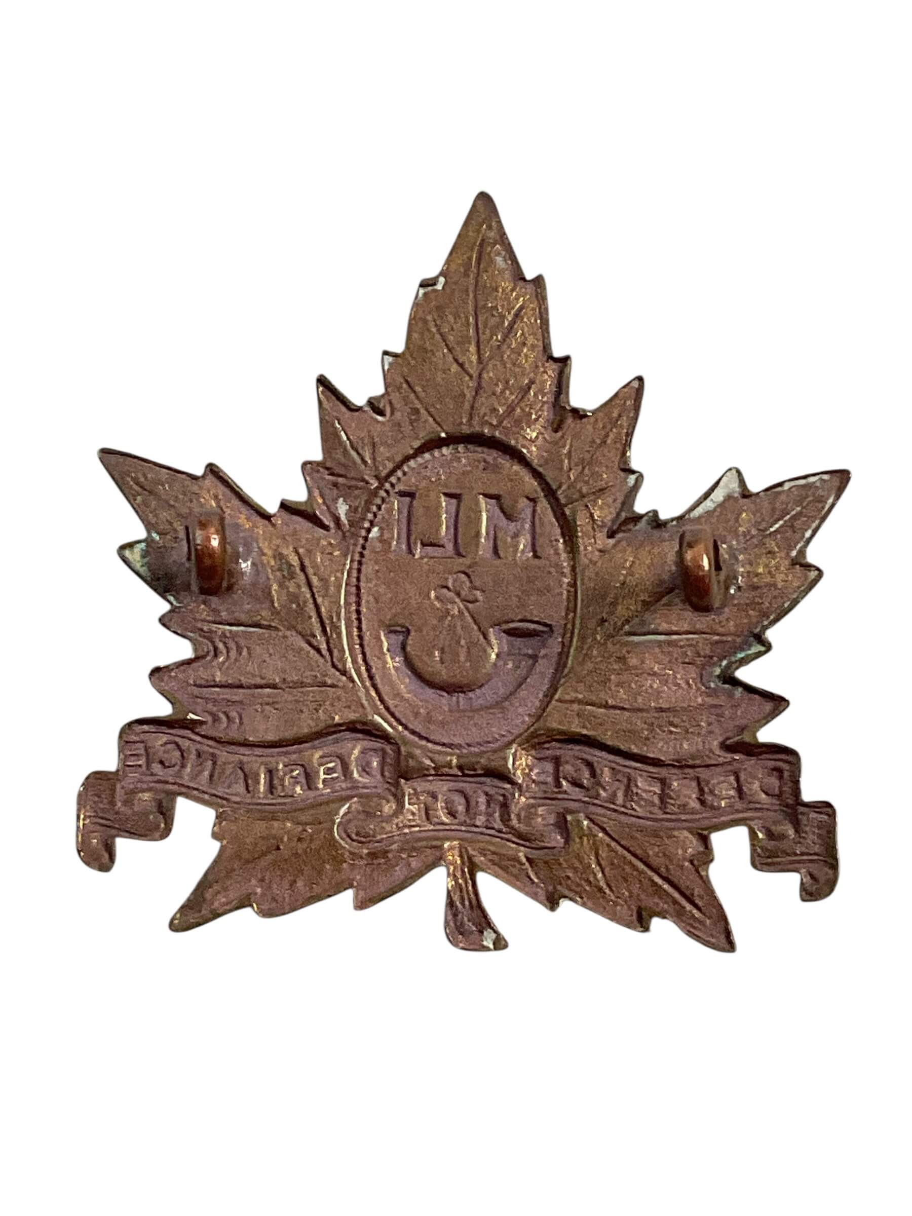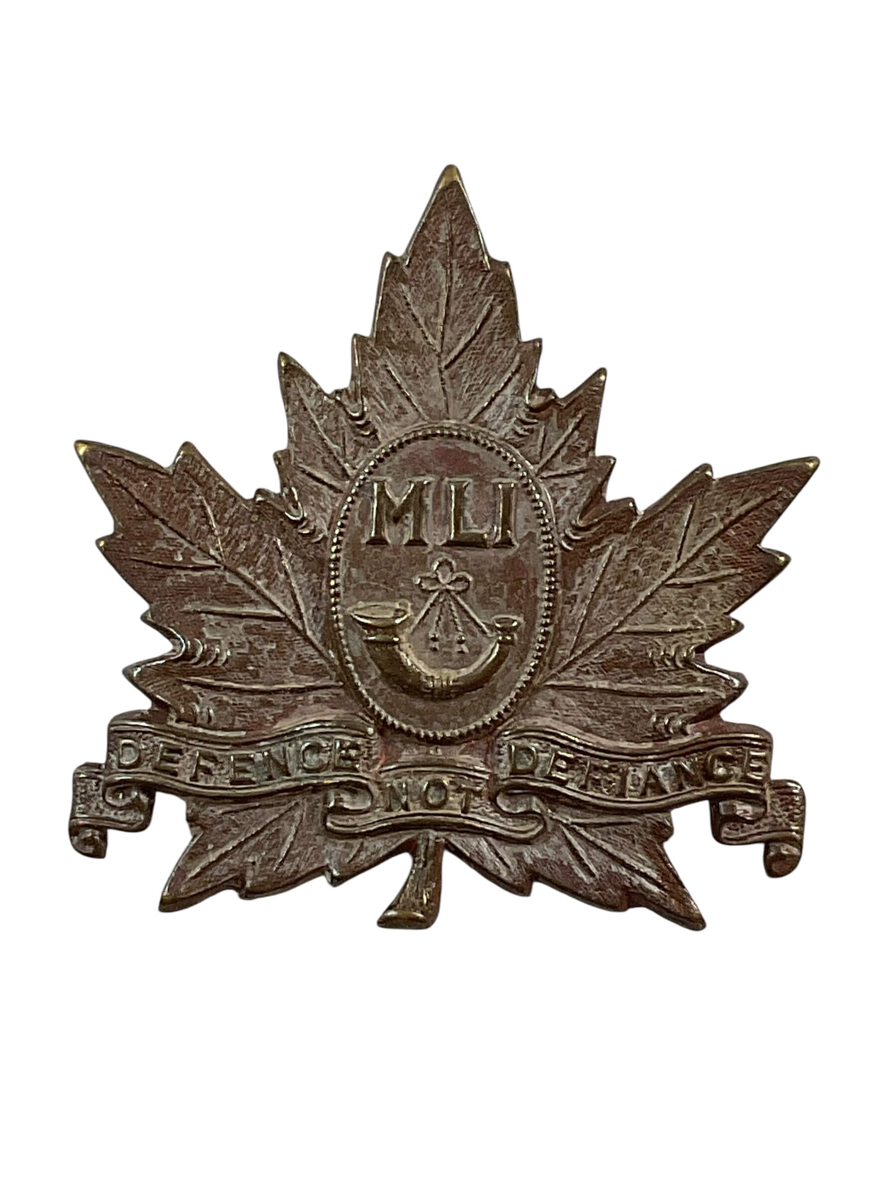 The Canadian Middlesex Light Infantry Cap Badge is a First or Second World War era military insignia associated with the Middlesex Light Infantry regiment of Canada. Typically constructed from brass or bronze, the badge features a central maple leaf motif, symbolizing Canada, with the regimental title displayed on a scroll. The design sometimes includes a crown, indicating service under the British monarchy. This cap badge was worn by members of the regiment on their standard issue service caps, serving as a means of identification and unit pride. The Middlesex Light Infantry operated primarily within the Canadian Militia, later becoming part of larger formations following subsequent military reorganizations. Cap badges such as this one provide insight into the structure and traditions of Canadian military units during the early 20th century. Measurements and fastening methods may vary slightly depending on the period and manufacturer, typically including lugs or a slider to attach to headgear.