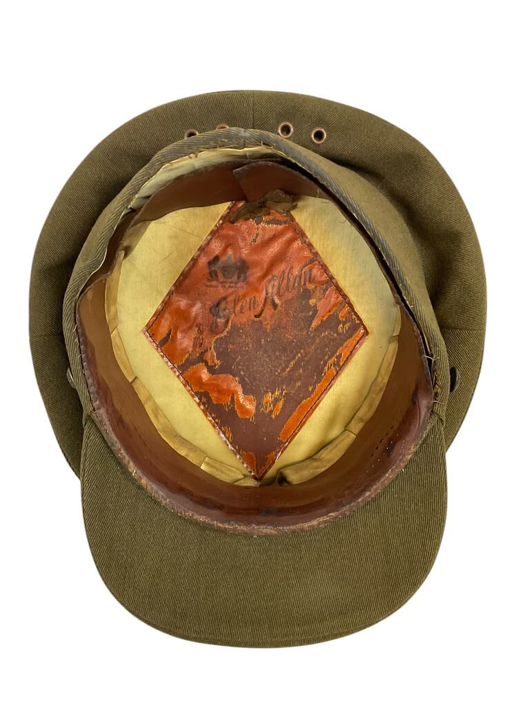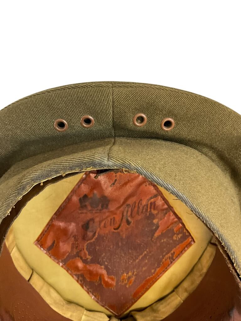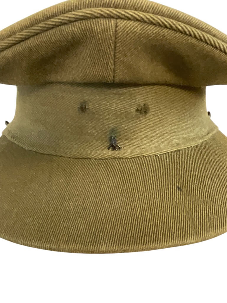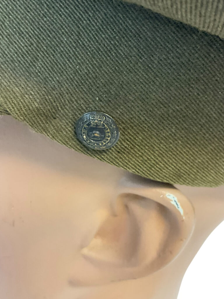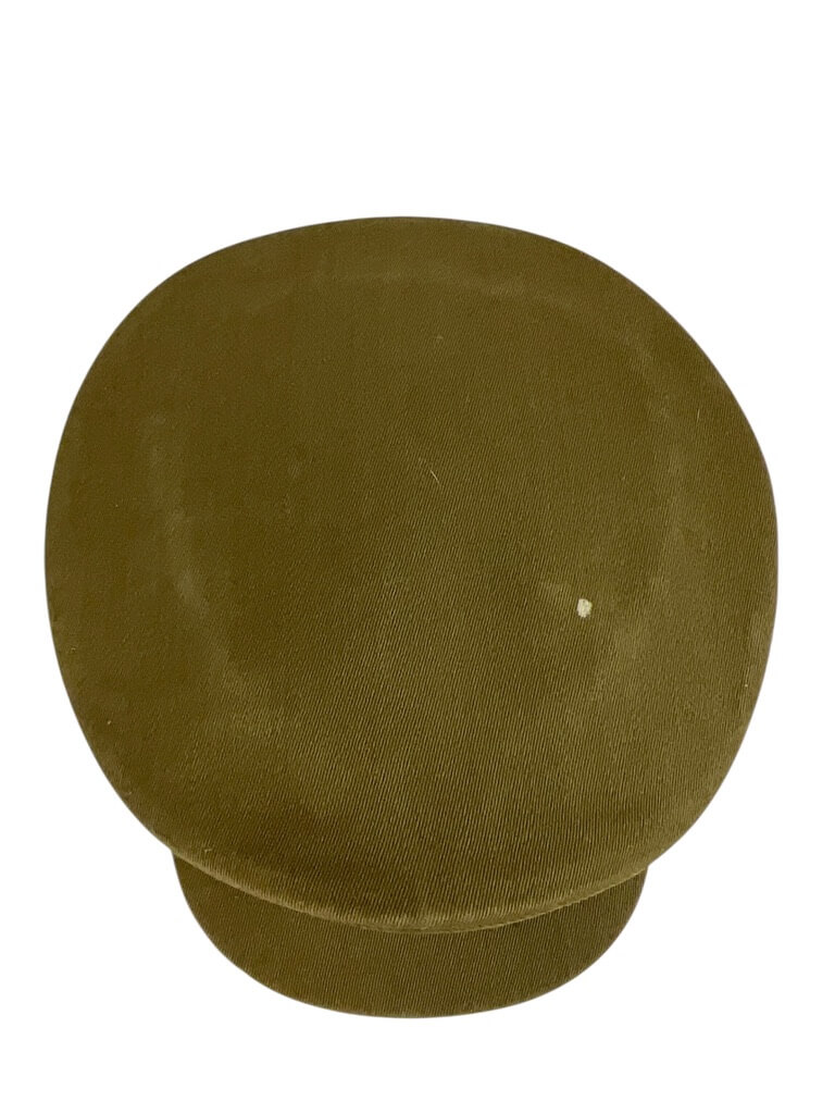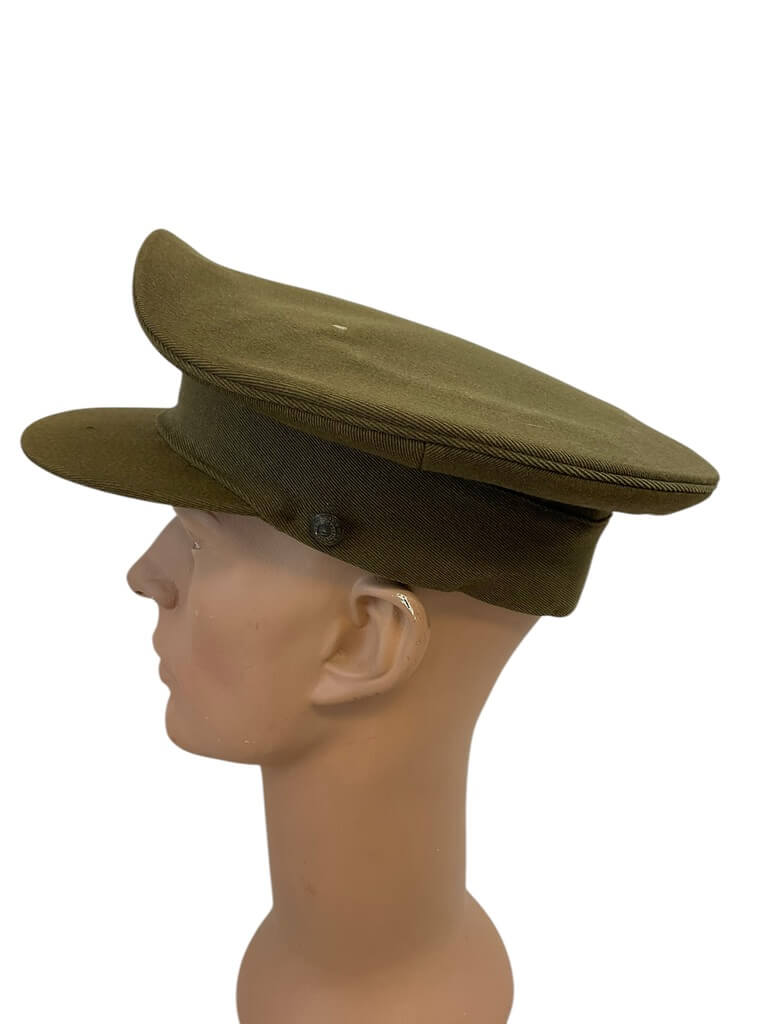 This item is a Canadian Militia Army Officers Peak Cap Hat, in a size 7. The cap, a key part of the official uniform, showcases the robust history of Canada’s military forces. It features a distinctive peaked design, also known as a visor cap, which was traditionally worn by officers. The cap is primarily in khaki  color, further enhanced by the Canadian Militia’s buttons on the side. Unfortunately, the cap is missing its original chin strap, which would have ensured a secure fit. Despite this, the cap remains in good condition, offering a unique addition to any military memorabilia collection or for those interested in Canadian history.