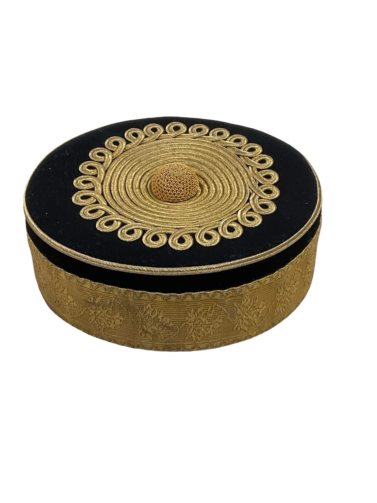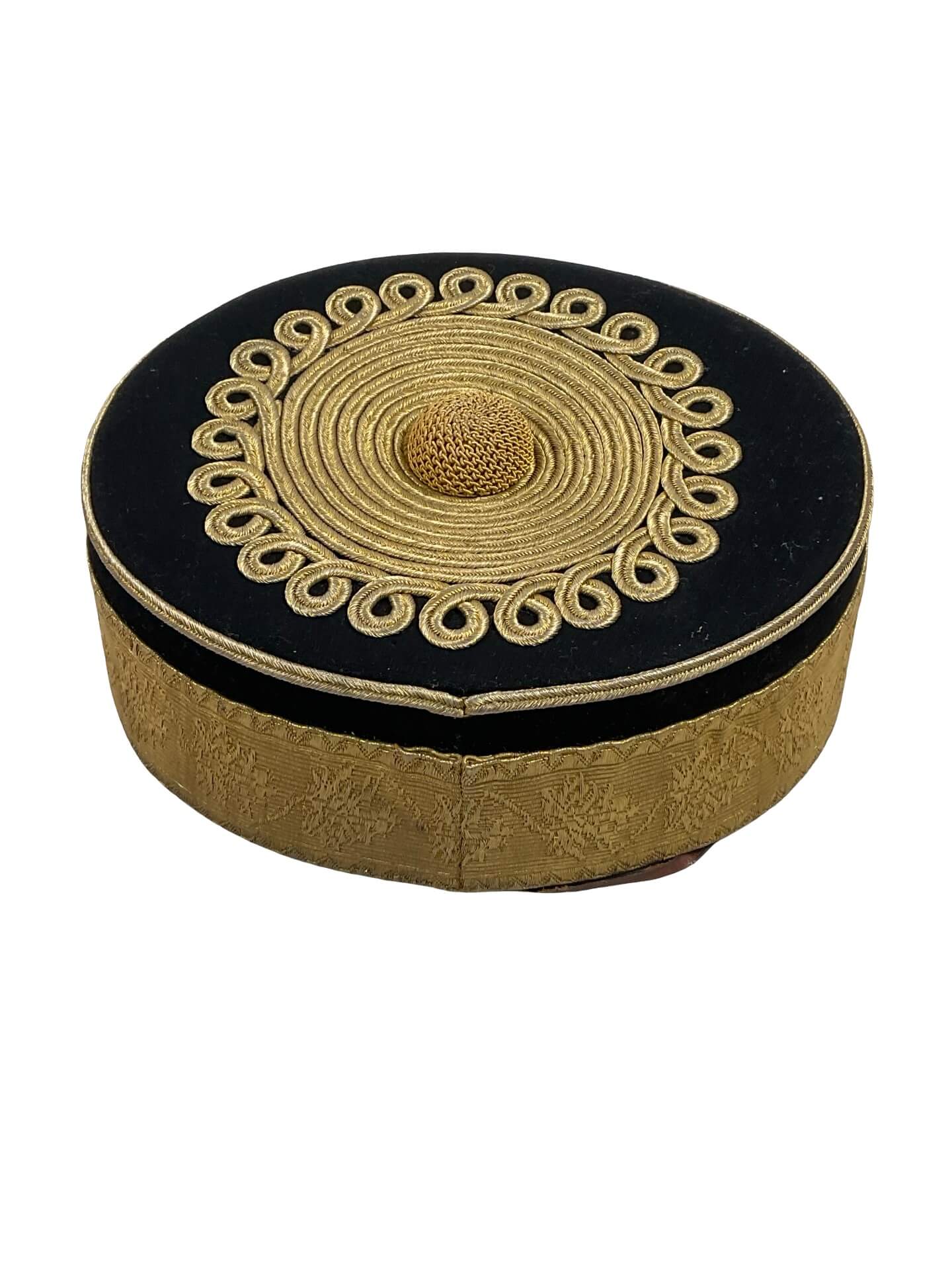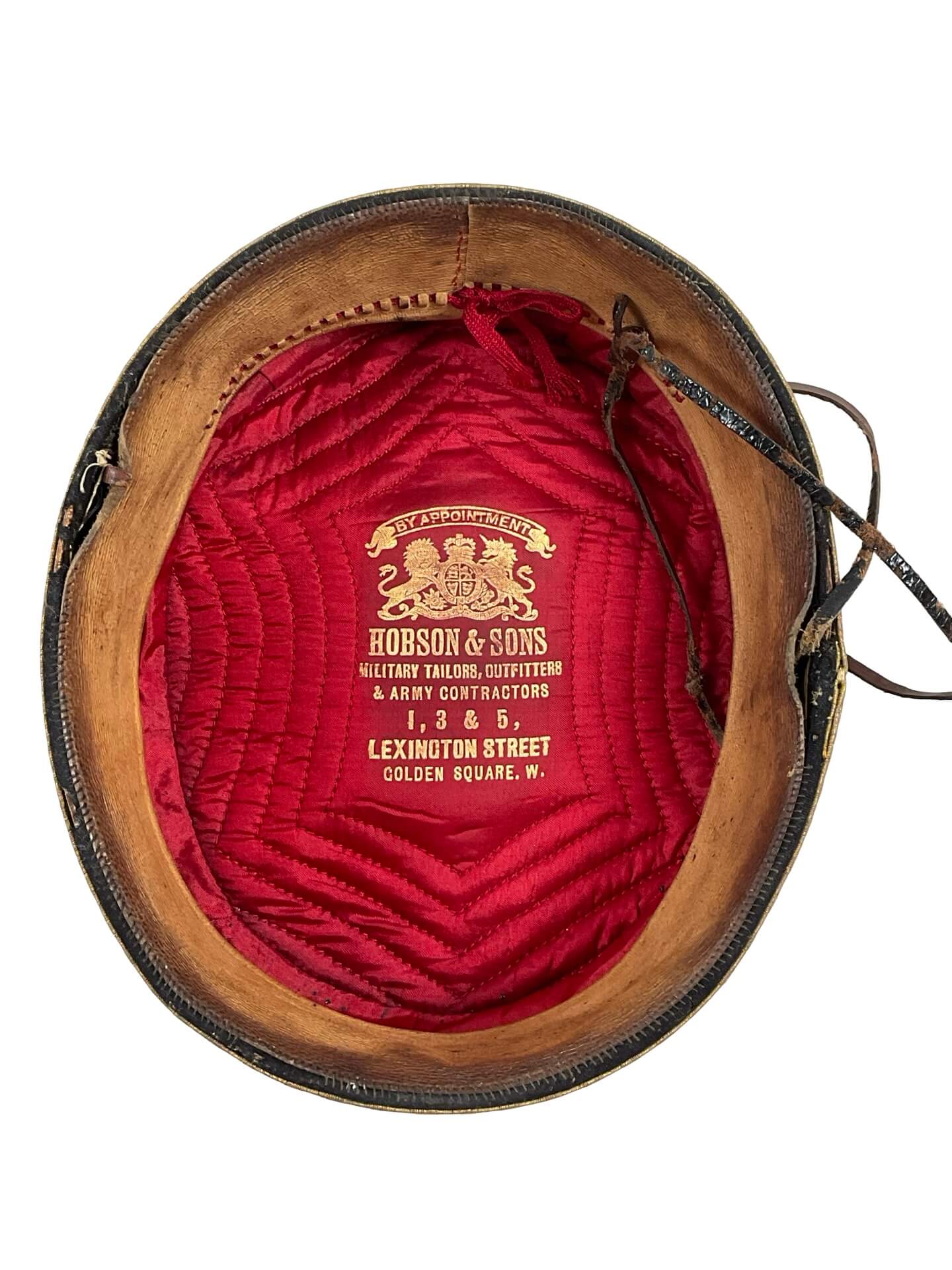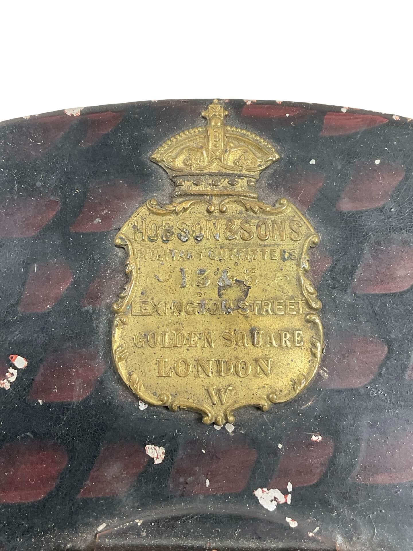The Canadian Militia Cavalry Officer’s Pill Box Hat by Hobsons is a historical military headgear item distinguished by its cylindrical shape and flat crown. This specimen features a maple leaf lace design, an emblematic motif associated with Canadian military identity. The hat is constructed with traditional materials common to late 19th and early 20th-century officer uniforms, likely incorporating wool felt, with decorative bullion lace and a colored band signifying the cavalry branch. The presence of the Hobsons maker’s mark indicates manufacture by the noted British military outfitters, suppliers to Commonwealth regiments during the period. Such pill box hats were worn as part of the undress or ceremonial uniform by officers in the Canadian Militia’s cavalry units. The maple leaf motif further denotes national symbolism, reflecting Canadian service. These hats are significant both as part of Canadian military uniform history and as representative of British-Canadian military collaboration in the era preceding the First World War.
