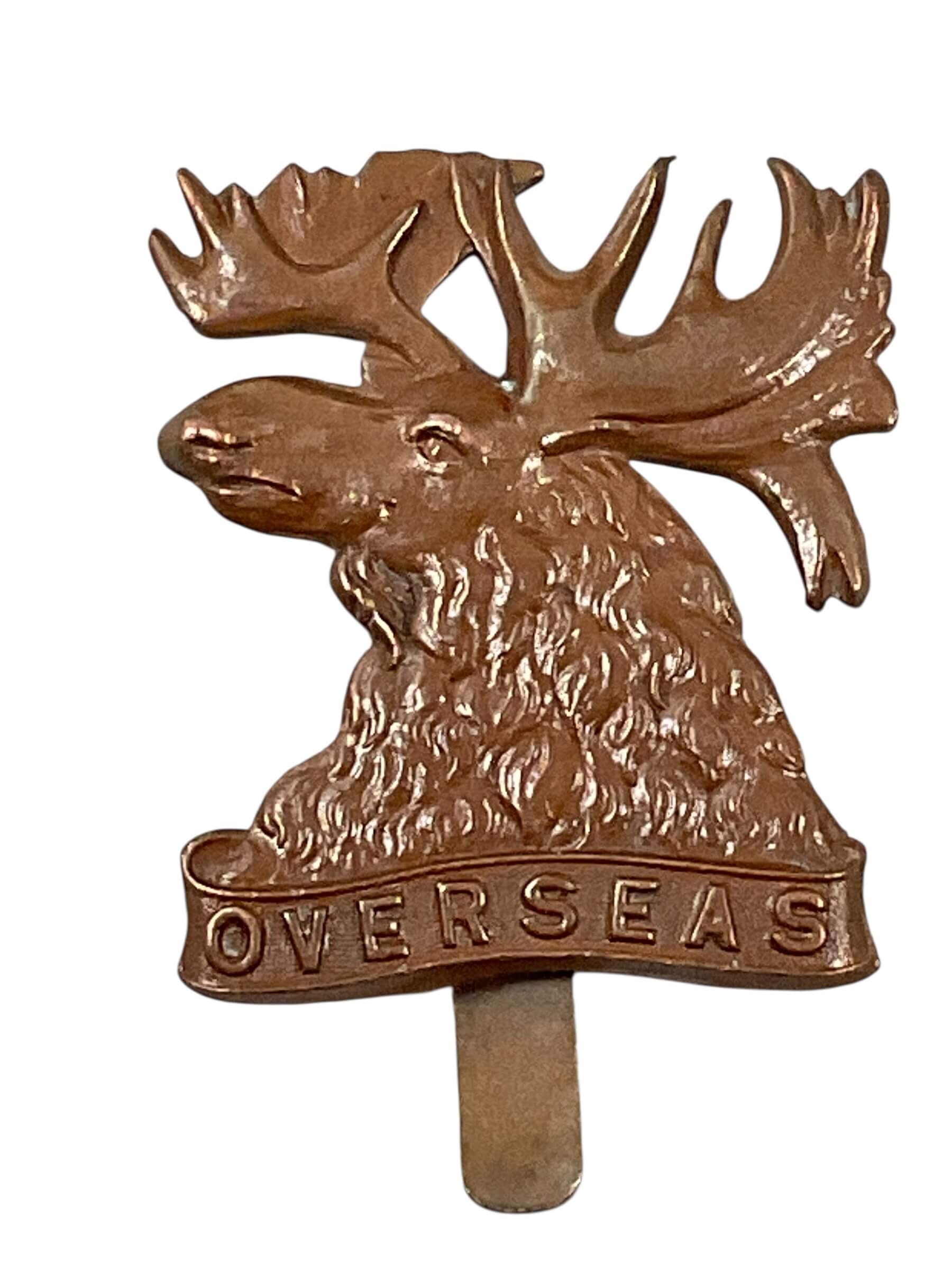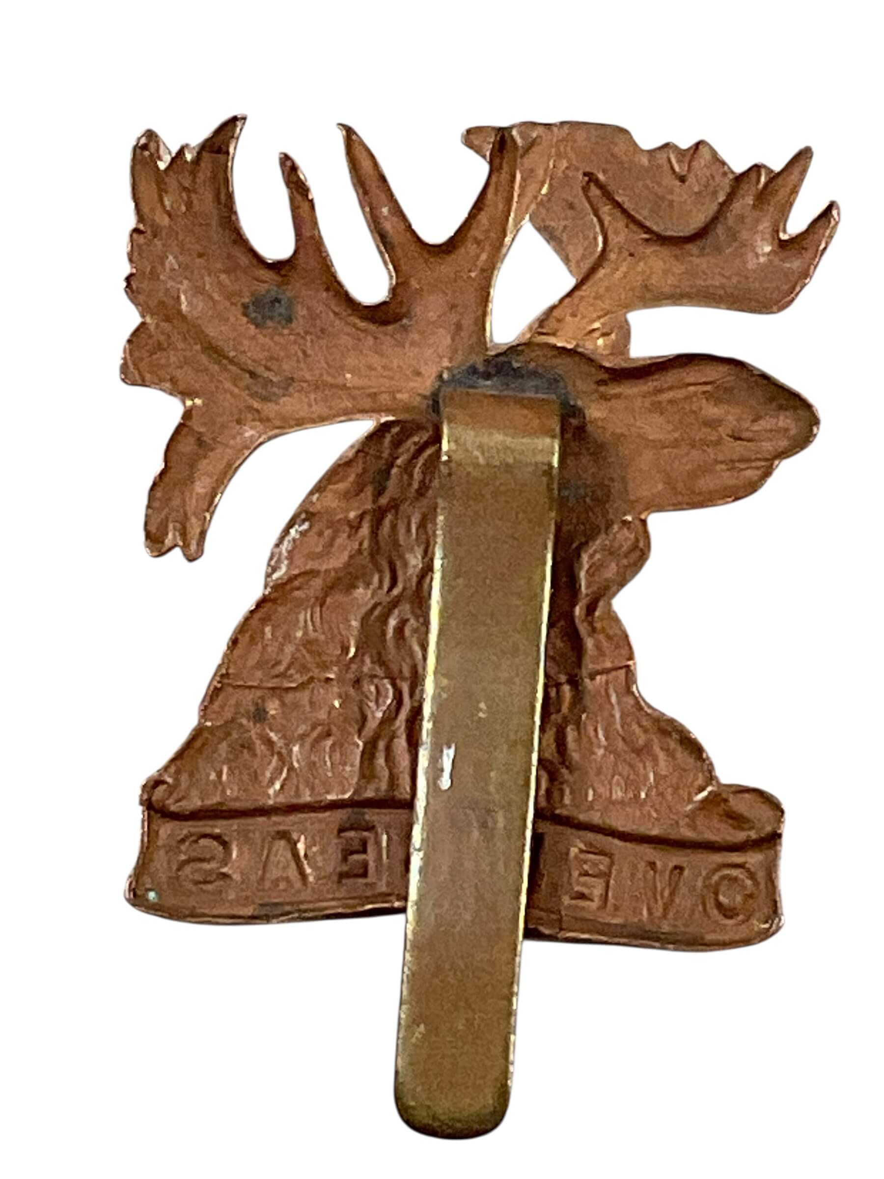 The Canadian Mounted Rifles Cap Badge is a piece of military insignia issued to members of the Canadian Mounted Rifles during the late 19th and early 20th centuries. Typically constructed from brass or bronze, the badge features design elements reflecting the unit’s mounted infantry role within the Canadian Army. Central motifs often include a crown, regimental initials, a scroll bearing the unit’s title, and crossed rifles, symbolizing the regiment’s dual expertise in cavalry and infantry tactics. The cap badge was worn on the service dress cap and served as both a means of identification and an emblem signifying regimental pride. The Canadian Mounted Rifles notably participated in conflicts such as the Second Boer War and the early years of the First World War. Cap badges of this type are of interest to collectors and historians due to their association with Canada’s evolving military traditions and the transition from mounted units to modern mechanized forces.