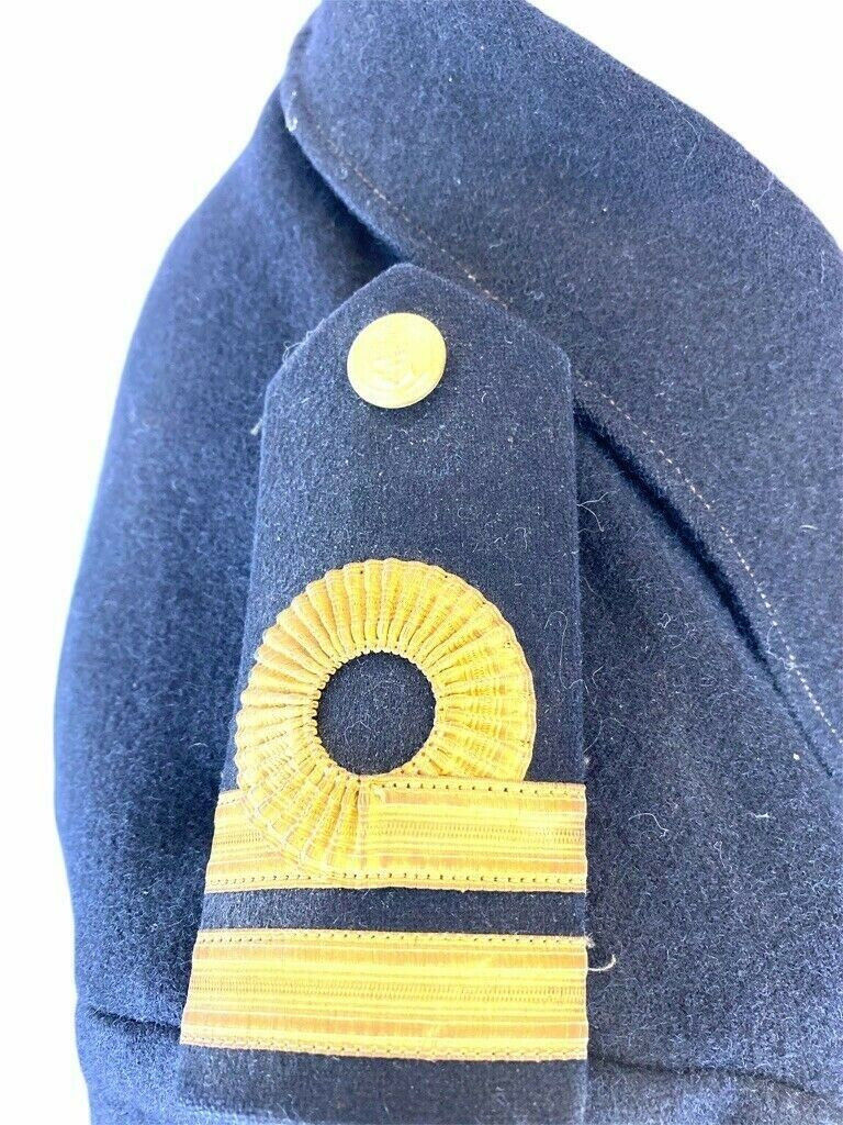 The “Canadian Navy RCN Korean War Era Officers Black Wool Battle Dress and Trousers” is a historically authentic, meticulously crafted military garment set, emblematic of Canadian Naval officers during the Korean War. This ensemble includes the battle dress jacket and matching trousers, both composed of premium quality black wool, ensuring durability and warmth in various conditions. The battle dress is complete with all original buttons, adding to its authenticity and vintage appeal. Though not named, this set stands as a poignant testament to the dedication and bravery of Canadian naval officers of the era, making it an invaluable piece for military historians, collectors, and enthusiasts alike. Its timeless design encapsulates the spirit and tradition of the Royal Canadian Navy during a significant period in history.