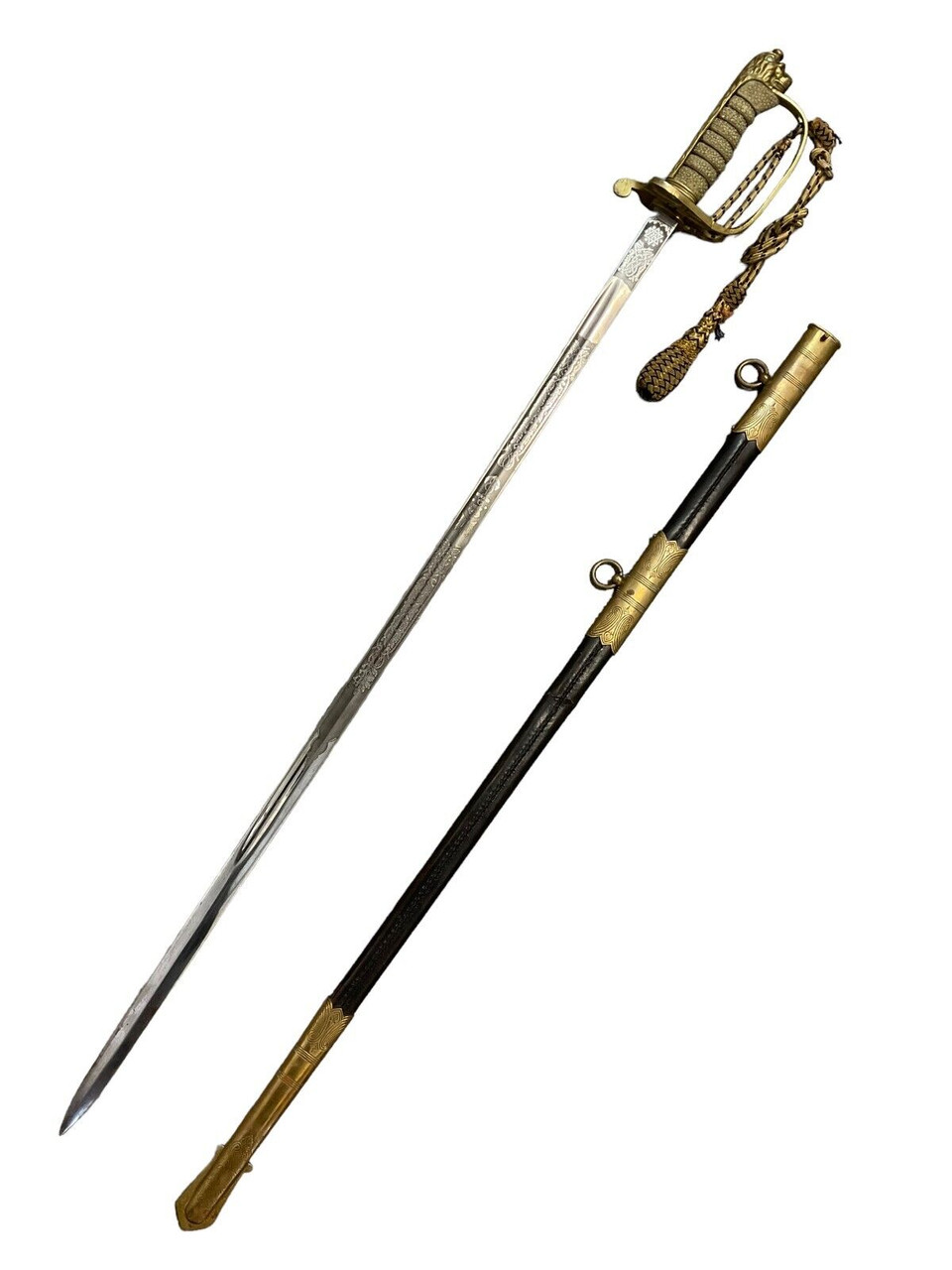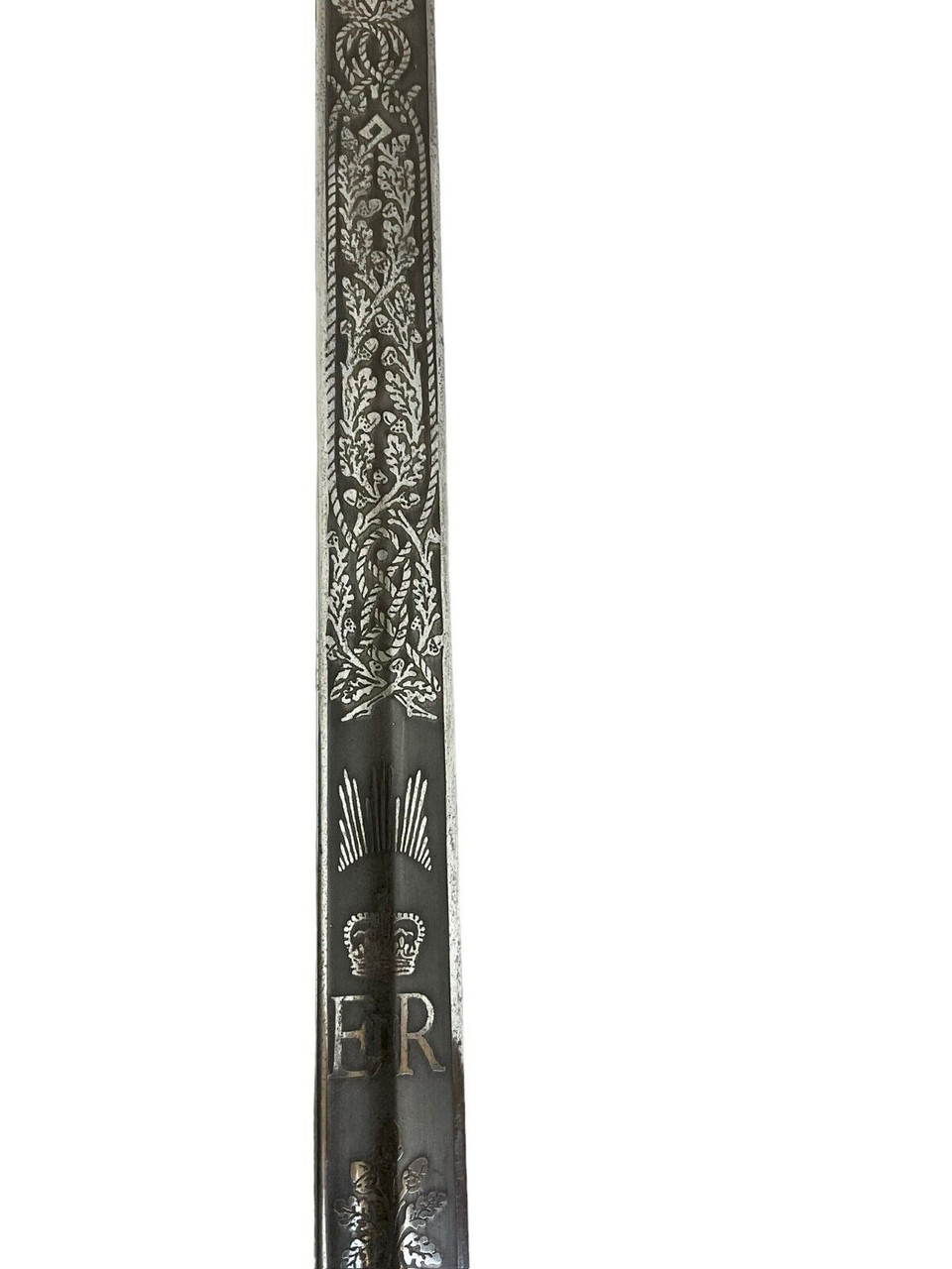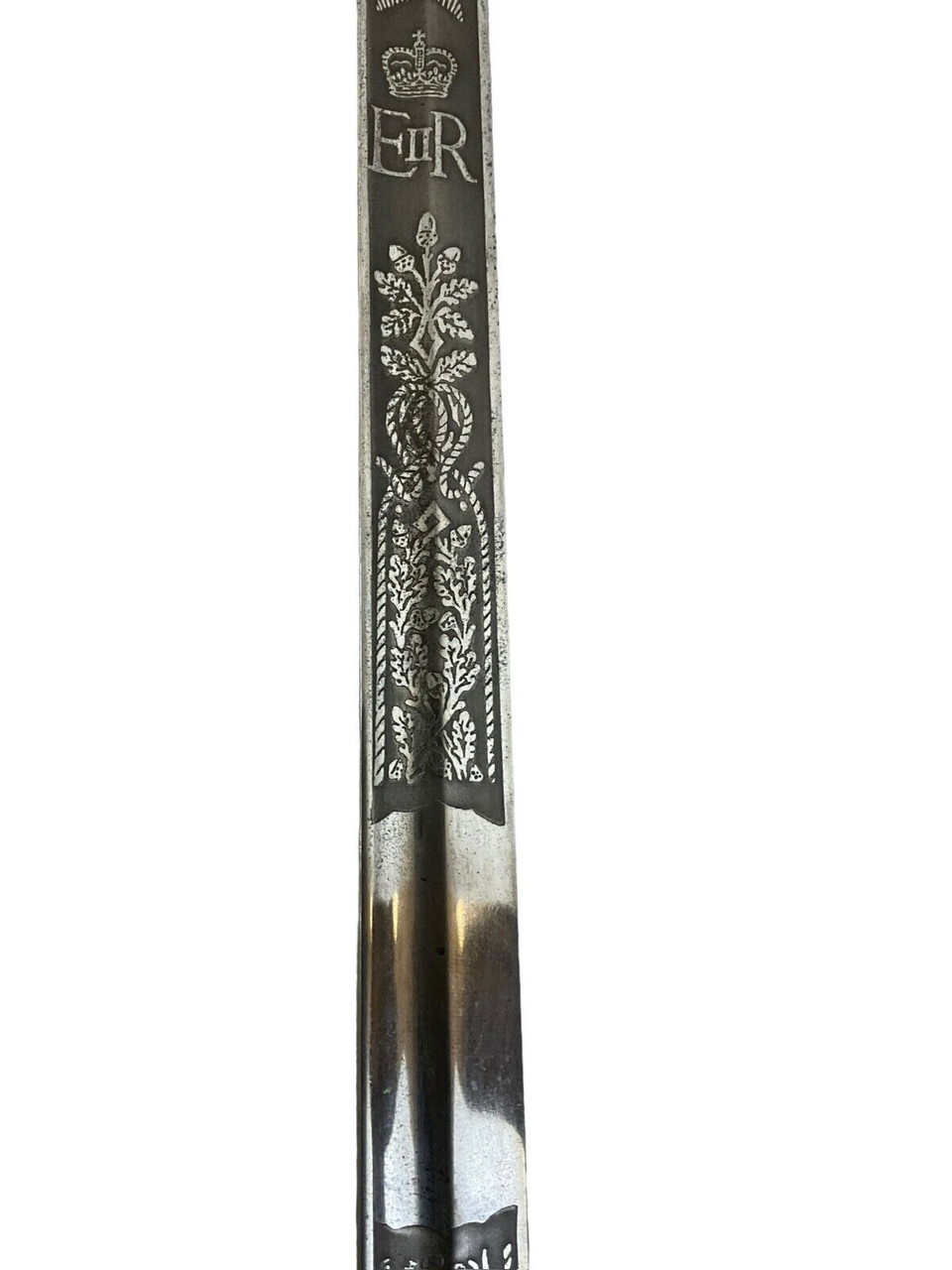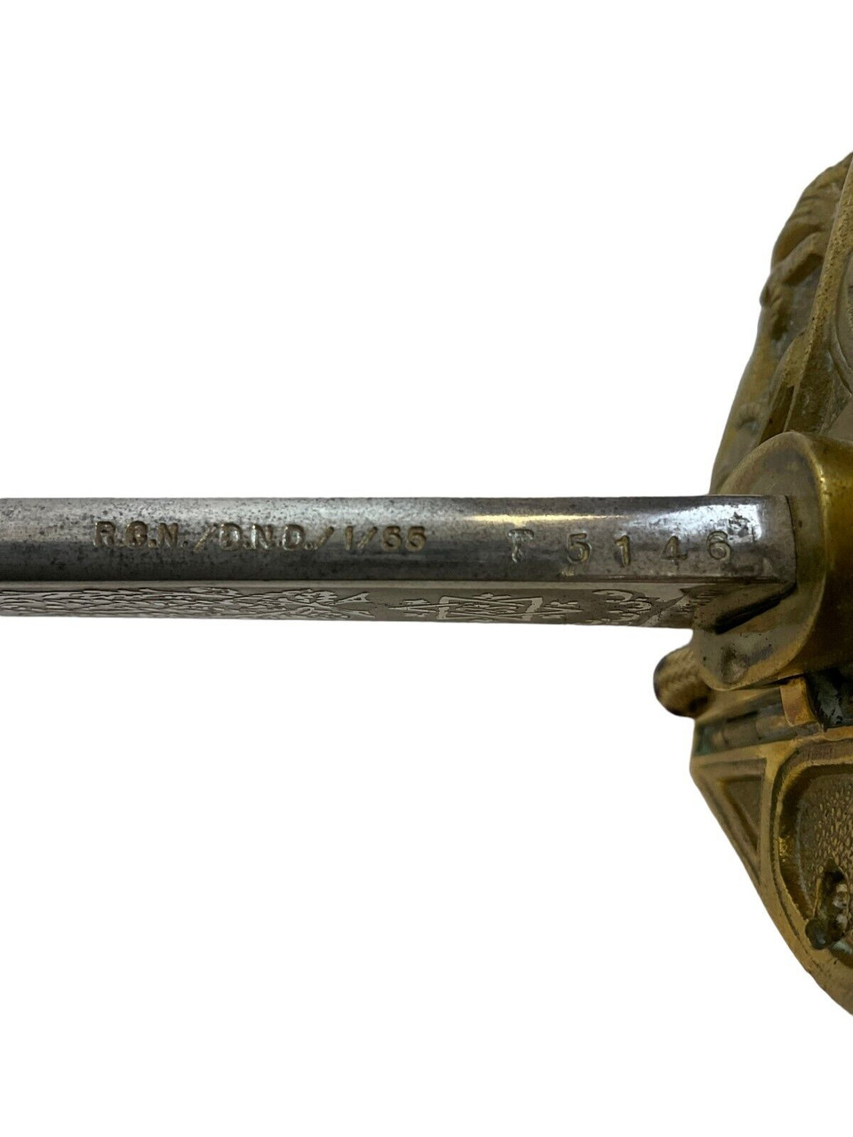 This exquisite Canadian Navy RCN Officers Sword, crafted by the renowned Wilkinson Sword Company, is a remarkable piece of military history dated to 1955. The sword showcases superior craftsmanship typical of Wilkinson’s celebrated legacy, featuring a meticulously detailed brass hilt adorned with intricate naval insignia. The blade glistens with a mirror-like polish, bearing Wilkinson’s hallmark and the 1955 date, reflecting the era’s high standards of production. Accompanied by its original scabbard, this piece remains in exceptional condition, offering a striking visual appeal and historical significance. The scabbard itself is designed for durability and ease of carry, complementing the elegance and functionality of the sword. This artefact is not only a symbol of naval prestige but also a collector’s treasure, representing the proud heritage of the Royal Canadian Navy. Ideal for enthusiasts of military memorabilia, this officer’s sword is a timeless testament to mid-20th century naval tradition and excellence.