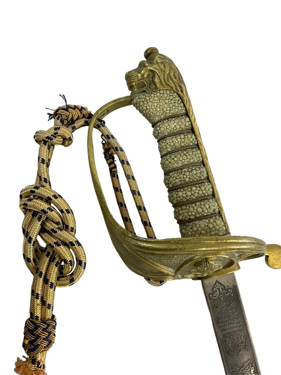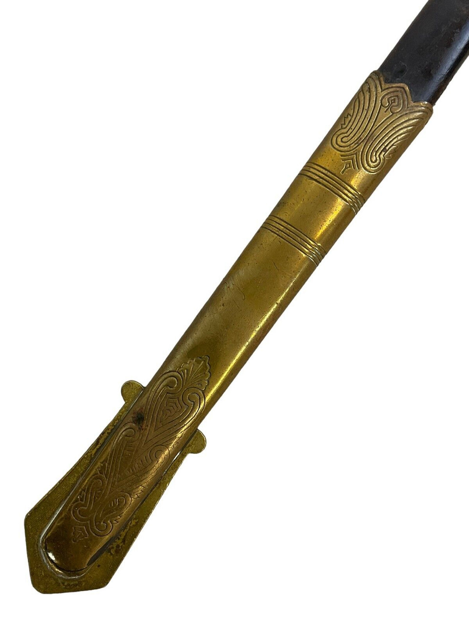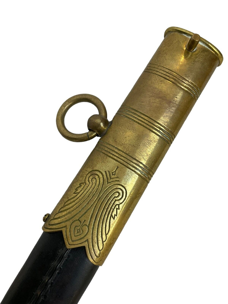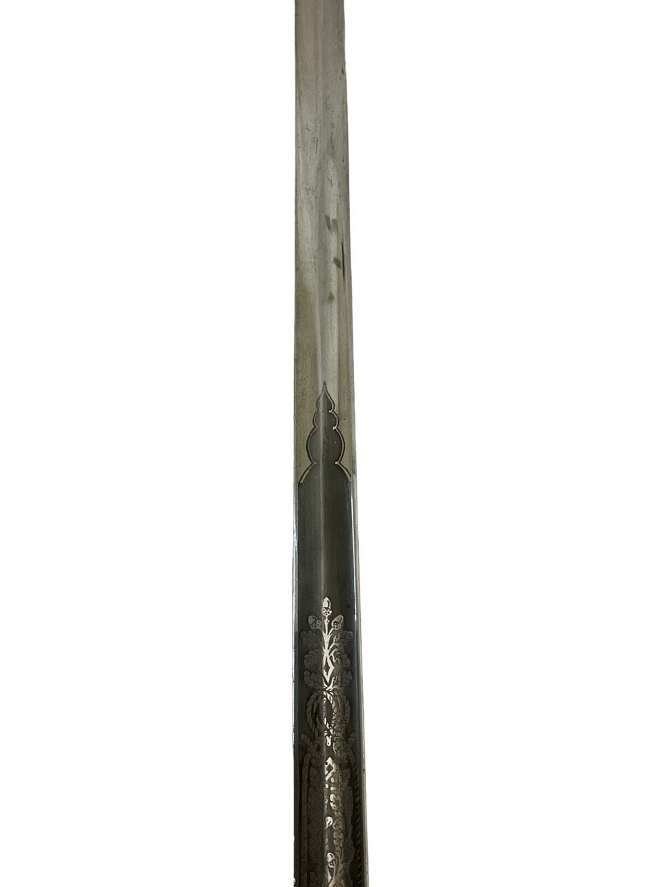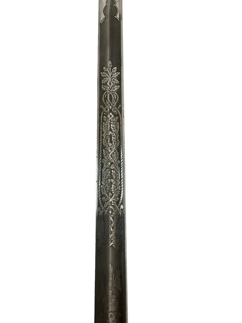 This exquisite Canadian Navy RCN Officers Sword, crafted by the renowned Wilkinson Sword Company, is a remarkable piece of military history dated to 1955. The sword showcases superior craftsmanship typical of Wilkinson’s celebrated legacy, featuring a meticulously detailed brass hilt adorned with intricate naval insignia. The blade glistens with a mirror-like polish, bearing Wilkinson’s hallmark and the 1955 date, reflecting the era’s high standards of production. Accompanied by its original scabbard, this piece remains in exceptional condition, offering a striking visual appeal and historical significance. The scabbard itself is designed for durability and ease of carry, complementing the elegance and functionality of the sword. This artefact is not only a symbol of naval prestige but also a collector’s treasure, representing the proud heritage of the Royal Canadian Navy. Ideal for enthusiasts of military memorabilia, this officer’s sword is a timeless testament to mid-20th century naval tradition and excellence.