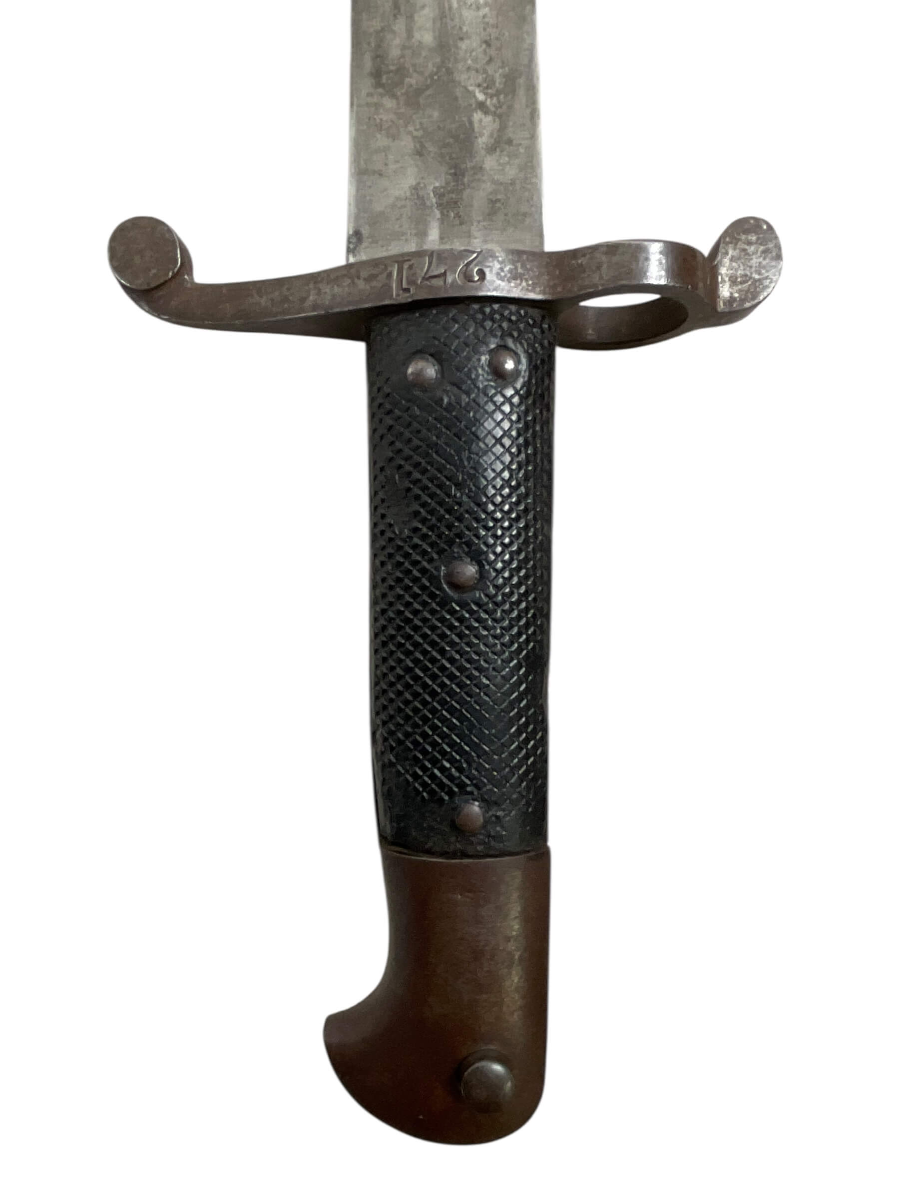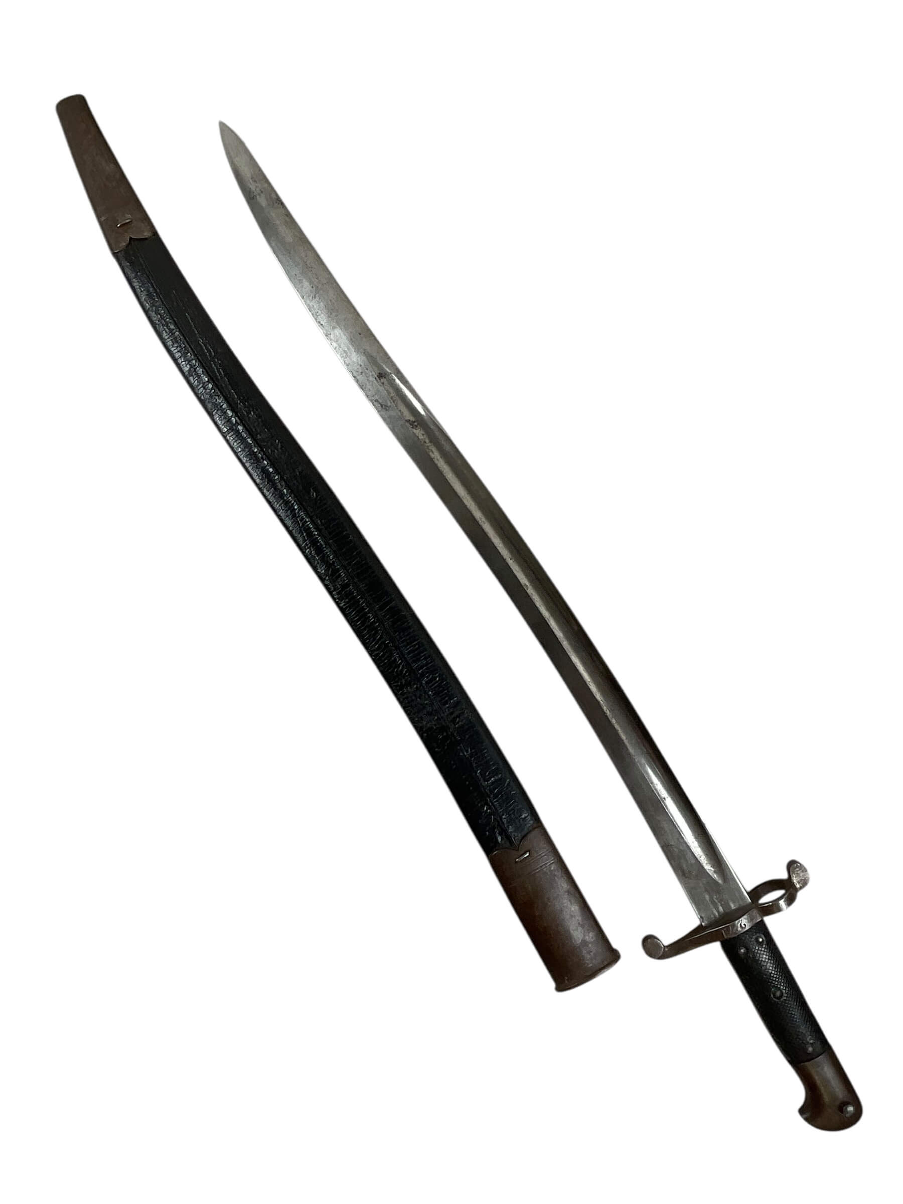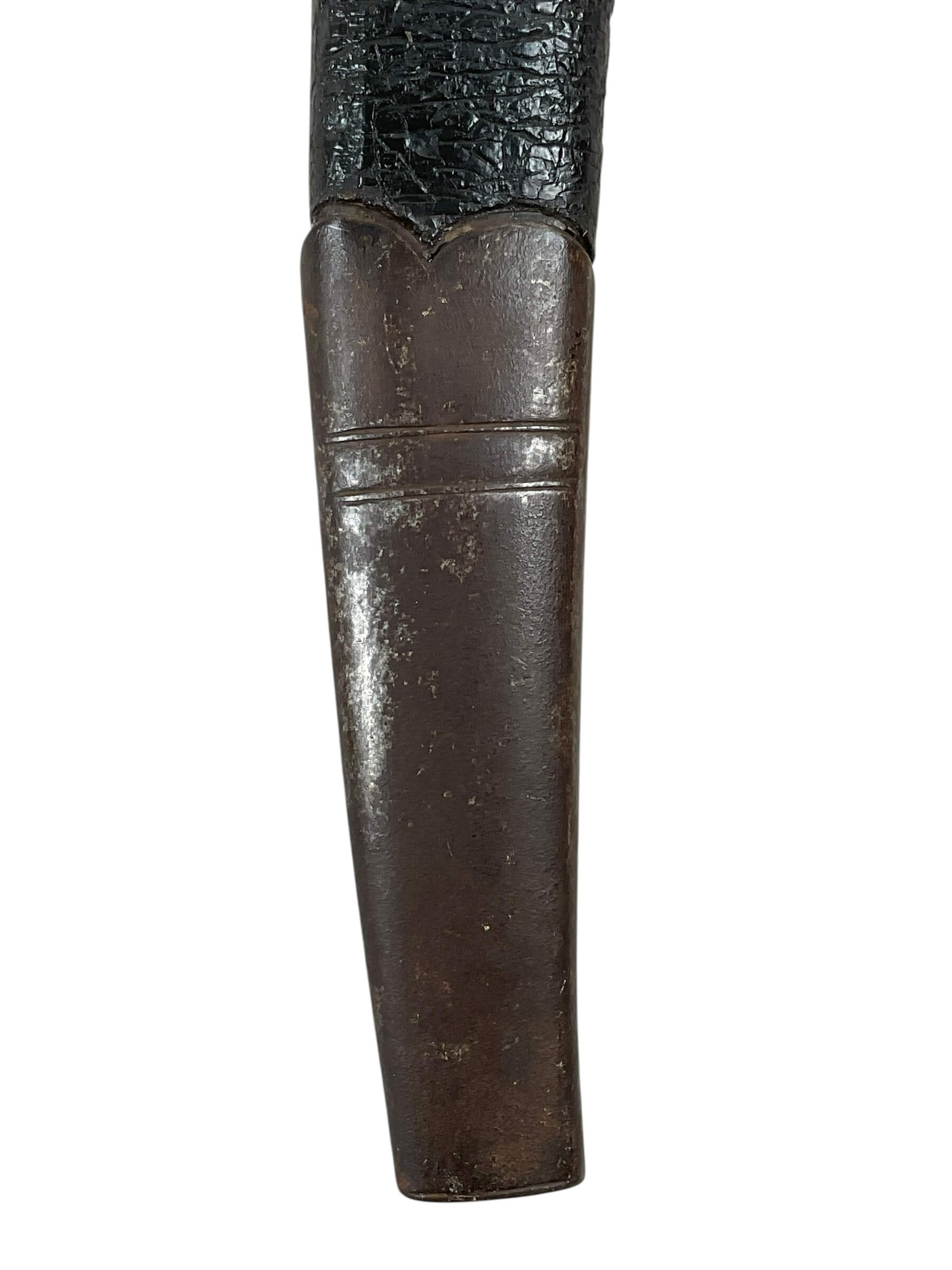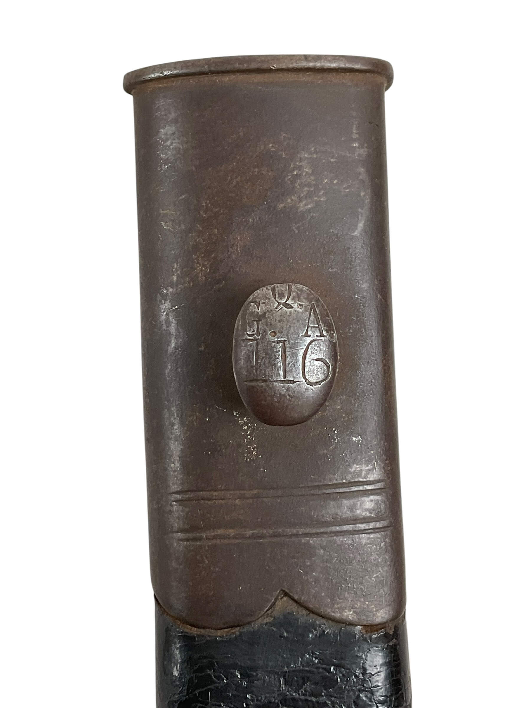 This antique piece, the ‘Canadian Quebec Garrison Artillery Sword Bayonet Yataghan With Scabbard,’ is a vital part of Canadian military history. It dates back to the late 19th century when the Quebec Garrison Artillery used it. This type of bayonet, known as a Yataghan, is famous for its distinctive recurved blade shape, resembling a reversed ‘S’. The blade is designed for fierce close combat, showcasing the military strategies of its time. This particular model comes with a scabbard, increasing its historical value. The scabbard has been meticulously preserved, reflecting the excellent craftsmanship of the era. This bayonet is not just a weapon, but a symbol of Canadian heritage and military history, making it a prized possession for collectors and history enthusiasts.