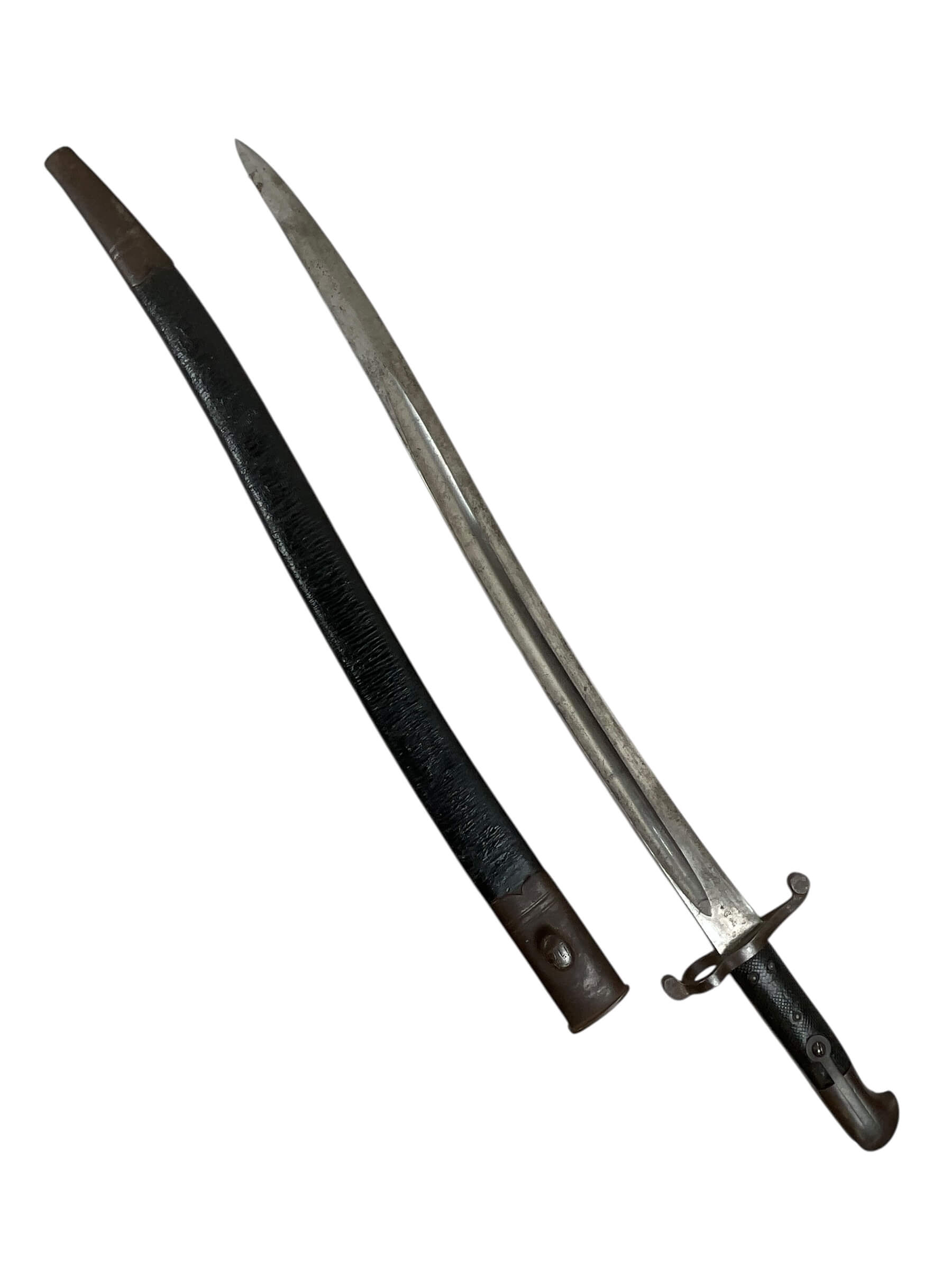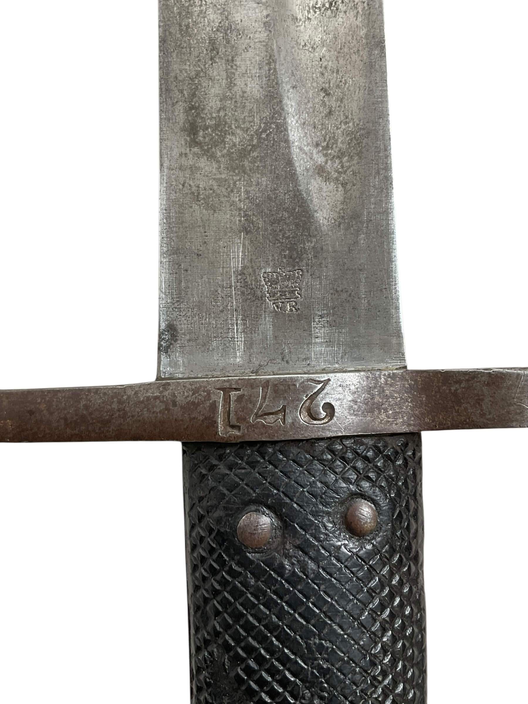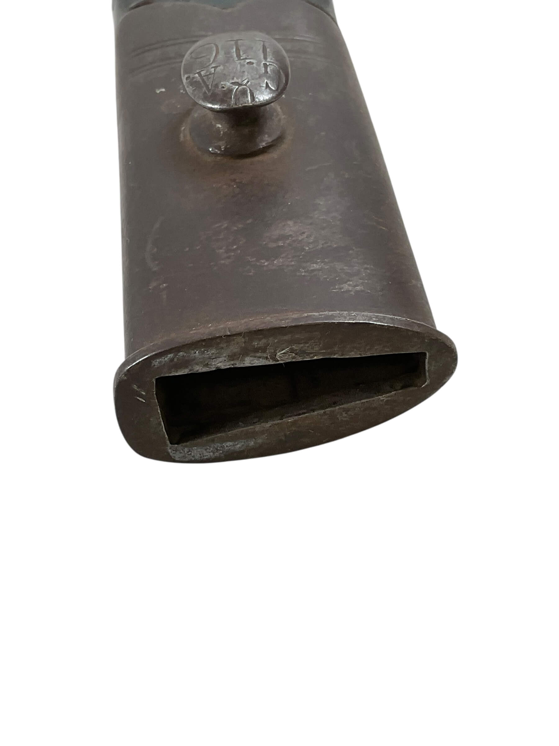 This antique piece, the ‘Canadian Quebec Garrison Artillery Sword Bayonet Yataghan With Scabbard,’ is a vital part of Canadian military history. It dates back to the late 19th century when the Quebec Garrison Artillery used it. This type of bayonet, known as a Yataghan, is famous for its distinctive recurved blade shape, resembling a reversed ‘S’. The blade is designed for fierce close combat, showcasing the military strategies of its time. This particular model comes with a scabbard, increasing its historical value. The scabbard has been meticulously preserved, reflecting the excellent craftsmanship of the era. This bayonet is not just a weapon, but a symbol of Canadian heritage and military history, making it a prized possession for collectors and history enthusiasts.