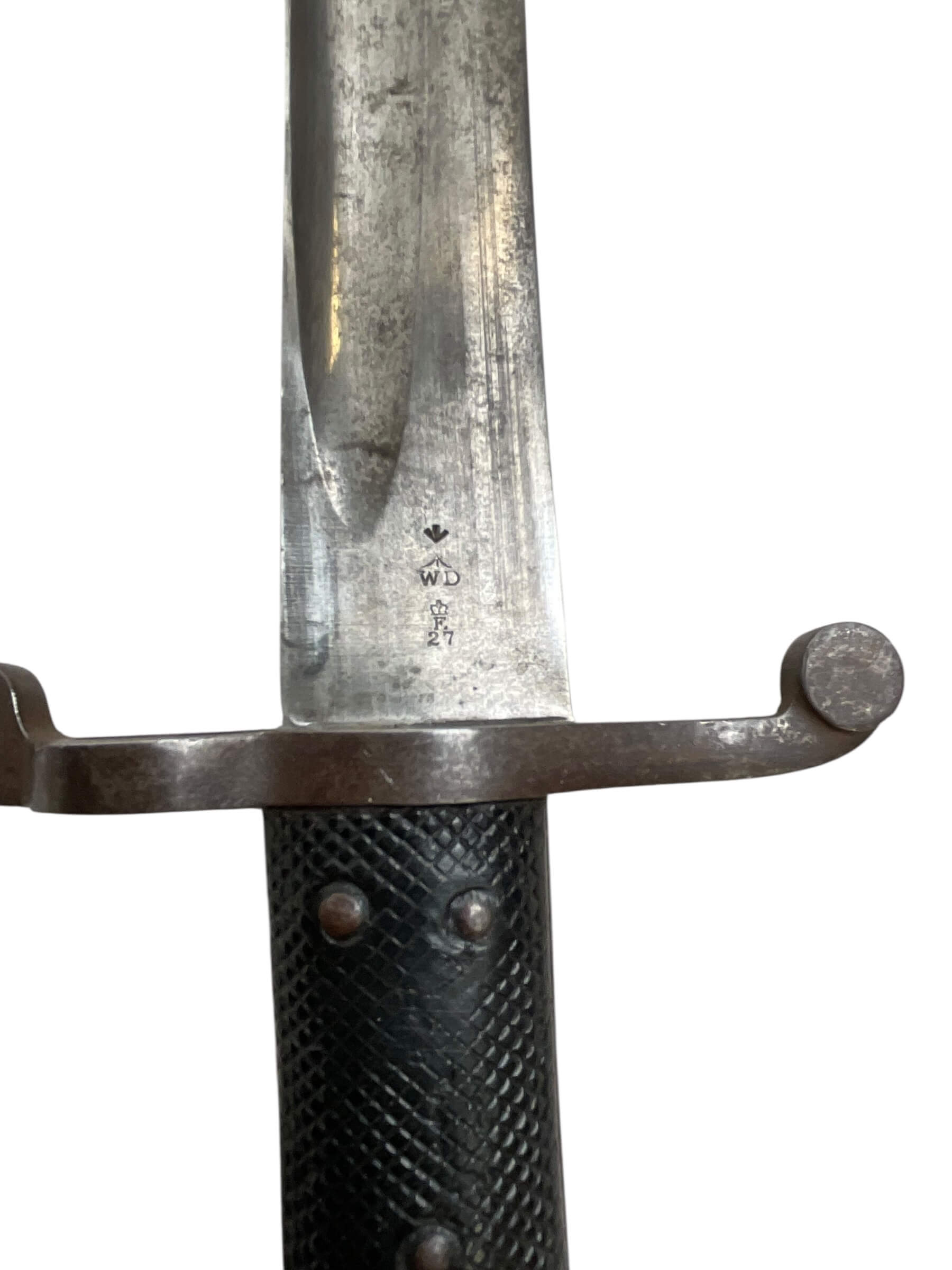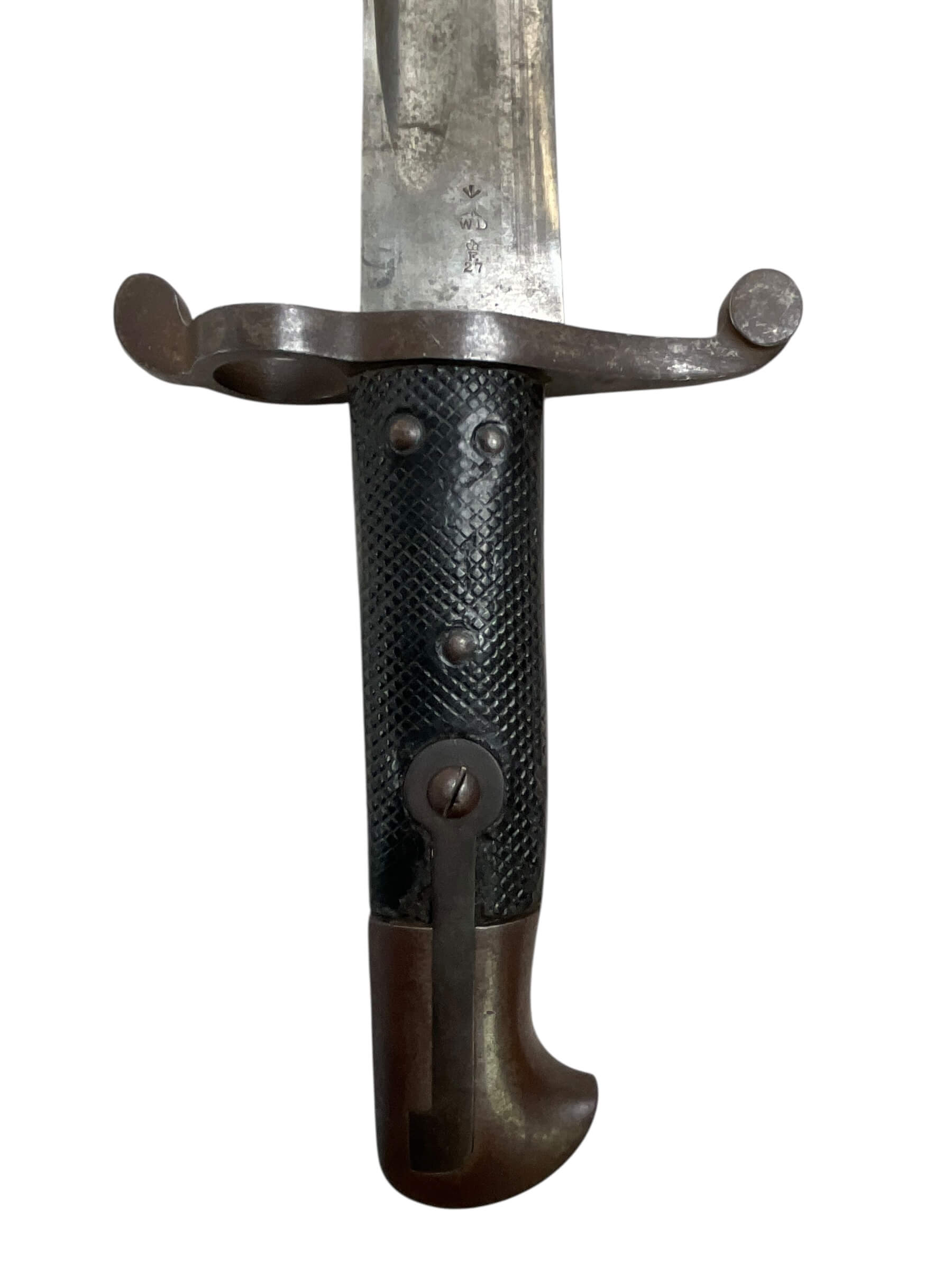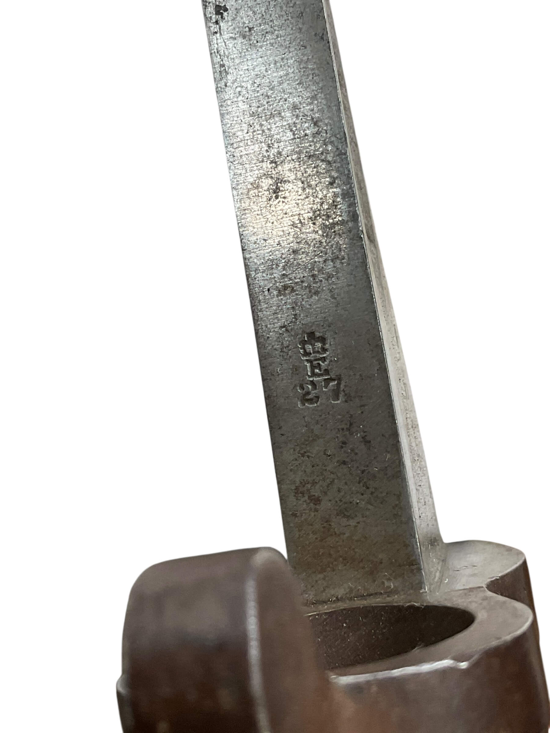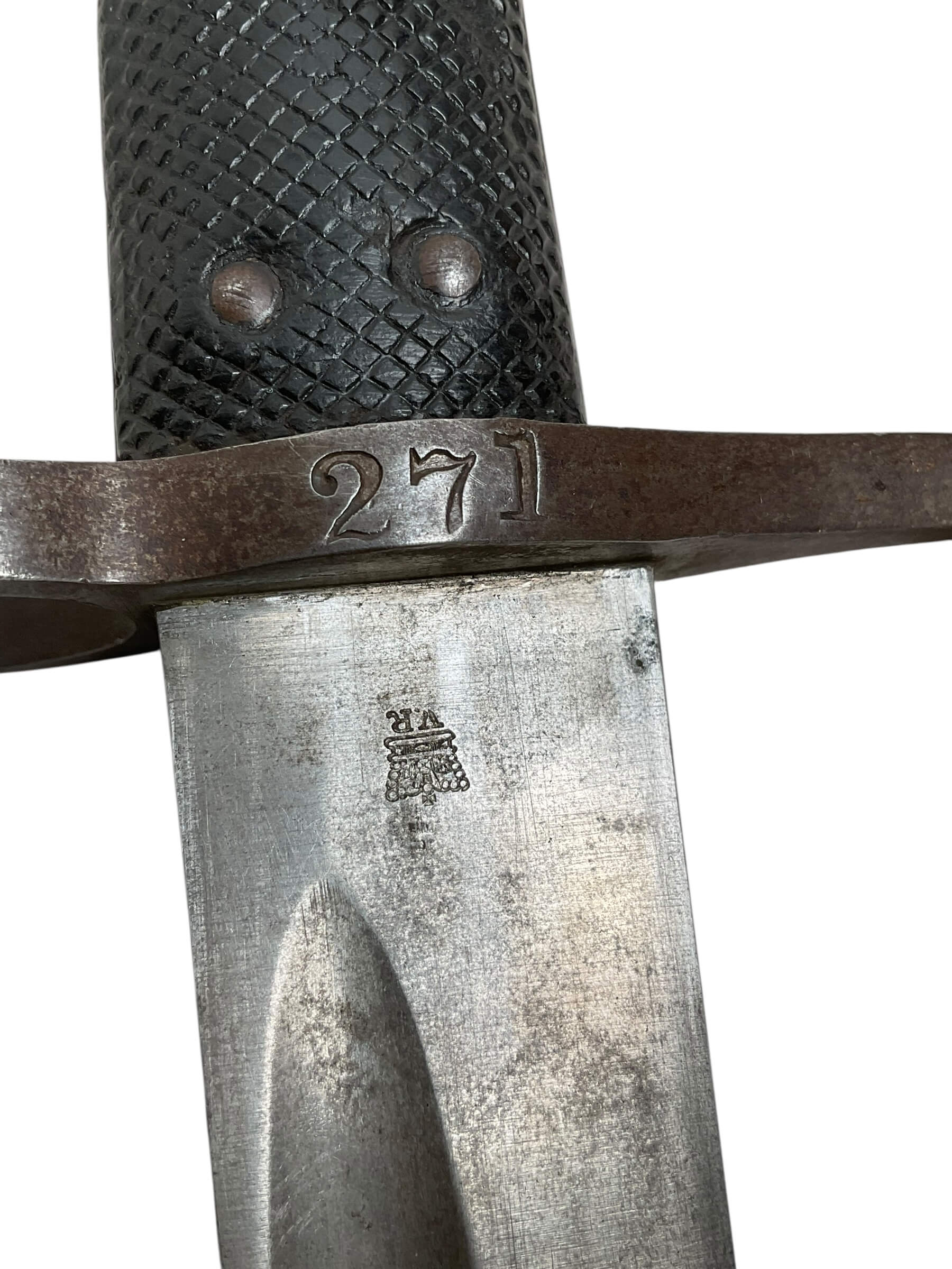 This antique piece, the ‘Canadian Quebec Garrison Artillery Sword Bayonet Yataghan With Scabbard,’ is a vital part of Canadian military history. It dates back to the late 19th century when the Quebec Garrison Artillery used it. This type of bayonet, known as a Yataghan, is famous for its distinctive recurved blade shape, resembling a reversed ‘S’. The blade is designed for fierce close combat, showcasing the military strategies of its time. This particular model comes with a scabbard, increasing its historical value. The scabbard has been meticulously preserved, reflecting the excellent craftsmanship of the era. This bayonet is not just a weapon, but a symbol of Canadian heritage and military history, making it a prized possession for collectors and history enthusiasts.