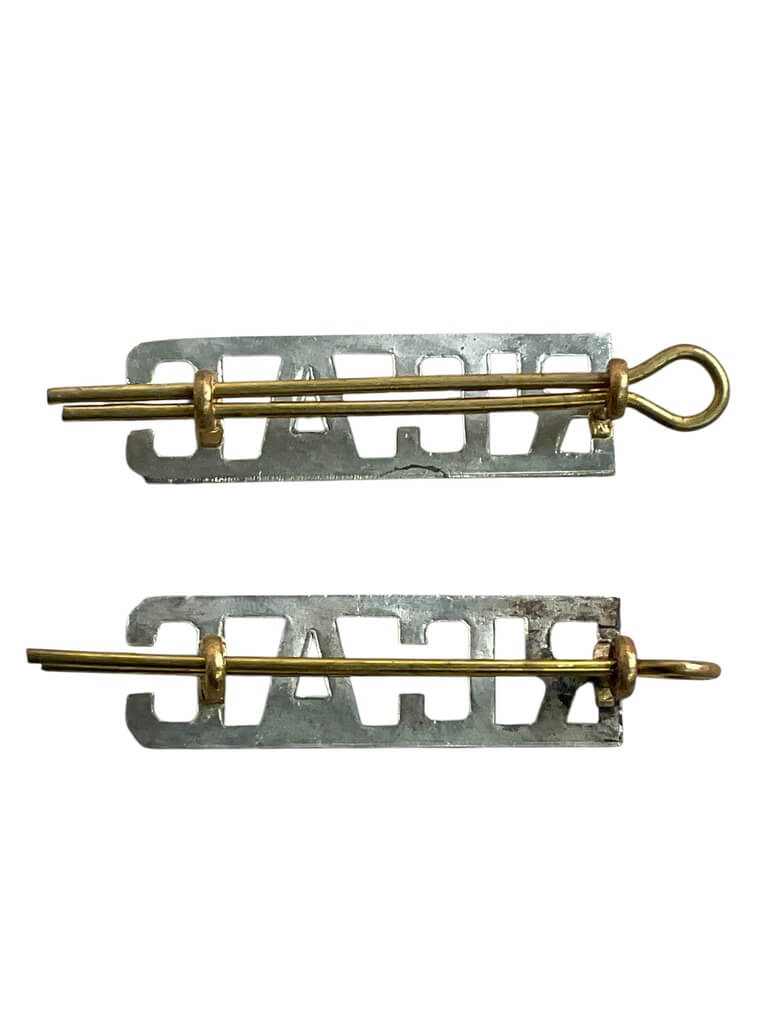The Canadian RCAC Armoured Corps Shoulder Titles Insignia Pair consists of two matching shoulder titles intended for members of the Royal Canadian Armoured Corps. Each insignia features the abbreviation “RCAC,” representing the corps responsible for armoured vehicle operations within the Canadian Army. Typically produced from brass or other durable metal and finished with a gilt or oxidized coating, these shoulder titles were worn on the upper sleeves of the service dress uniform to identify the wearer’s corps affiliation. The Royal Canadian Armoured Corps, established in 1940, played a significant role in mechanized warfare during the Second World War and beyond. Shoulder titles such as these were standard issue during the mid-20th century and continue to be recognized as important elements of Canadian military regalia. The insignia are often affixed using lugs and split pins or other period-appropriate fasteners. This pair is suitable for reference, display, or as an addition to collections focused on Canadian military history.