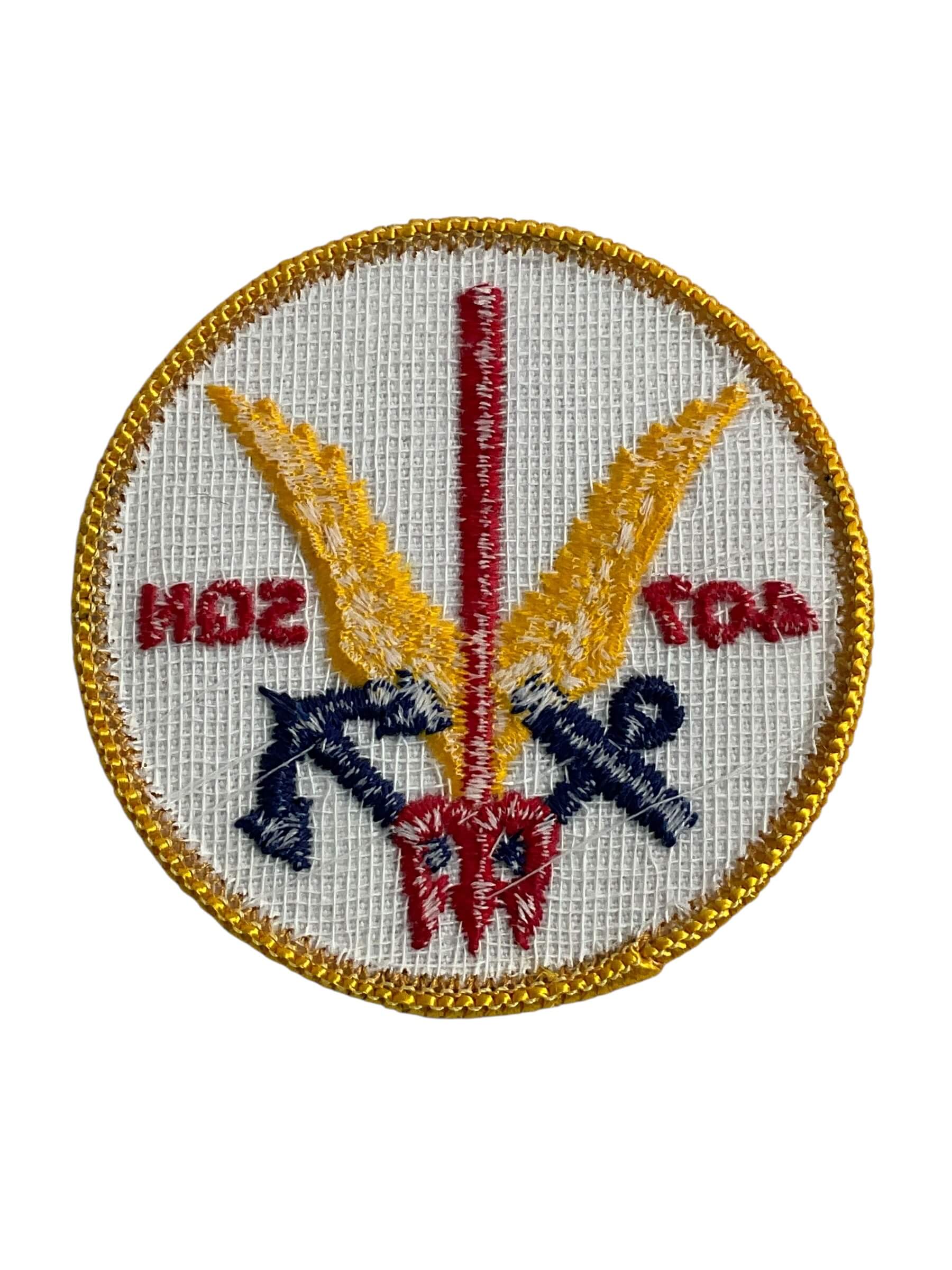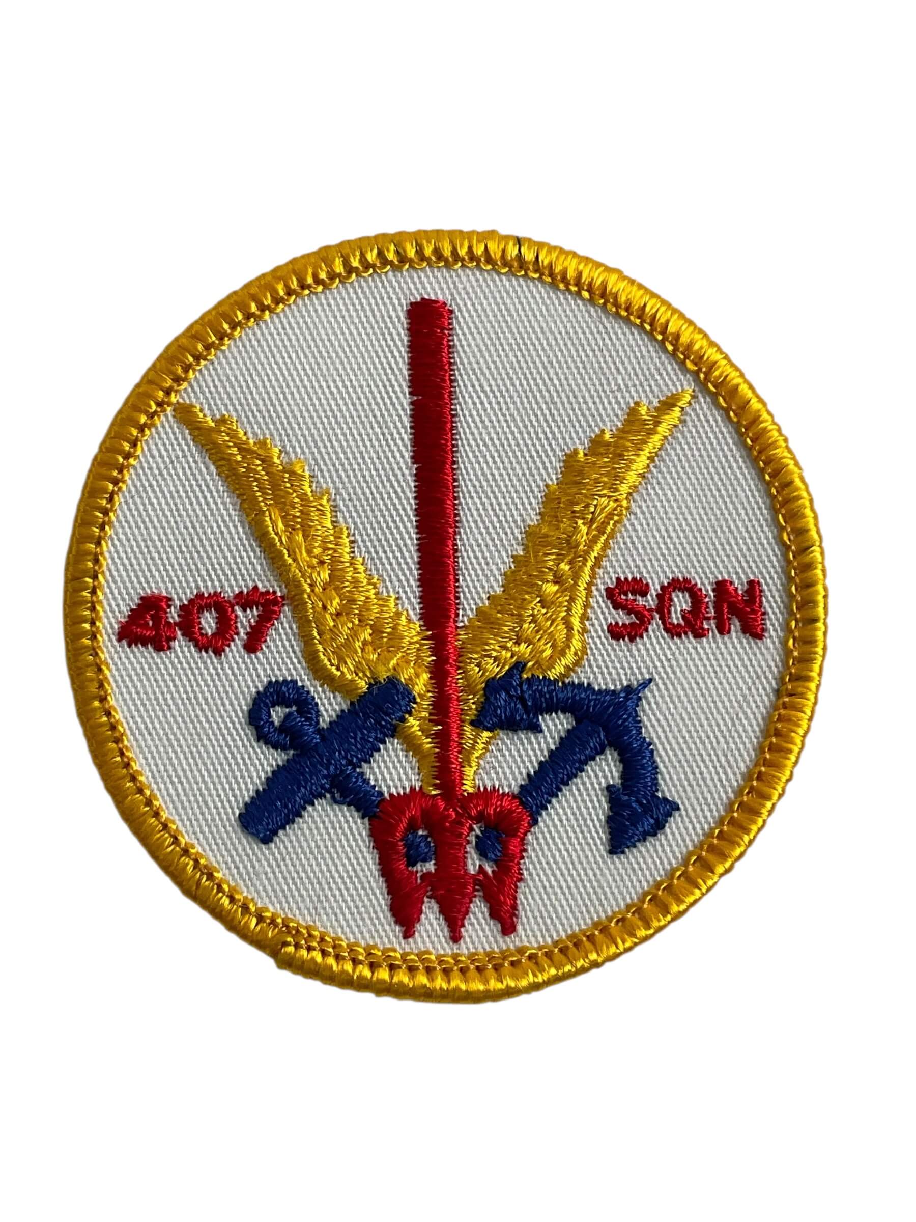 The Canadian RCAF 407 Squadron Gold Border Colour Crest Patch is an embroidered insignia representing the Royal Canadian Air Force’s 407 Squadron. This vintage patch features the squadron’s distinctive crest in full color, framed by a gold embroidered border. The design typically incorporates imagery and heraldic symbols associated with the 407 Squadron, a unit established during the Second World War. The squadron is known for