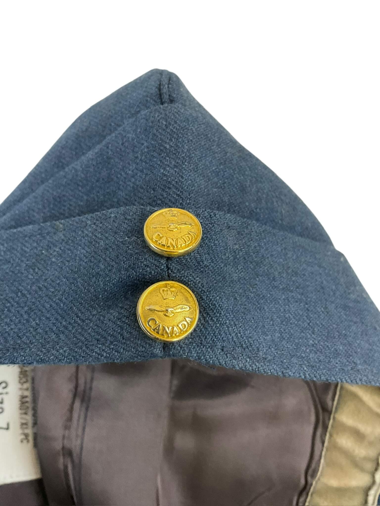 This listing features a Canadian RCAF (Royal Canadian Air Force) Administration Officers Wedge Cap and Insignia, Size 7. This authentic military cap is reminiscent of the rich history and valor of the Canadian Air Force. The cap is adorned with the official RCAF insignia, a symbol of honor and dignity. Crafted from premium materials, this wedge cap is not just a collectible but also a durable piece. The cap fits a size 7 head and has a comfortable inner lining for a snug fit. Its deep navy blue color, coupled with the gold-colored insignia, exudes a certain regality that is characteristic of the RCAF. Perfect for military enthusiasts, history buffs, or collectors of military memorabilia, this piece is a tangible piece of Canadian heritage.
