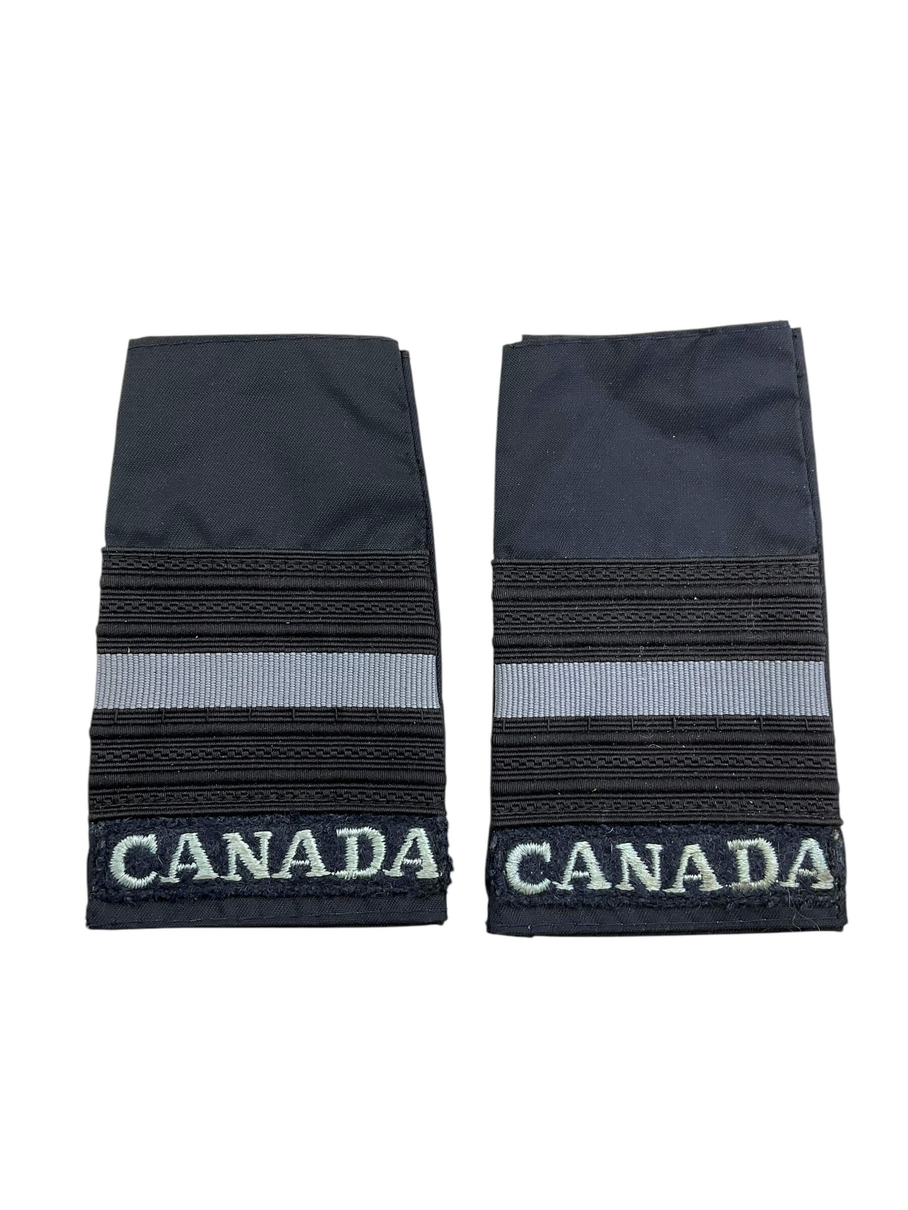 The ‘Canadian RCAF Air Commodore Raincoat Slip-On Rank Pair’ is a set of two insignias designed specifically for the Royal Canadian Air Force (RCAF) air commodores. These slip-on ranks, meant to be worn on a raincoat, exhibit high-quality craftsmanship and authentic design, reflecting the prestige of the RCAF. Made to withstand harsh weather conditions, they are both durable and waterproof. Each rank displays the emblematic insignia of an air commodore, symbolizing their high rank and distinguished service. They are easy to attach and remove, making them a convenient accessory for any air commodore’s uniform. Ideal for collectors, military enthusiasts, or active service members, these Canadian RCAF Air Commodore Raincoat Slip-On ranks are a testament to Canadian military history and honor.