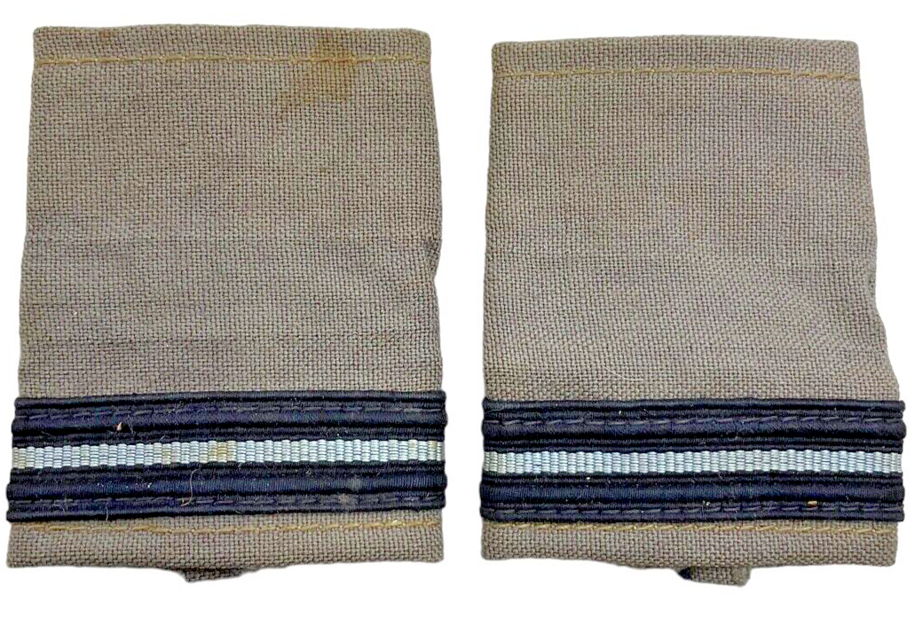 These Canadian RCAF Flying Officer Shoulder Boards are a pair of vintage uniform accessories designed for the Royal Canadian Air Force. Crafted from tropical worsted (TW) wool, these shoulder boards are ideal for warm climates, ensuring comfort and durability. The boards feature distinct insignia and rank stripes denoting the rank of Flying Officer, symbolizing a significant level of responsibility and service within the Air Force. Their elegant design reflects a balance of functionality and formality, making them a desirable piece for collectors of military memorabilia or historians. The quality craftsmanship and historical value make these shoulder boards a notable addition to any collection, offering a tangible connection to Canada’s aviation heritage. Whether on display or preserved as a part of a broader collection, these shoulder boards serve as a tribute to the dedication and professionalism of the RCAF Flying Officers.