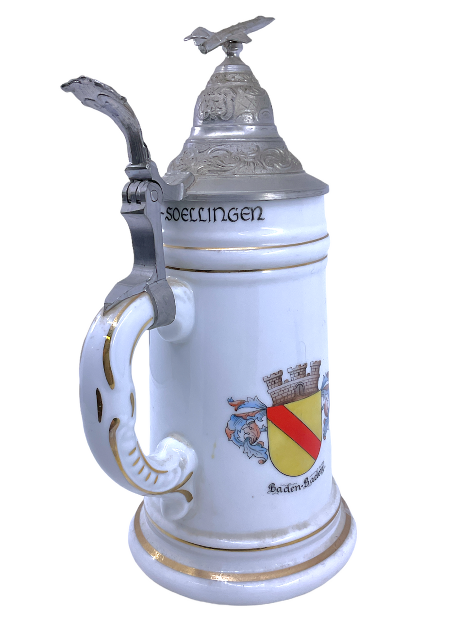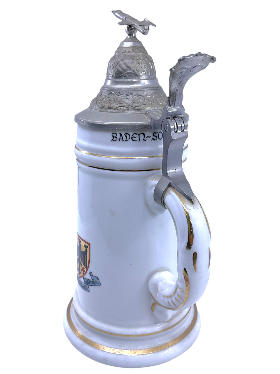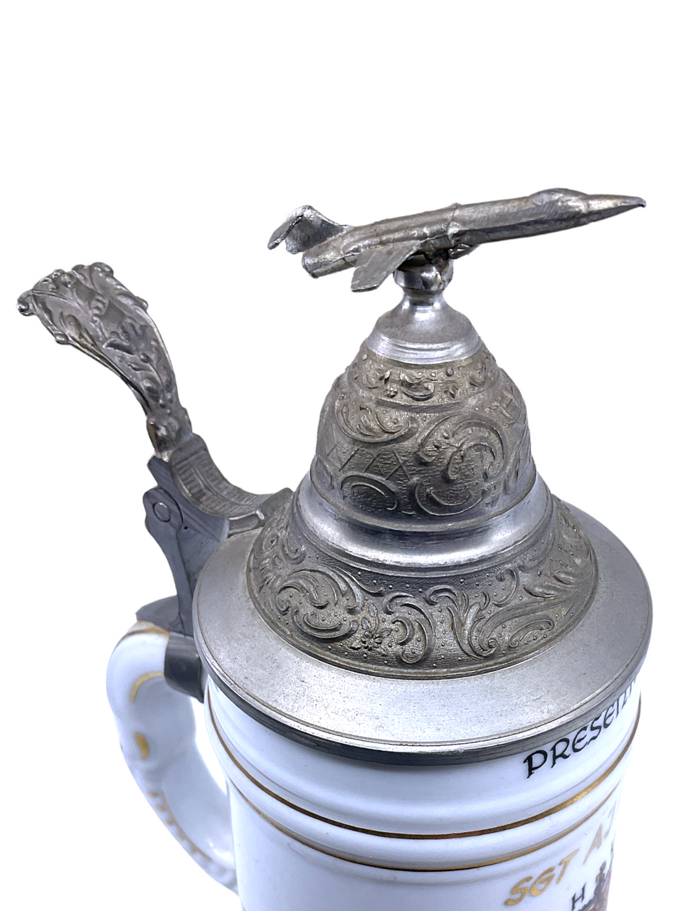 Canadian RCAF No 4 Wing HQ Sgt Neal Presented Tankard CF-5 Fighter Top Nude Base, 9.5 Inches tall.