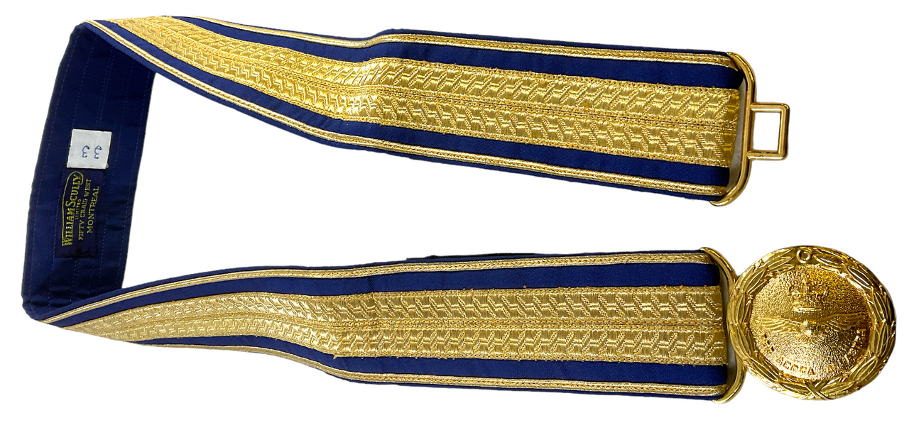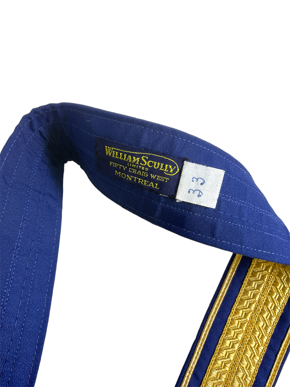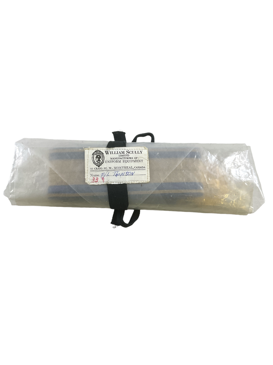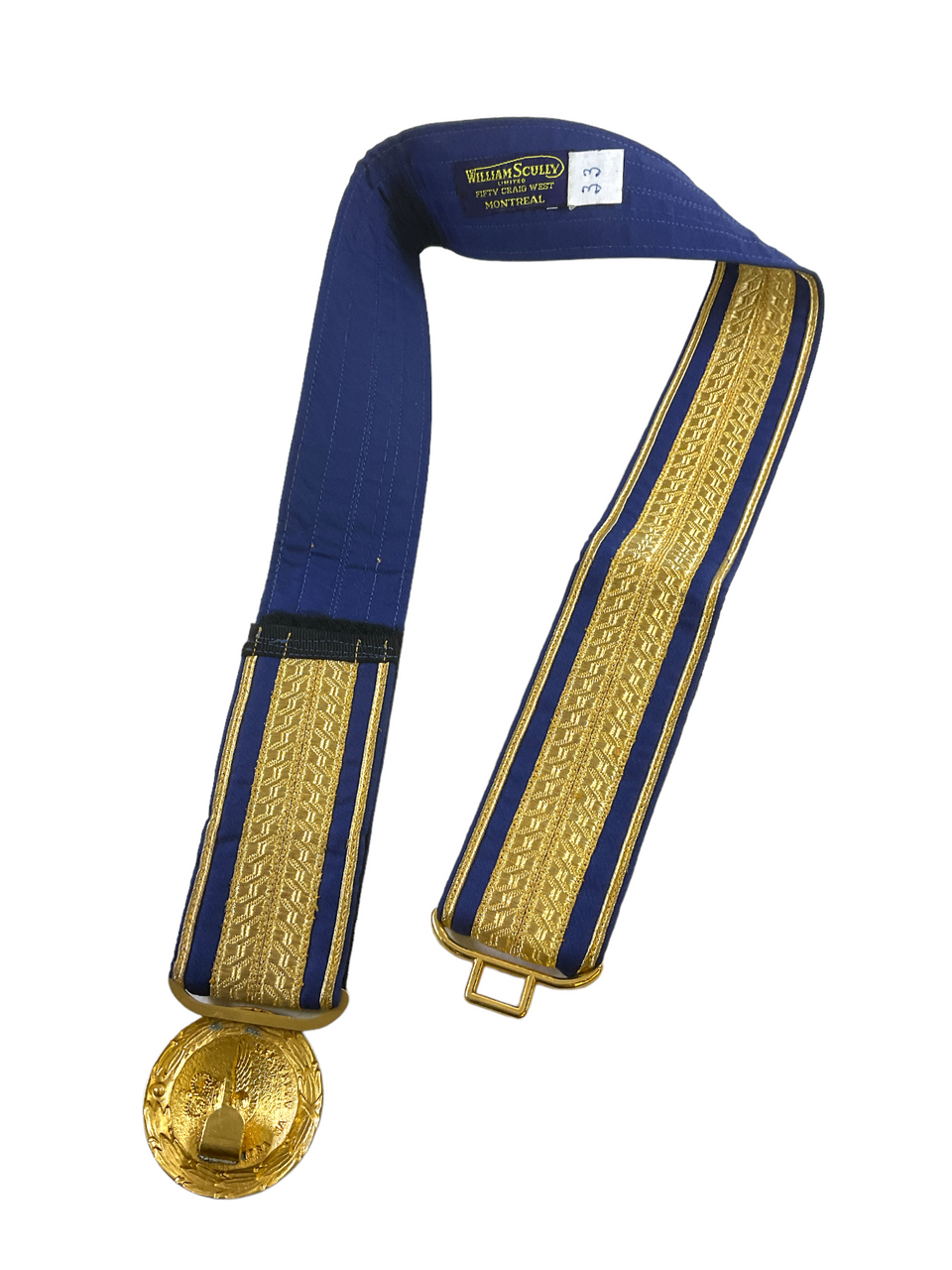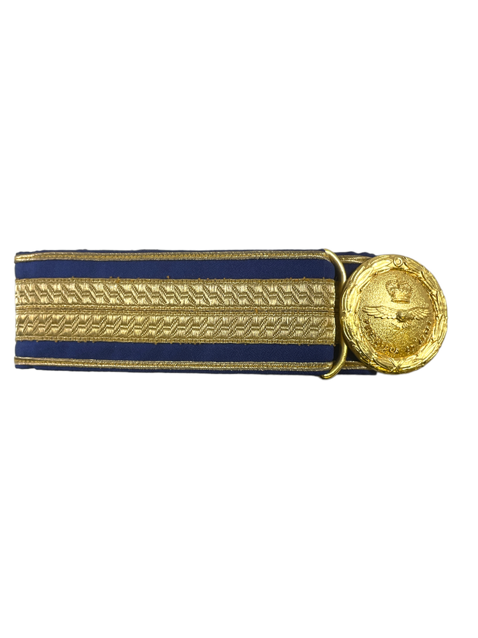 This listing features a distinguished Canadian RCAF Officers Dress Belt coupled with a gilt buckle, meticulously crafted by the renowned Scully Montreal Maker. This elegant dress belt is a testament to the heritage and tradition of the Royal Canadian Air Force (RCAF), embodying both functionality and style. The belt itself is made from high-quality materials ensuring durability and a sleek appearance, suitable for ceremonial occasions or formal events. The accompanying gilt buckle shines with a lustrous finish and showcases meticulous detailing, reflecting the prestige of the service and the craftsmanship of Scully Montreal. Whether you are a collector of military memorabilia or an individual who appreciates finely made accessories, this dress belt and buckle set is a remarkable piece of history and sophistication.