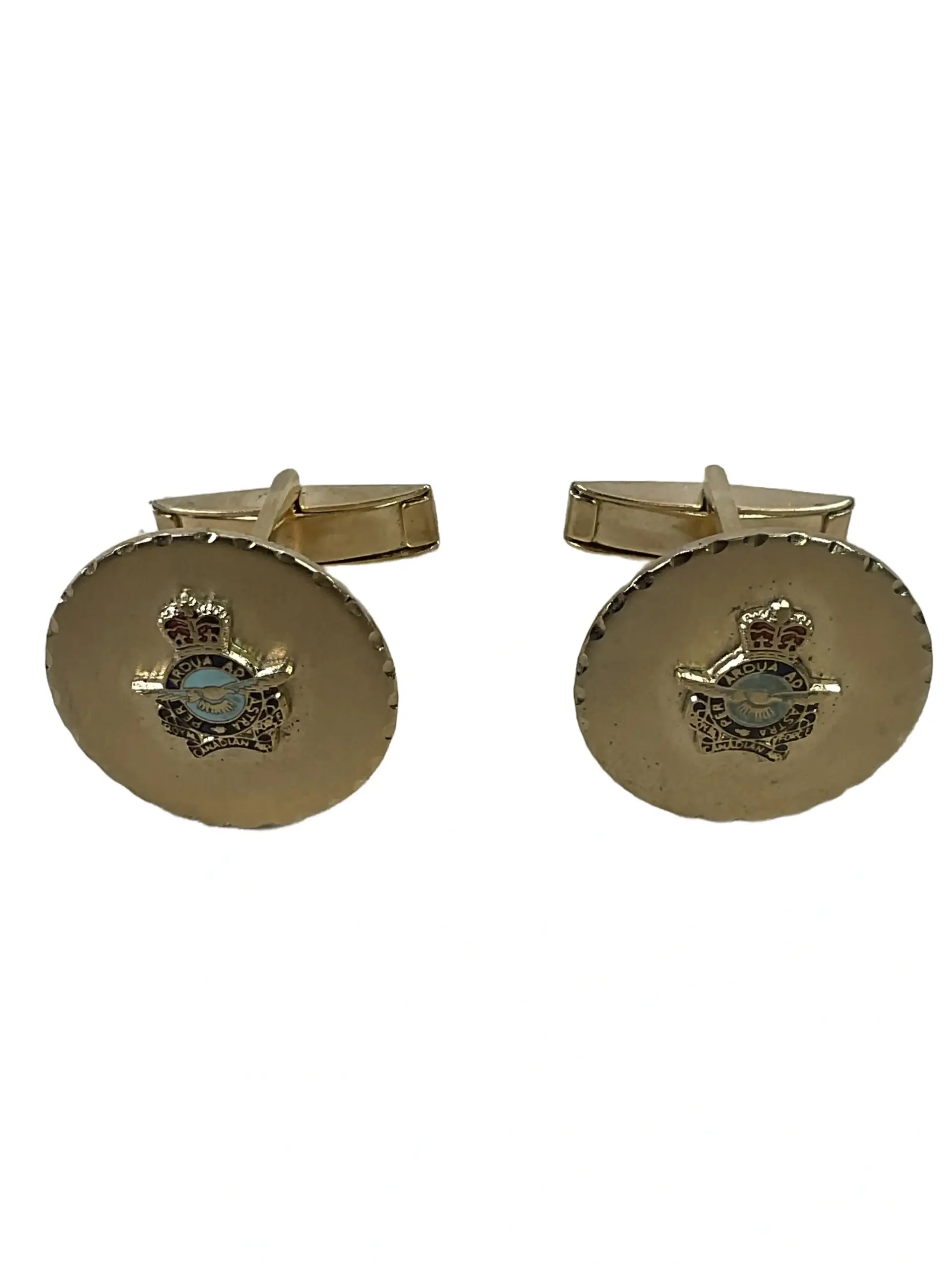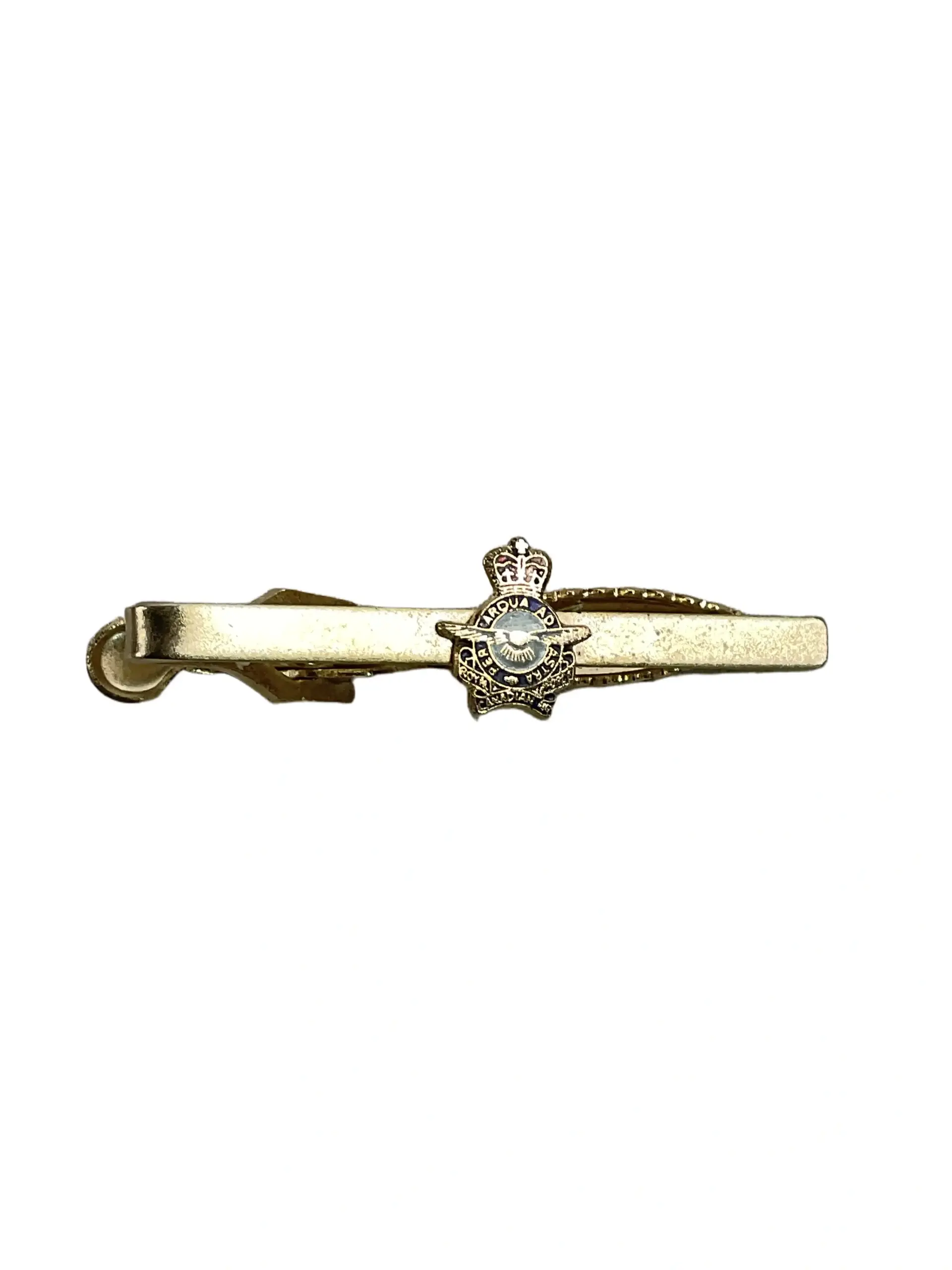 The Canadian RCAF Tie Tack and Cufflinks Set in Case is a collectible item associated with the Royal Canadian Air Force. The set includes one tie tack and a pair of cufflinks, each featuring the RCAF insignia, which typically consists of a crown, eagle, and laurel wreath. The pieces are constructed from metal, with a gilt or gold-tone finish, and display enamel details representing the authentic colors of the insignia. The set is housed in a fitted presentation case designed for secure storage and display. Items such as this were often issued or purchased for formal dress occasions, mess dress, or as commemorative items for members of the RCAF. The tie tack and cufflinks serve as symbols of service and affiliation with the Canadian air force, and are of interest to collectors of military memorabilia, particularly those specializing in air force or Canadian military artifacts.