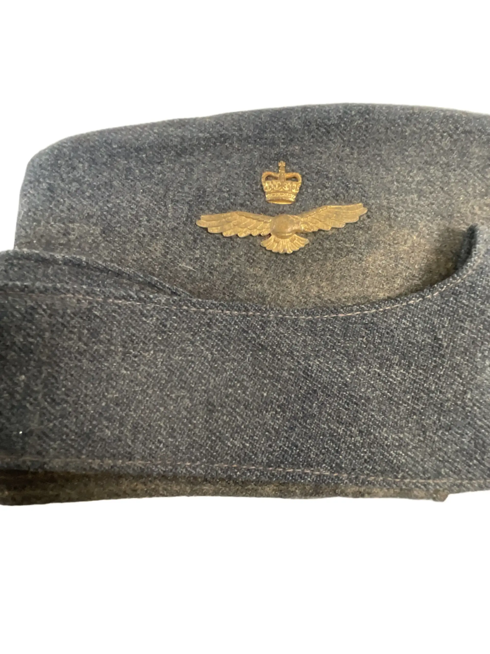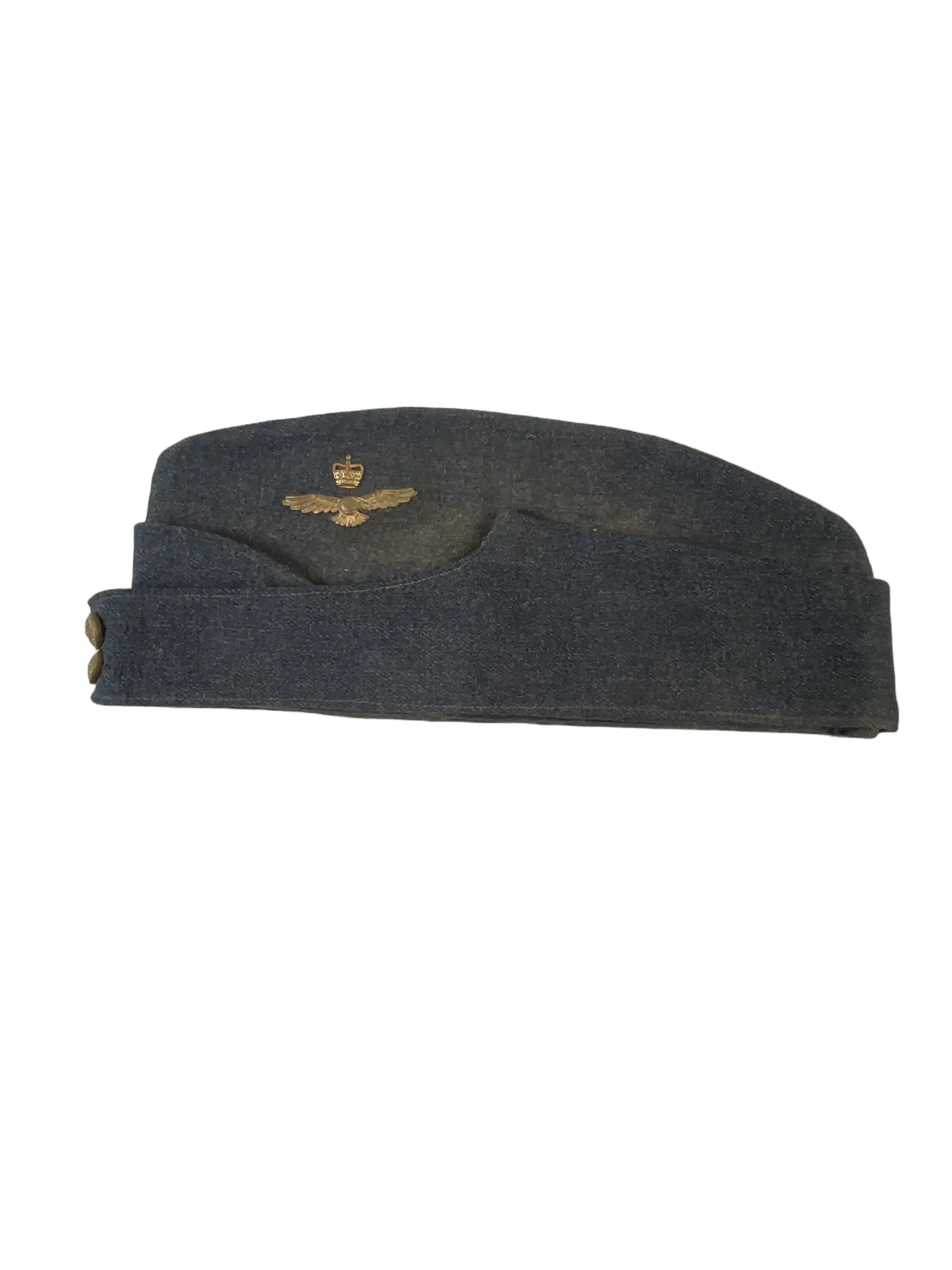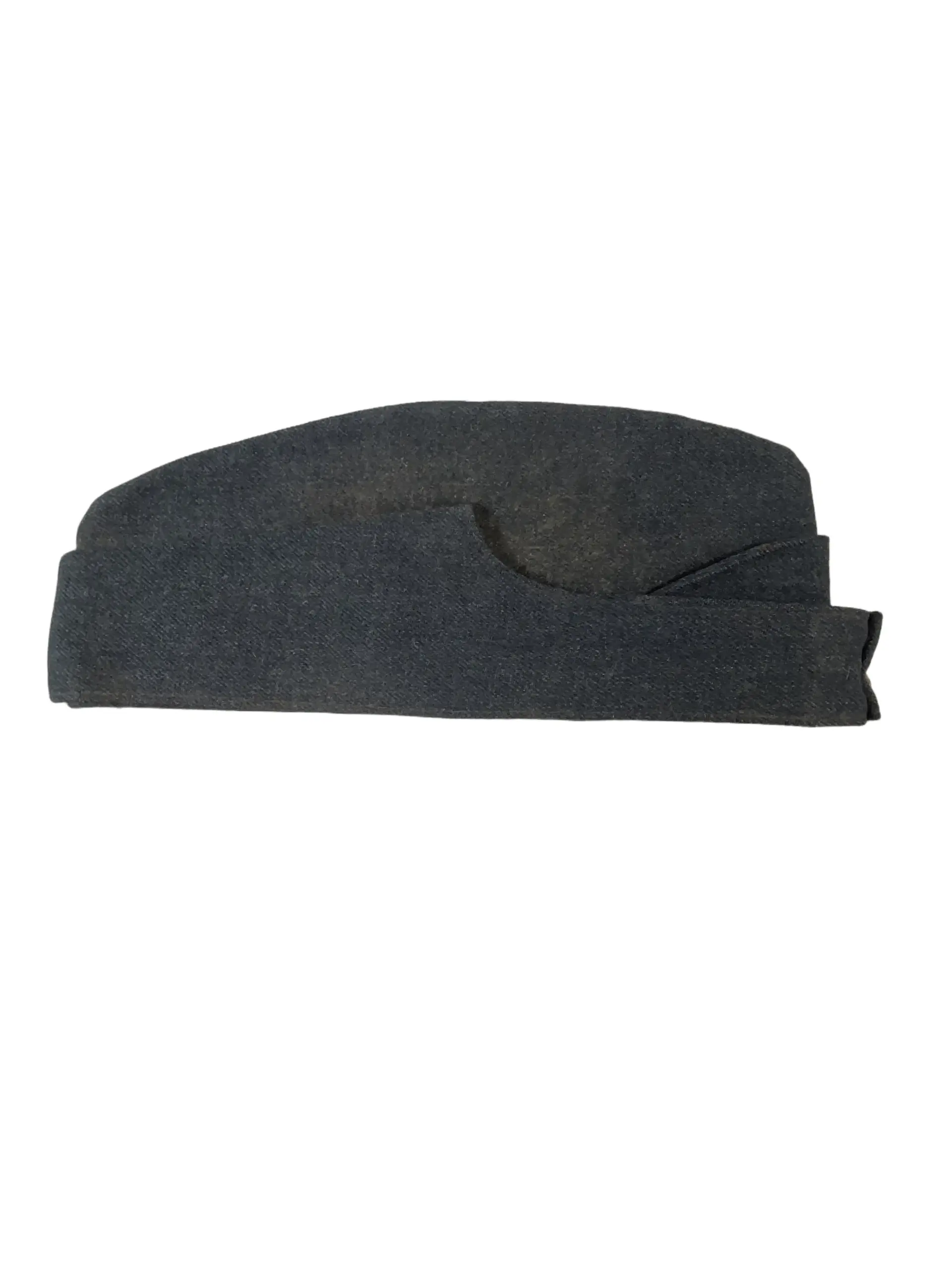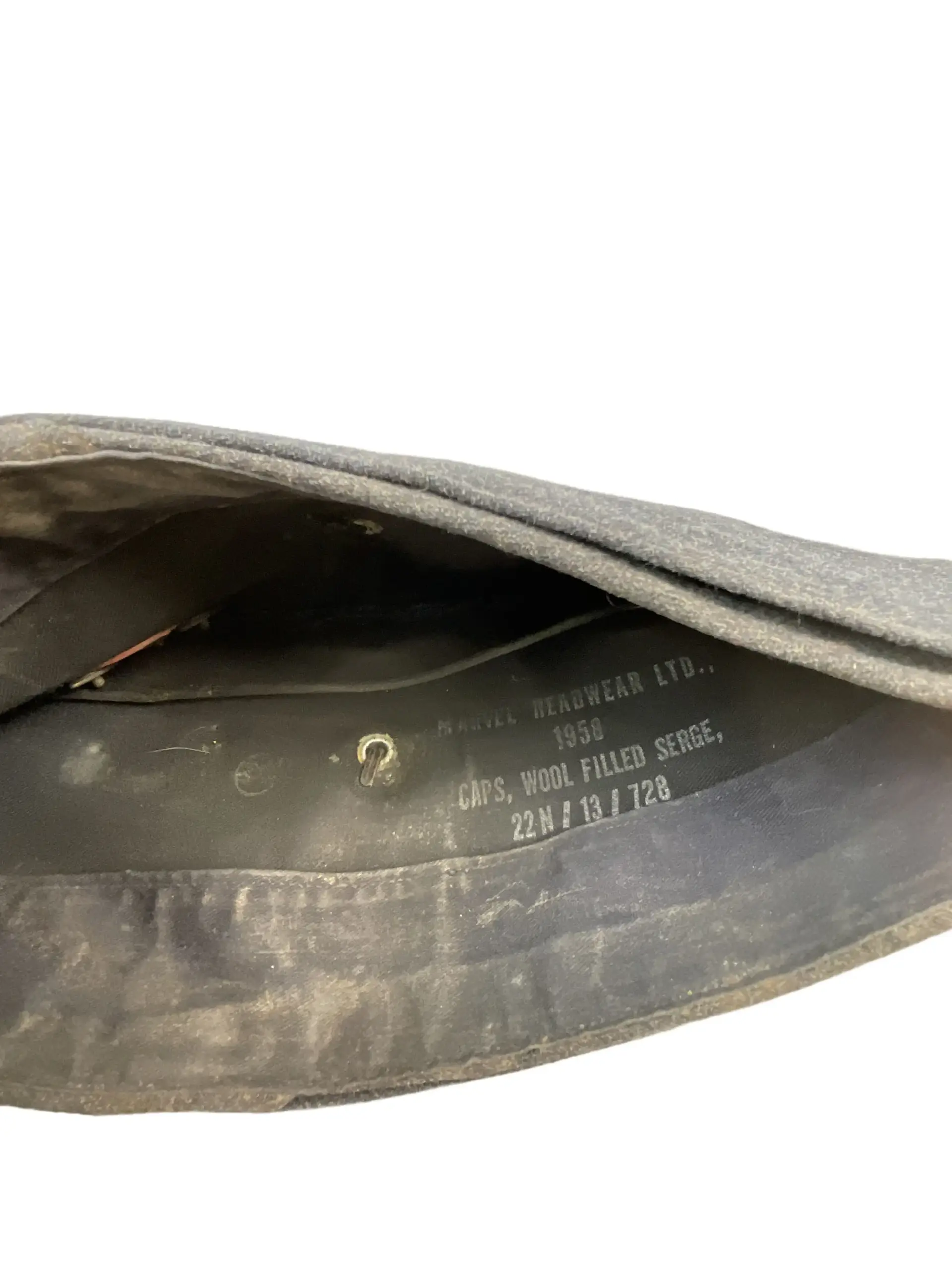 The Canadian RCAF Wedge Cap dated 1958, size 7, is a standard-issue headgear item used by members of the Royal Canadian Air Force during the mid-20th century. This cap, identifiable by its distinctive wedge shape, was commonly worn as part of the RCAF service dress uniform. Constructed from blue wool blend material, the cap features a fold-over design with cloth piping along the edges. The front bears a slit suitable for affixing a cap badge, which is not included with this item. The interior is lined for comfort and displays the manufacturer’s markings, date of issue (1958), and size (7). Wedge caps of this era reflect the uniform standards of the Canadian military prior to the force unification in the late 1960s. Such items are of interest to collectors and historians studying Canadian military attire and RCAF service during the post-World War II period, offering insight into mid-century uniform regulations and daily wear.