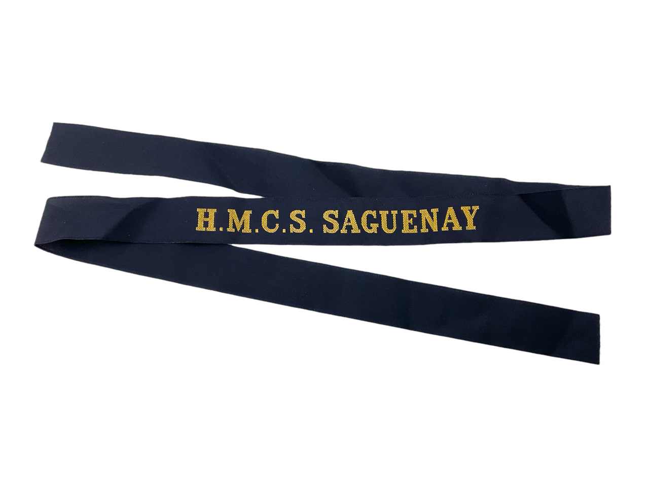 The Canadian RCN Navy HMCS Saguenay Full Length Cap Tally is a classic and significant piece of naval memorabilia. This cap tally originates from the HMCS Saguenay, a distinguished vessel in the Royal Canadian Navy. Made from high-quality material, the cap tally features the ship’s name prominently in gold lettering, adding a touch of elegance and historical authenticity. Measuring the full length traditionally used on naval caps, this navy blue ribbon symbolizes honor and pride, making it an ideal collector’s item for enthusiasts of military history and naval artifacts. Whether framed for display or added to a collection of naval memorabilia, the HMCS Saguenay cap tally stands as a tribute to the valor and dedication of the Canadian sailors who served aboard this renowned ship. A must-have for collectors and history buffs alike, it commemorates an important piece of Canada’s naval heritage.