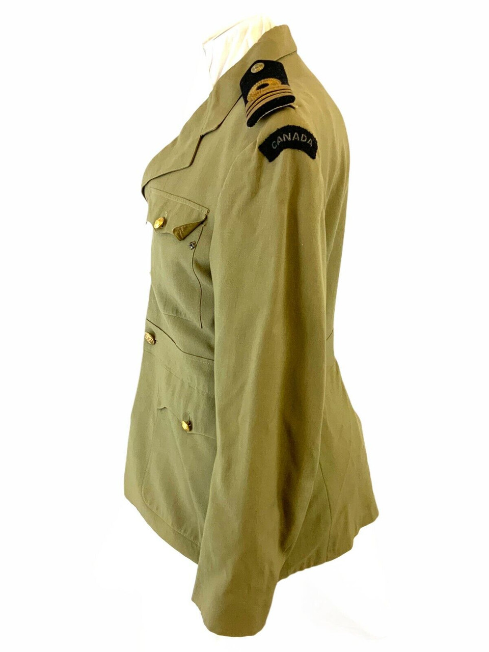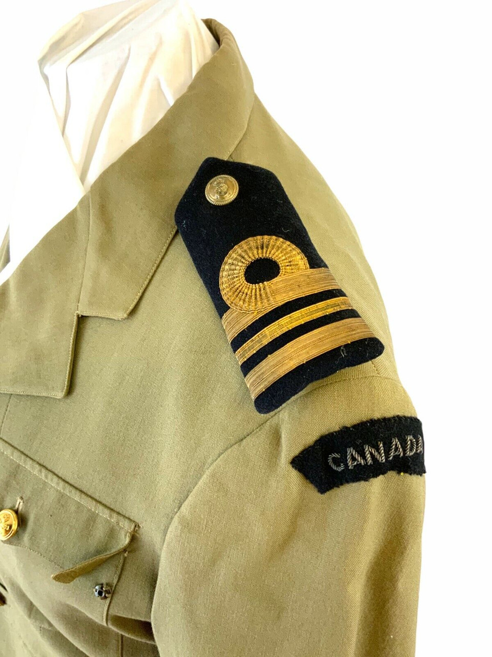 This historical piece is a Canadian Royal Canadian Navy (RCN) Officers Tropical Worsted Jacket, dated 1955 and marked as size 5. Crafted for naval personnel operating in warmer climates, this jacket symbolizes Canada’s maritime heritage during the mid-20th century. Made from lightweight, breathable worsted wool, the jacket is designed for comfort and durability in tropical conditions. Its classic design includes sharp tailoring, naval insignia, and button details that reflect the rank and prestige of RCN officers. Whether you are a military memorabilia collector, a history enthusiast, or a vintage fashion aficionado, this jacket offers a unique glimpse into the naval uniforms of the 1950s. Its excellent craftsmanship and historical value make it an exceptional addition to any collection, capturing a moment in time when Canada’s naval forces played crucial roles on the global stage.