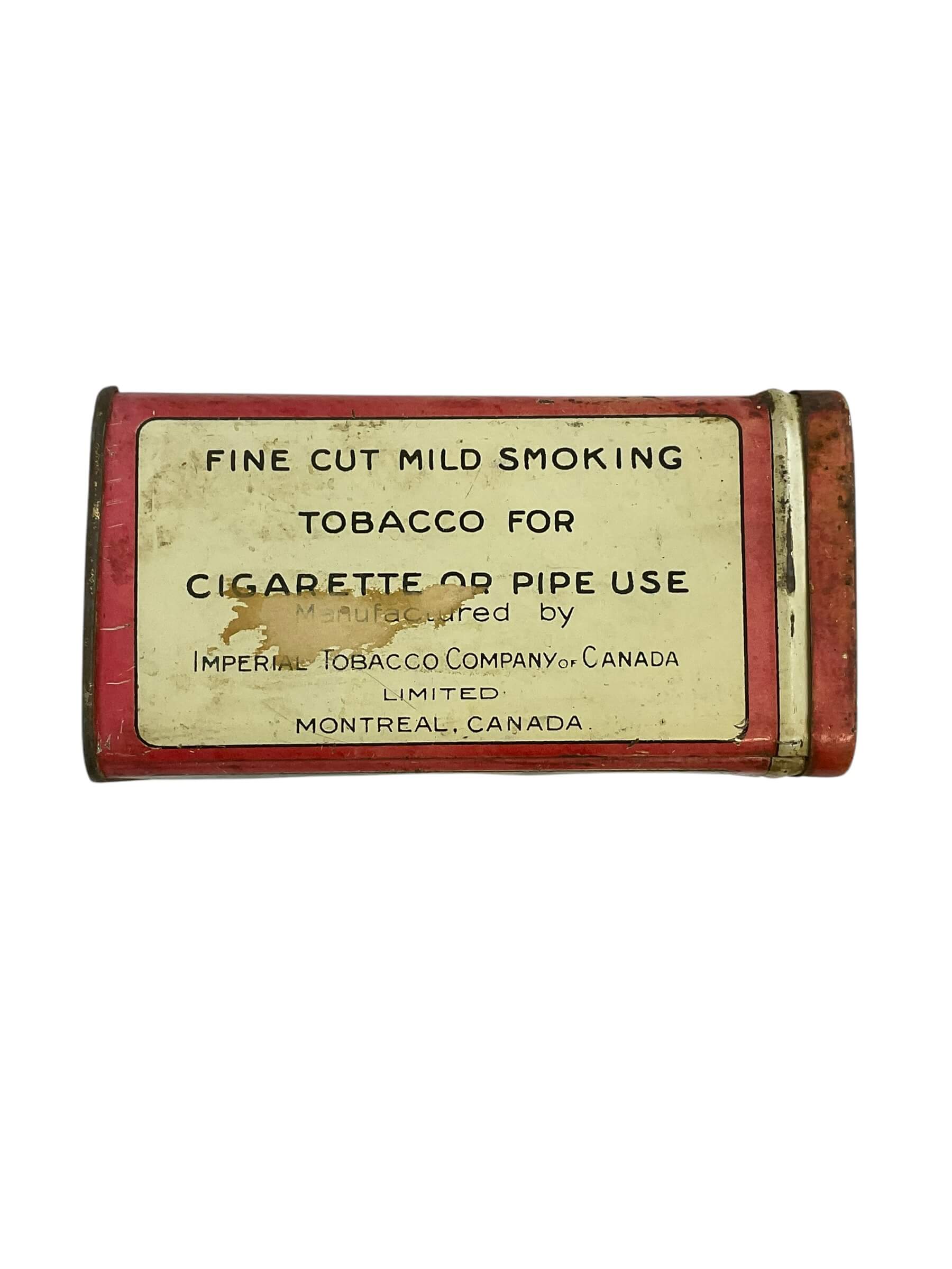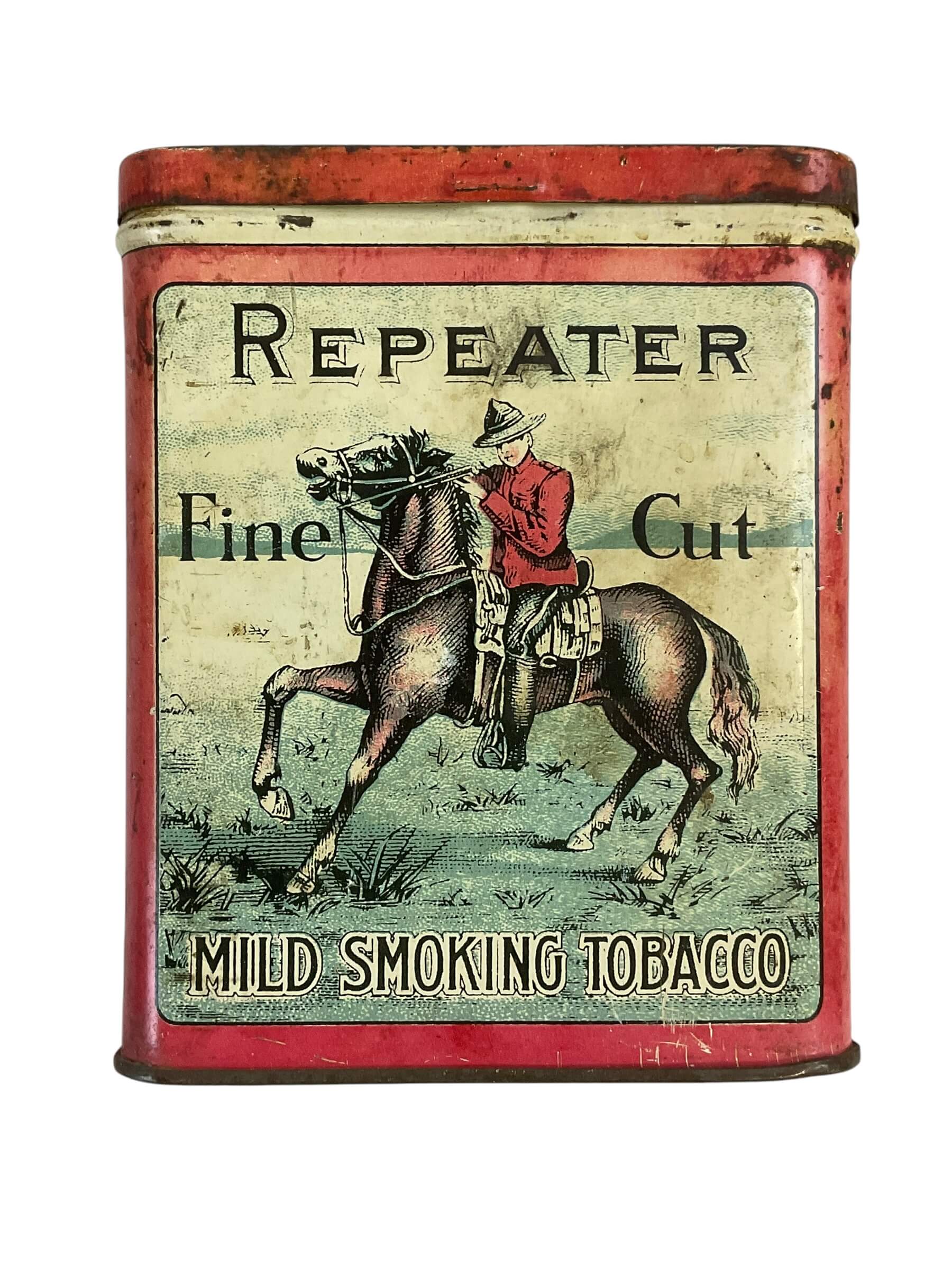This product is a classic Canadian Repeater Tobacco Tin featuring the iconic Mounted Police design. This large, empty tin, once home to the finest quality tobacco, is now a unique piece of Canadian history and a perfect collectible for enthusiasts. With its vibrant colors and detailed graphics of the celebrated Royal Canadian Mounted Police, this tin exudes a vintage charm that is hard to resist. It measures significant dimensions, making it a perfect decorative piece or a nostalgic storage solution. Please note that the tin is empty, and its original purpose as a tobacco container is part of its historical charm. This Canadian Repeater Tobacco Tin is not just a container; it’s a journey into Canada’s past.
