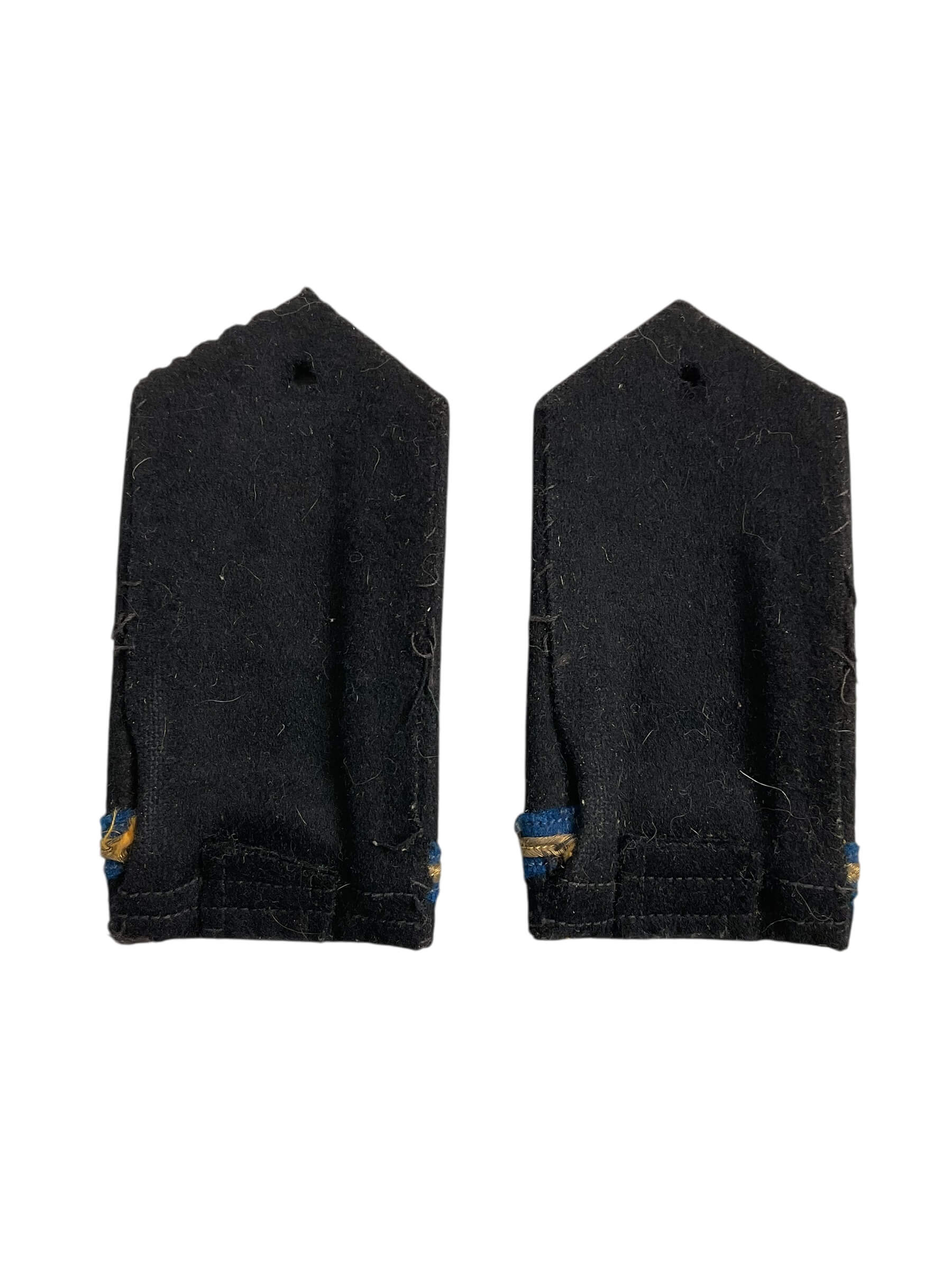 The Canadian Steamship Lines Junior Officers Shoulder Boards Insignia Pair 1 is a set of uniform accessories used to denote the rank of junior officers within Canadian Steamship Lines (CSL), a prominent commercial shipping company based in Canada. This pair consists of two matching shoulder boards, each featuring a black base fabric with gold-colored braid and a single stripe, corresponding to the rank structure followed by the company