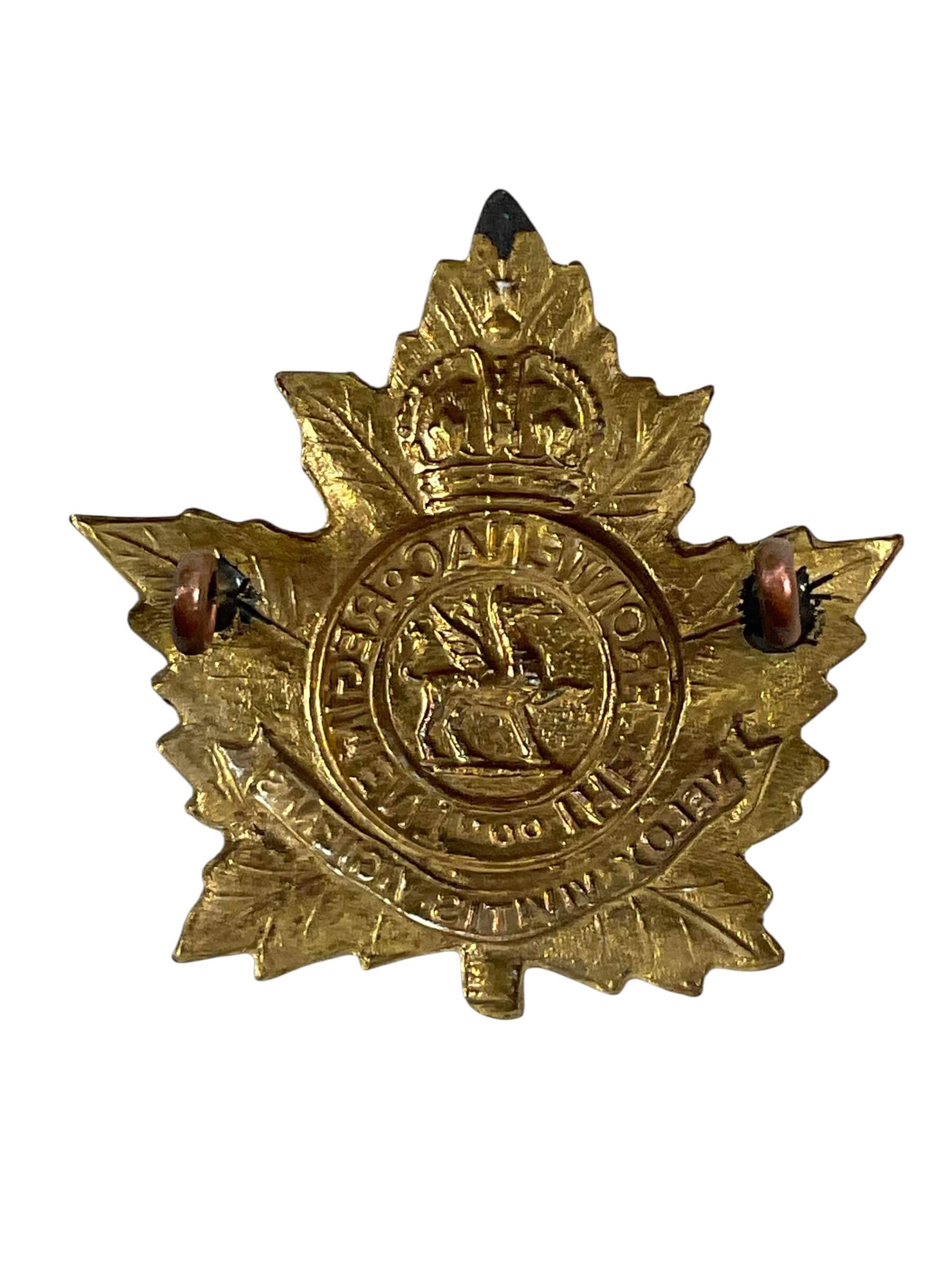 The Canadian The Frontenac Regiment Cap Badge is a military insignia associated with The Frontenac Regiment, a now-disbanded infantry unit of the Canadian Army. The regiment was originally established in Kingston, Ontario, and served as part of Canada’s Non-Permanent Active Militia throughout the early to mid-20th century, before being converted to an armoured role and eventually amalgamated into other units. The cap badge typically features a stylized maple leaf, a key Canadian symbol, with the regiment’s name inscribed across a central scroll. Additional elements may include a crown and regimental motto, reflecting Commonwealth military traditions. Made from brass or similar metal alloys, badges such as this one would have been worn on the headdress by members of the regiment to denote unit affiliation. The badge represents the history and identity of The Frontenac Regiment within Canada’s military heritage. This item is of interest to military history collectors and researchers.