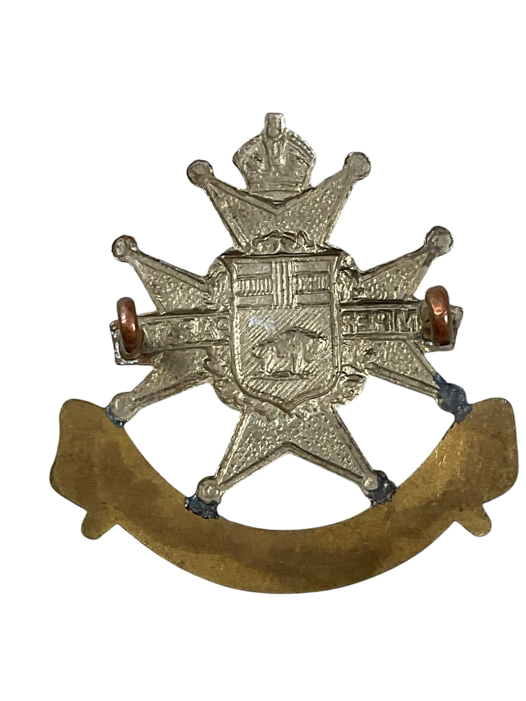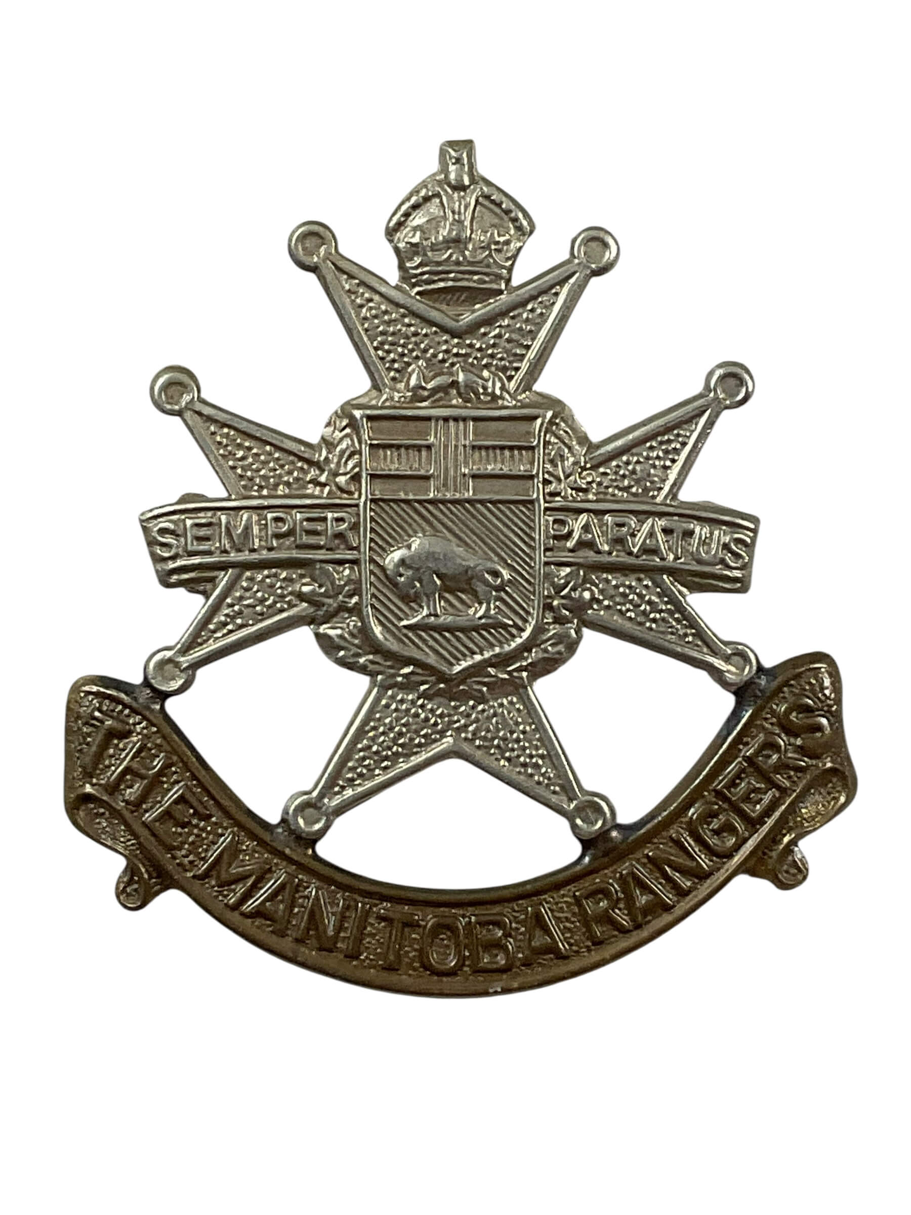 The Manitoba Rangers Cap Badge is a military insignia associated with the Manitoba Rangers, a regiment of the Canadian Militia. This cap badge dates to the early 20th century and would have been worn by members of the unit on their service dress headgear. It typically features a maple leaf design, symbolizing Canada, with the regimental title “The Manitoba Rangers” incorporated into the badge’s center. Produced in brass or bronze, the badge demonstrates detailed die-stamped construction, with attachment lugs or a slider on the reverse for securing to a cap. The Manitoba Rangers joined the Canadian Militia order of precedence in 1908 and played a role in local defense and the provision of volunteers for the Canadian Expeditionary Force during the First World War. Items such as this cap badge represent a tangible connection to Canada’s military history and the regional regiments that contributed to national defense during the first half of the twentieth century.