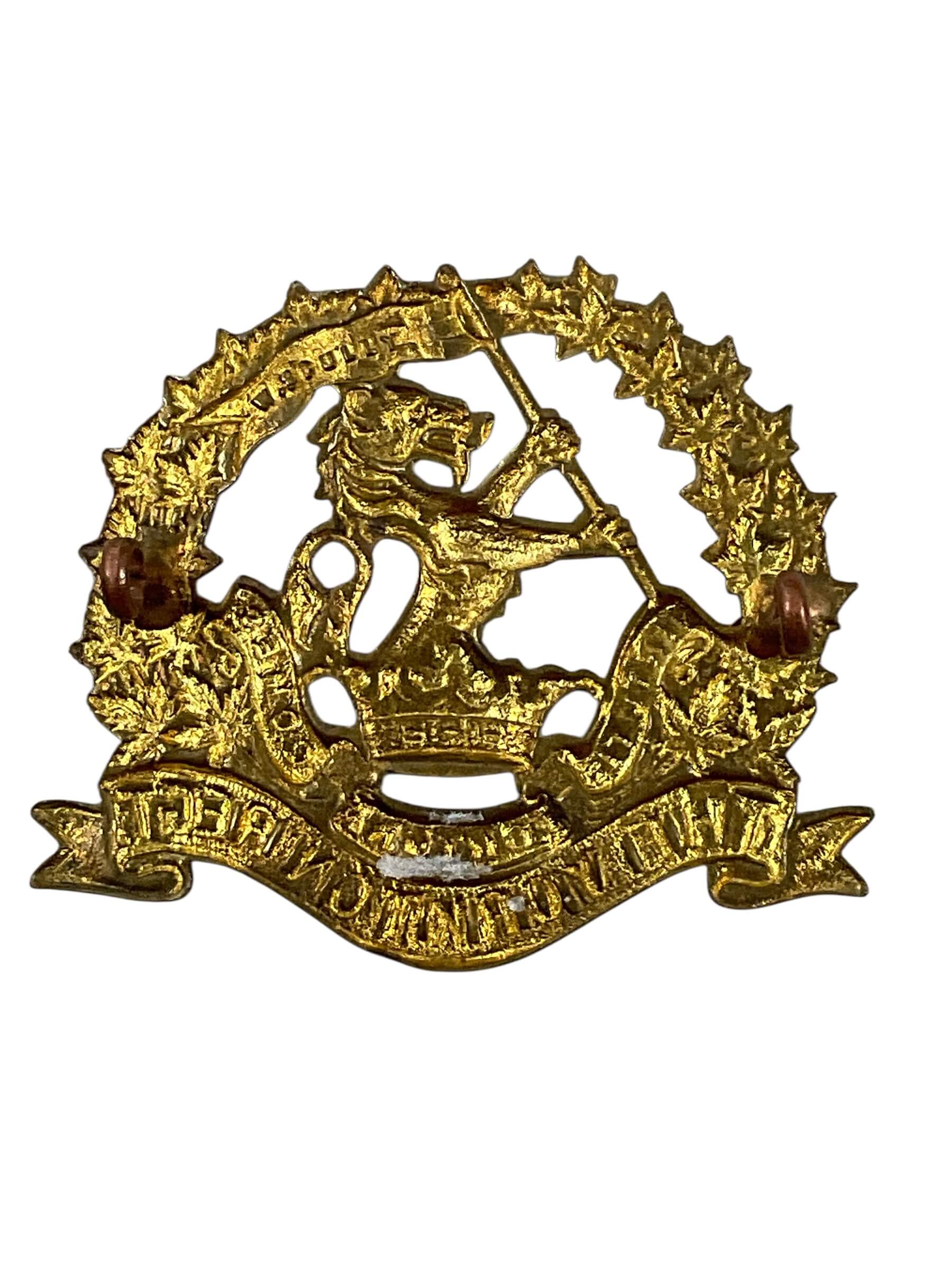 The Canadian The Yorkton Regiment Cap Badge is a metal insignia representing The Yorkton Regiment, an infantry regiment of the Canadian Militia active from 1920 to 1936. The badge typically features a stylized maple leaf surmounted by a king’s crown, with a central scroll inscribed “The Yorkton Regiment.” The design reflects traditional elements of Canadian military heraldry, signifying the regiment’s geographical and national identity. The Yorkton Regiment was based in Yorkton, Saskatchewan, and contributed personnel during the early twentieth century as part of the Non-Permanent Active Militia. In 1936, the regiment was amalgamated with The Regina Rifle Regiment, and its distinctive insignia was discontinued. Cap badges such as this were worn on military headdress to denote regimental affiliation and are now sought after by collectors of Canadian militaria for their historic representation of interwar Canadian infantry units. This example is typical of the period in design and construction.