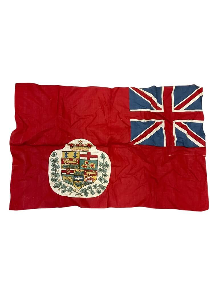 The Canadian Victorian Cotton Printed Flag measures 22 inches by 32 inches and features a design used during the late 19th century when Canada was a part of the British Empire. This flag is constructed from cotton, with the printed motif typical of the period preceding the adoption of Canada’s modern national flag in 1965. The design usually displays the British Union Jack in the canton and the Canadian Red Ensign with the shields of the provinces in the fly, reflecting Canada’s status within the Commonwealth. Flags like this were commonly employed for official events, parades, and patriotic displays. The dimensions of 22 by 32 inches indicate it was suited for indoor display or attachment to smaller flagpoles. Cotton flags from this era are notable for their lightweight material and the use of printed rather than sewn elements, a practice that became prevalent with advances in textile printing technologies. This item provides a representative example of period flags used in Canadian contexts.